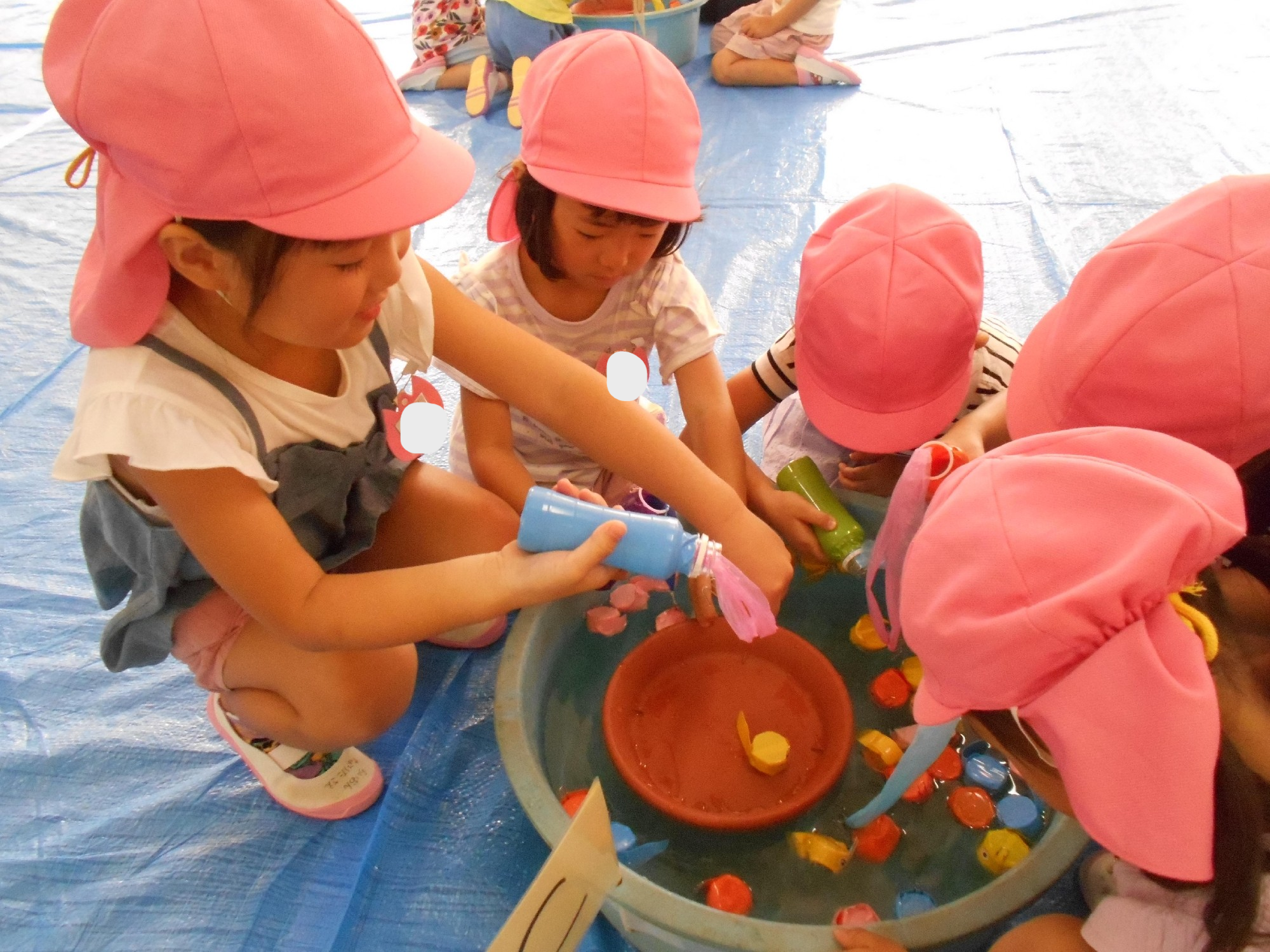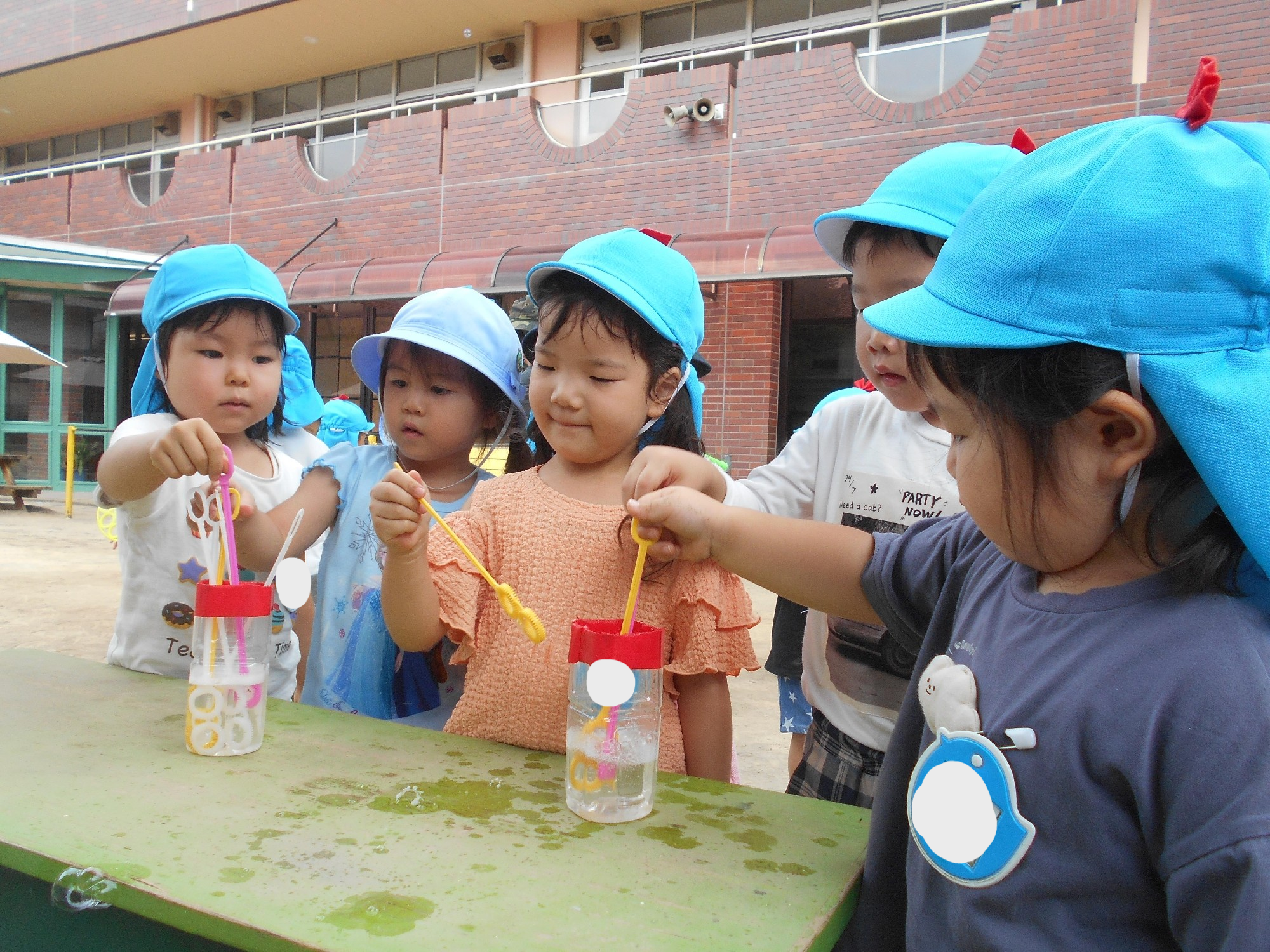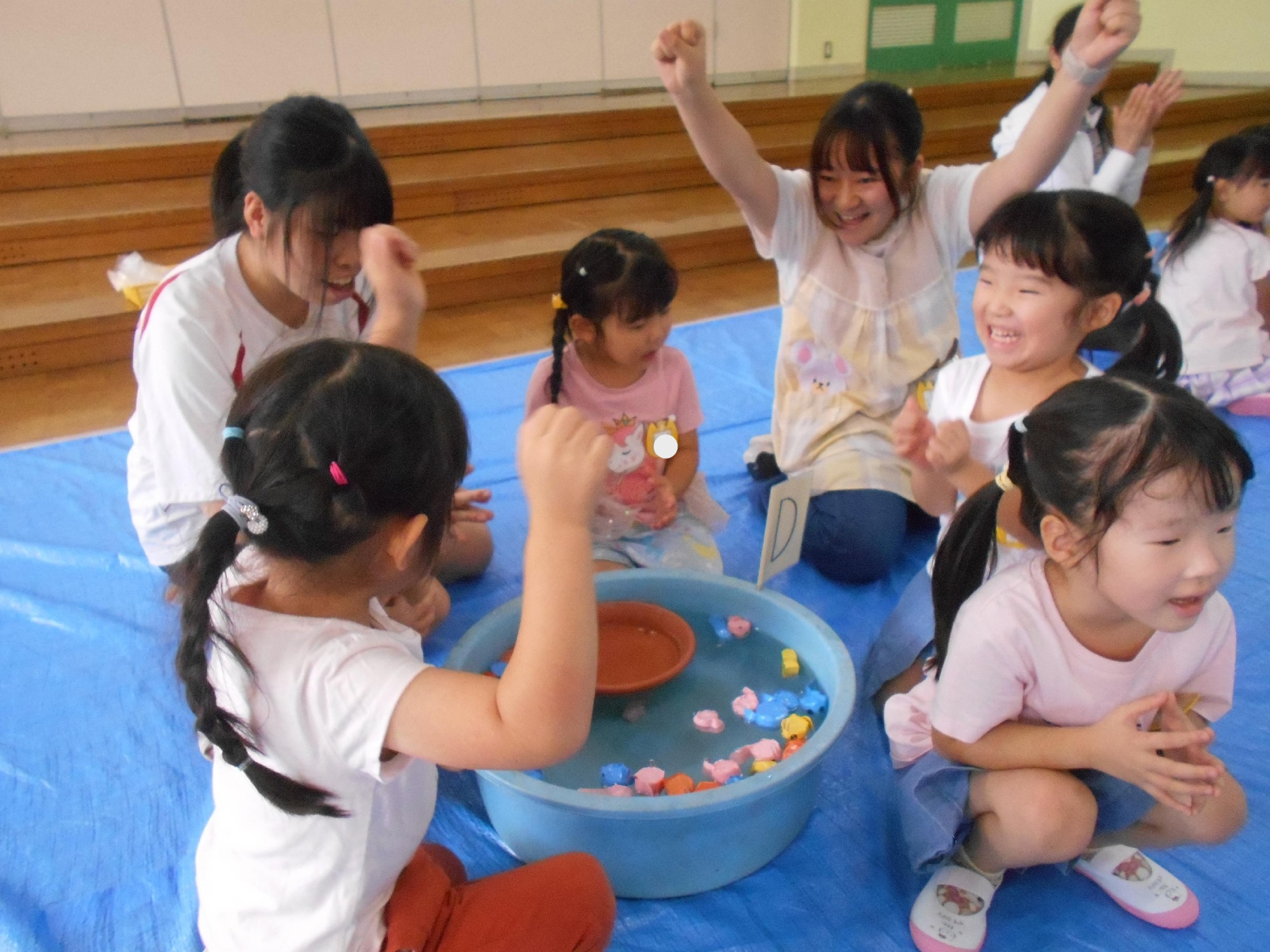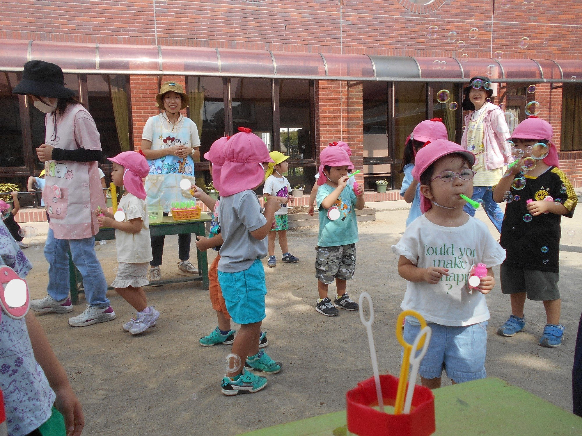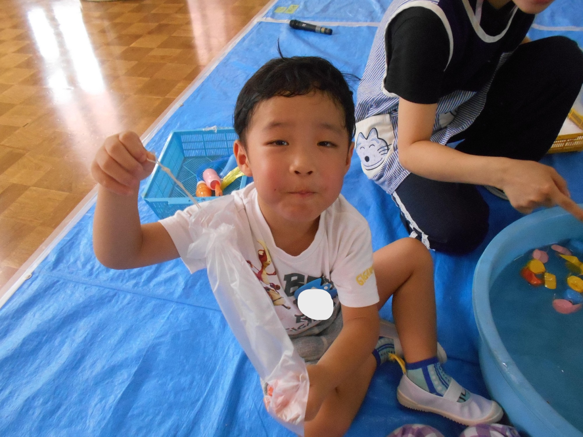 27日は年長組でスライム作り、28日は年中組で魚釣りゲーム、29日は年少組でシャボン玉をしました。