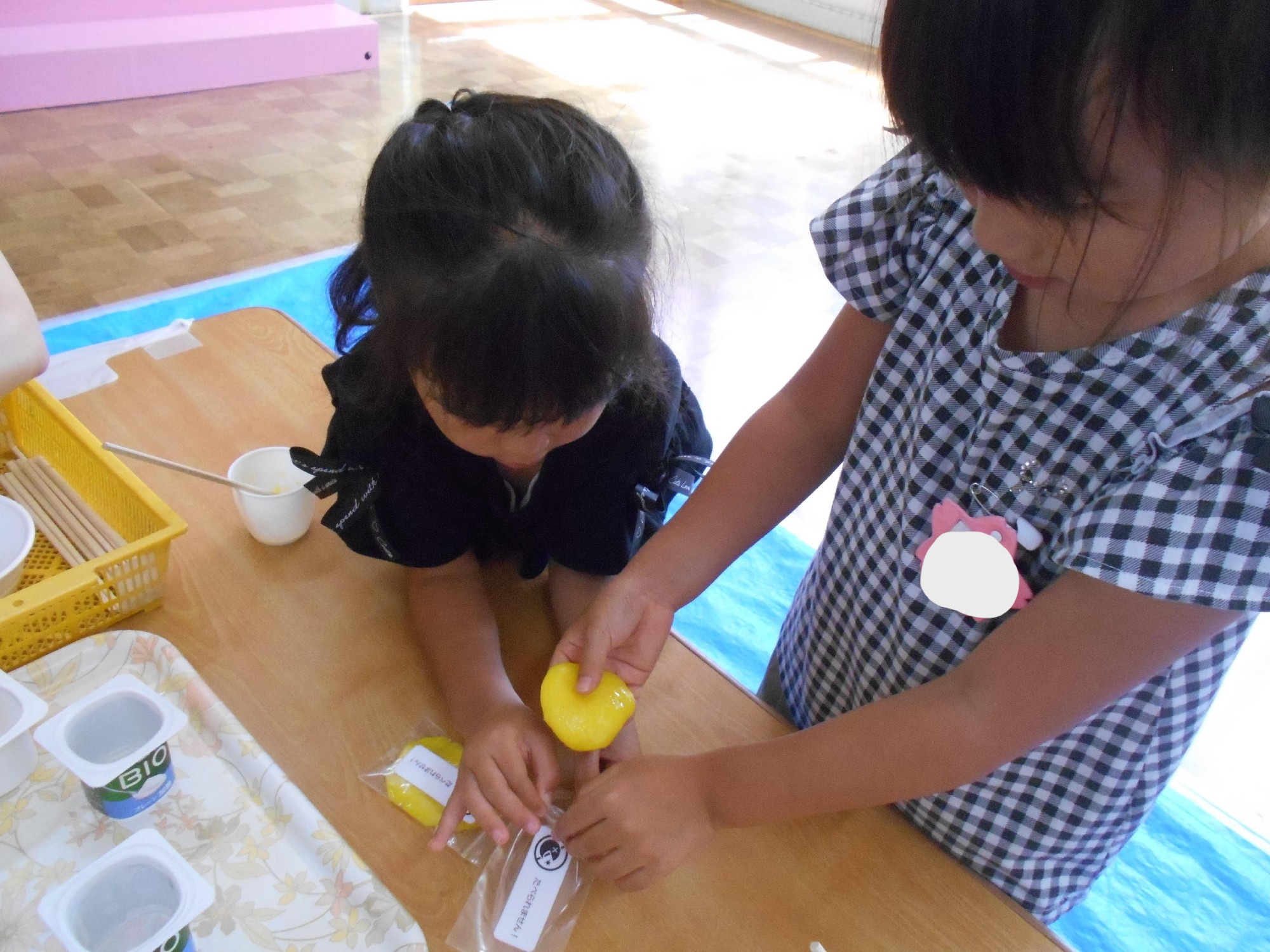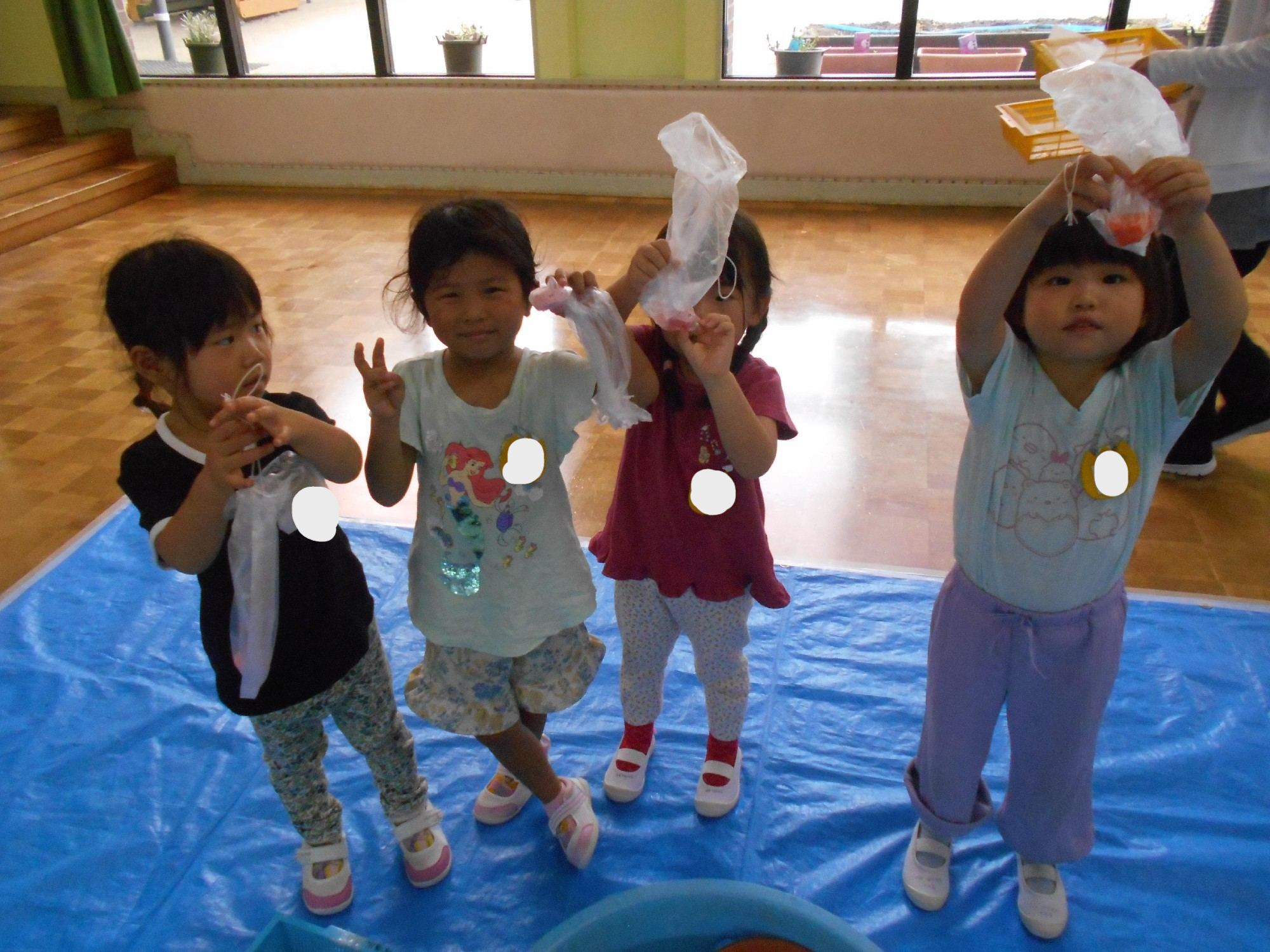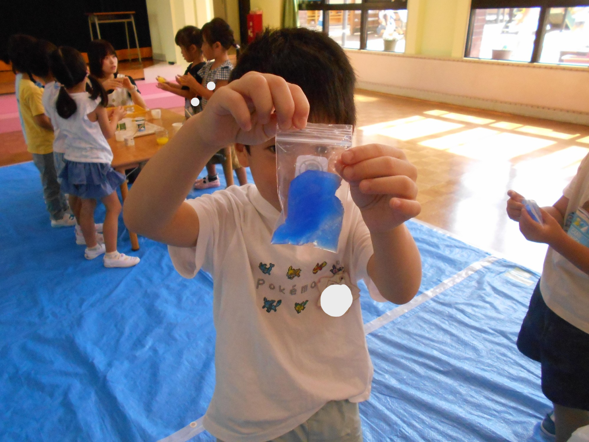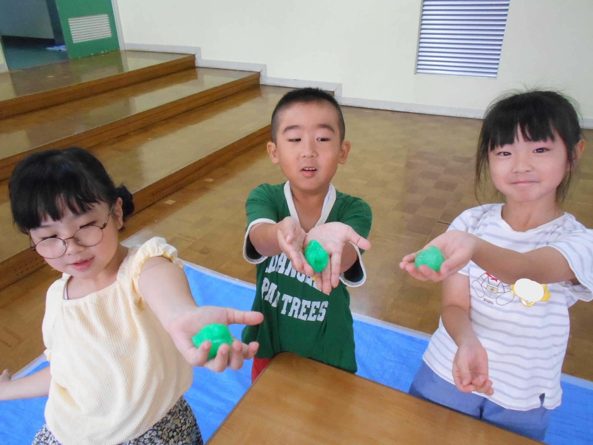 出来上がったスライムは手で伸ばして遊んだり、友達と色の違うスライムを見せ合ったりして、「ぷにぷにだね」「つめたいね」とスライムの感触を楽しんでいました!