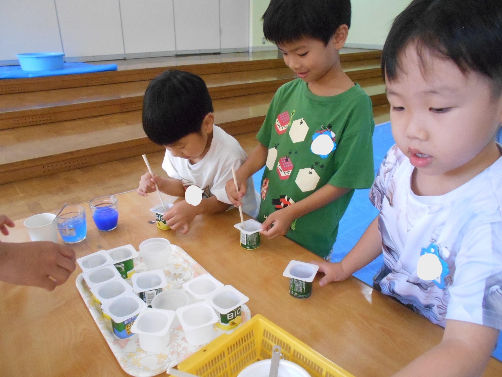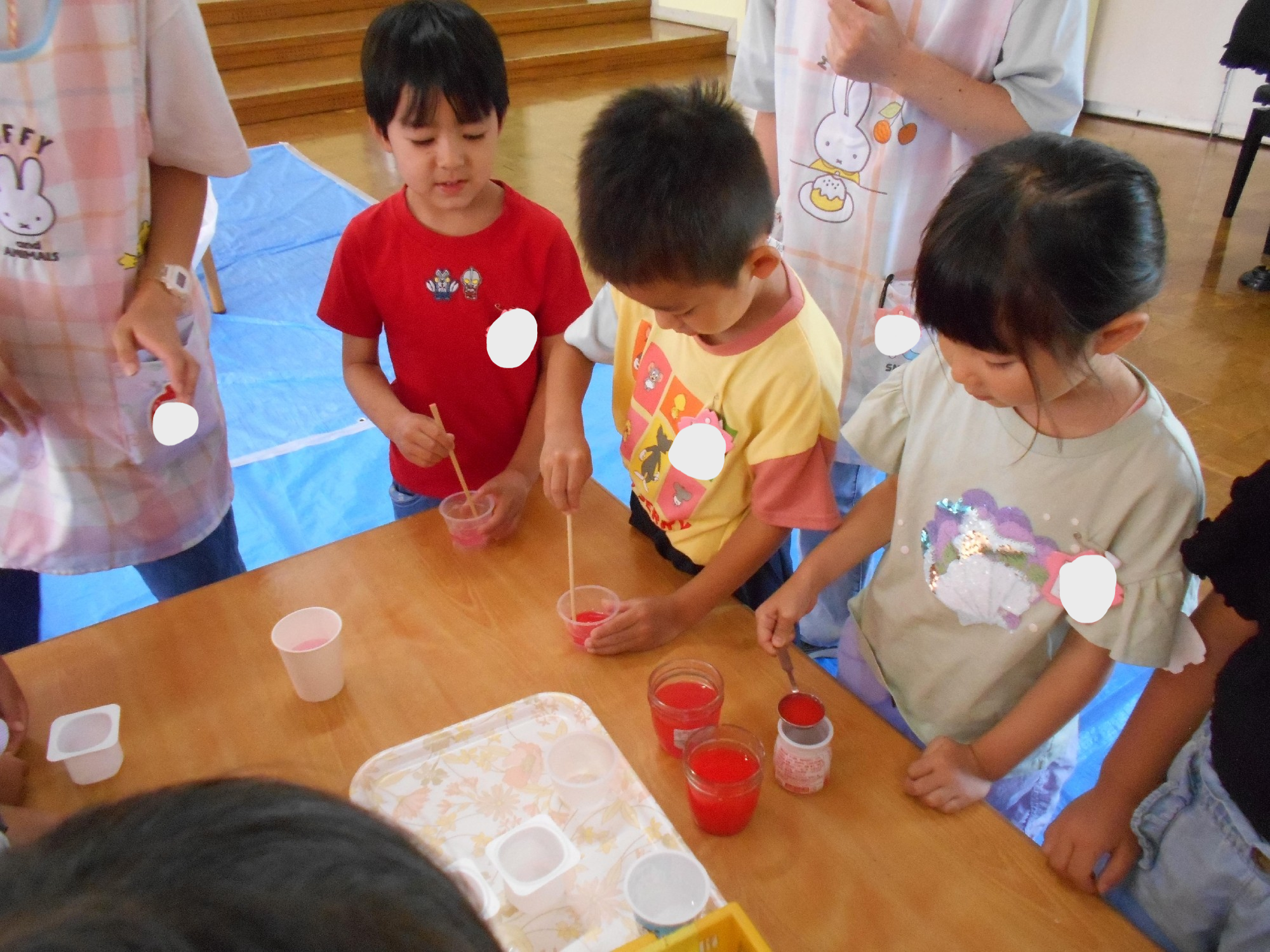 洗濯糊と好きな色の絵の具水をまぜまぜしたあとに、、、先生が「魔法の水」をくれました!