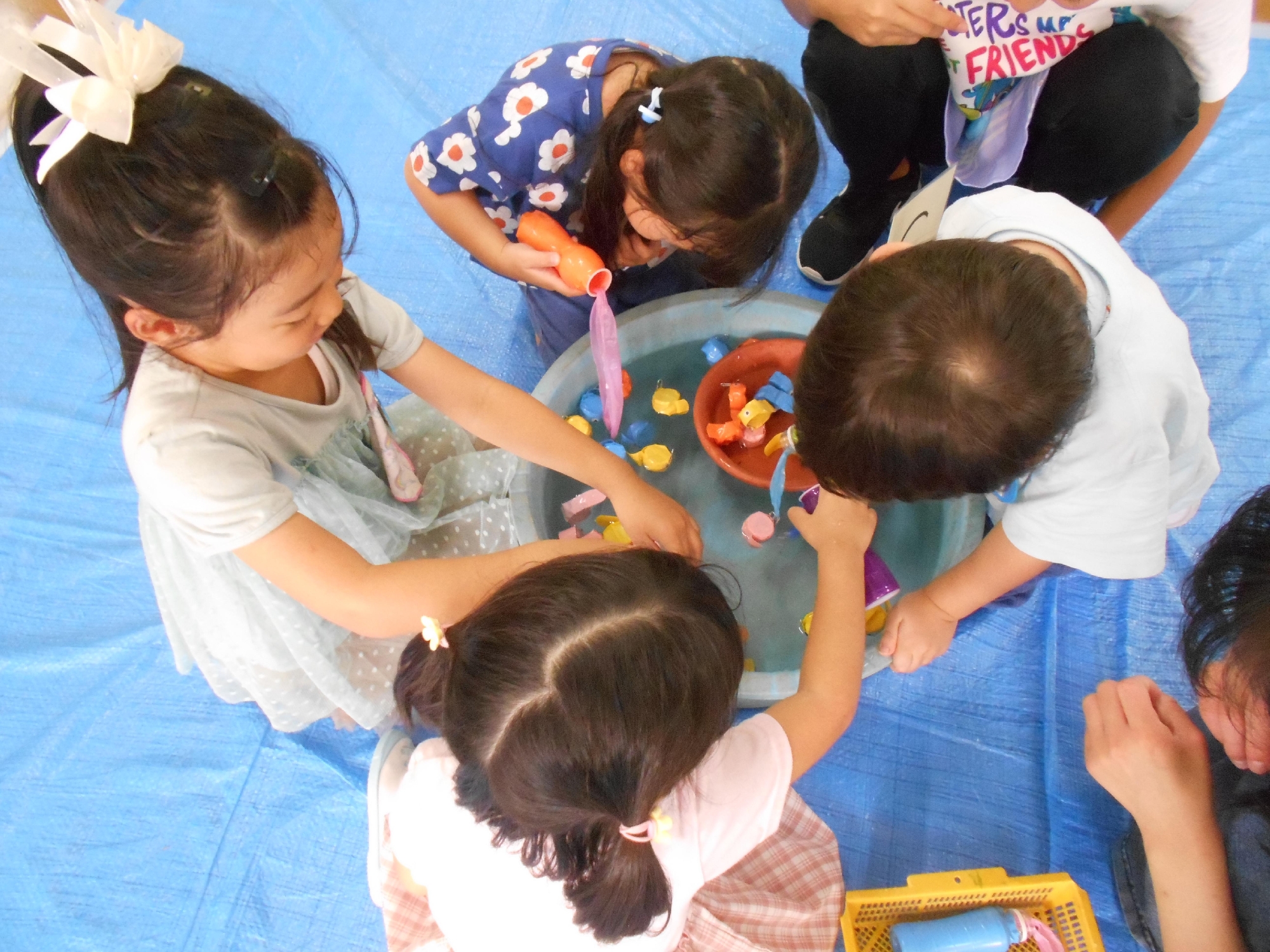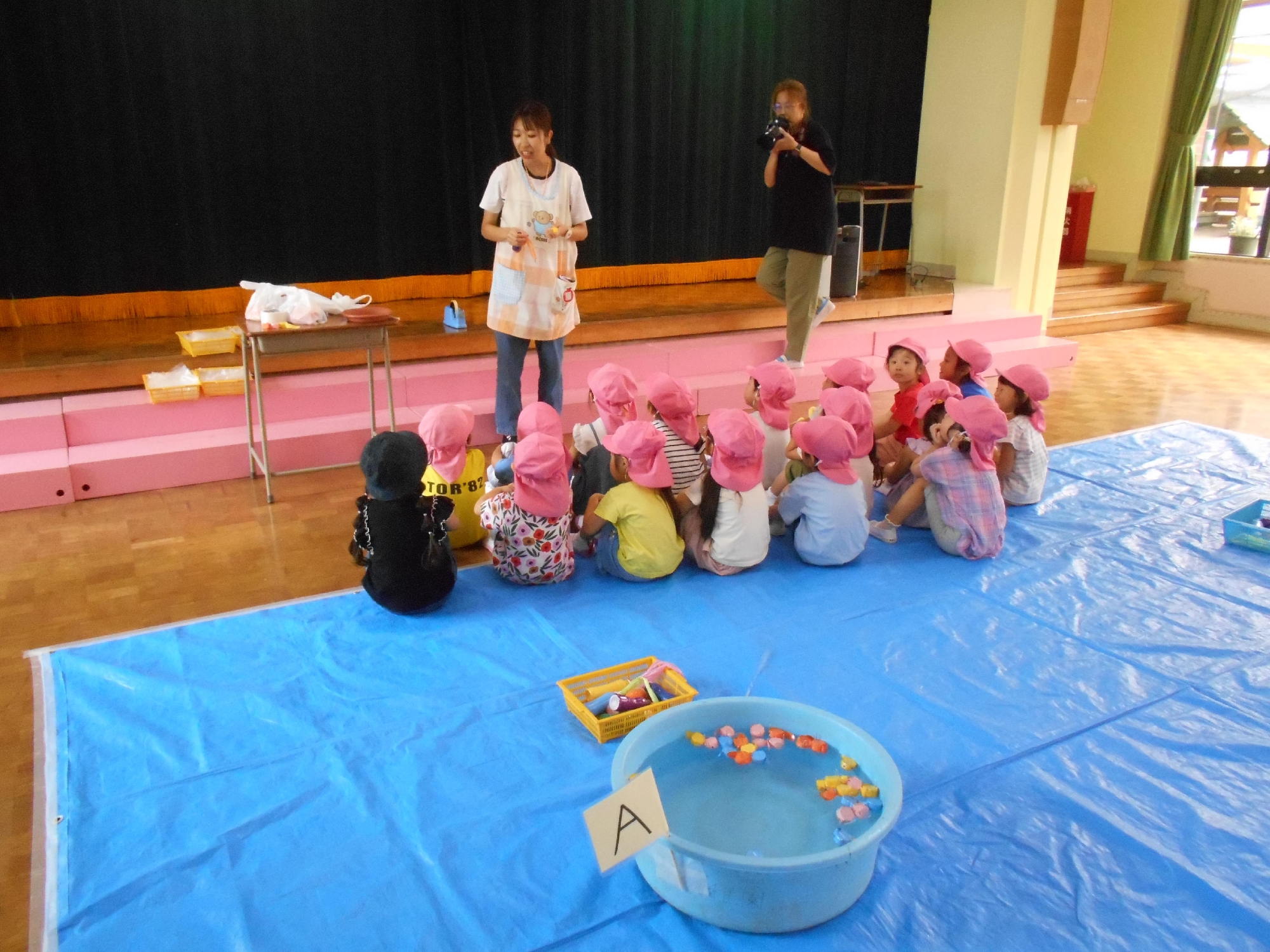 27日は年長組でスライム作り、28日は年中組で魚釣りゲーム、29日は年少組でシャボン玉をしました。