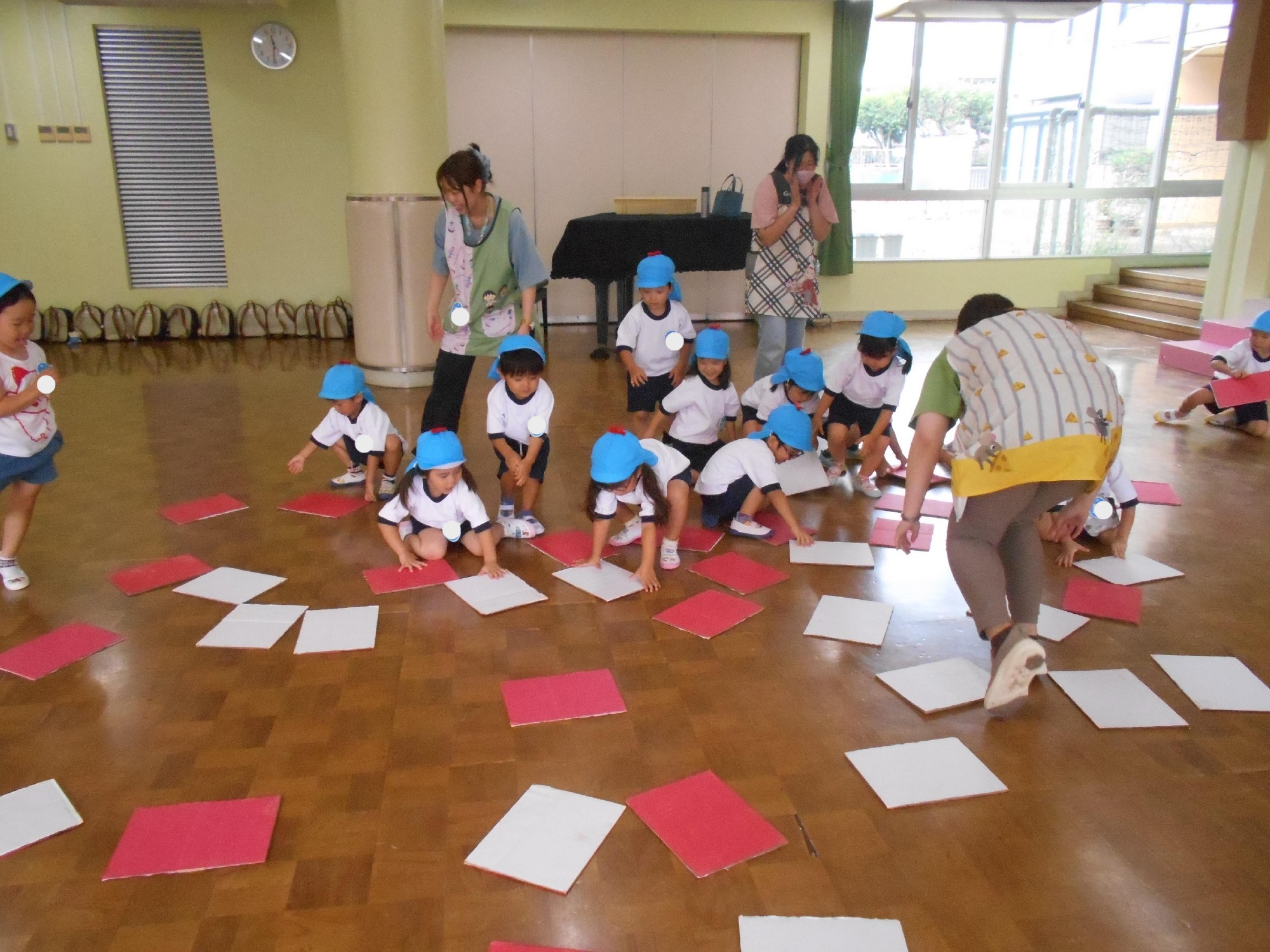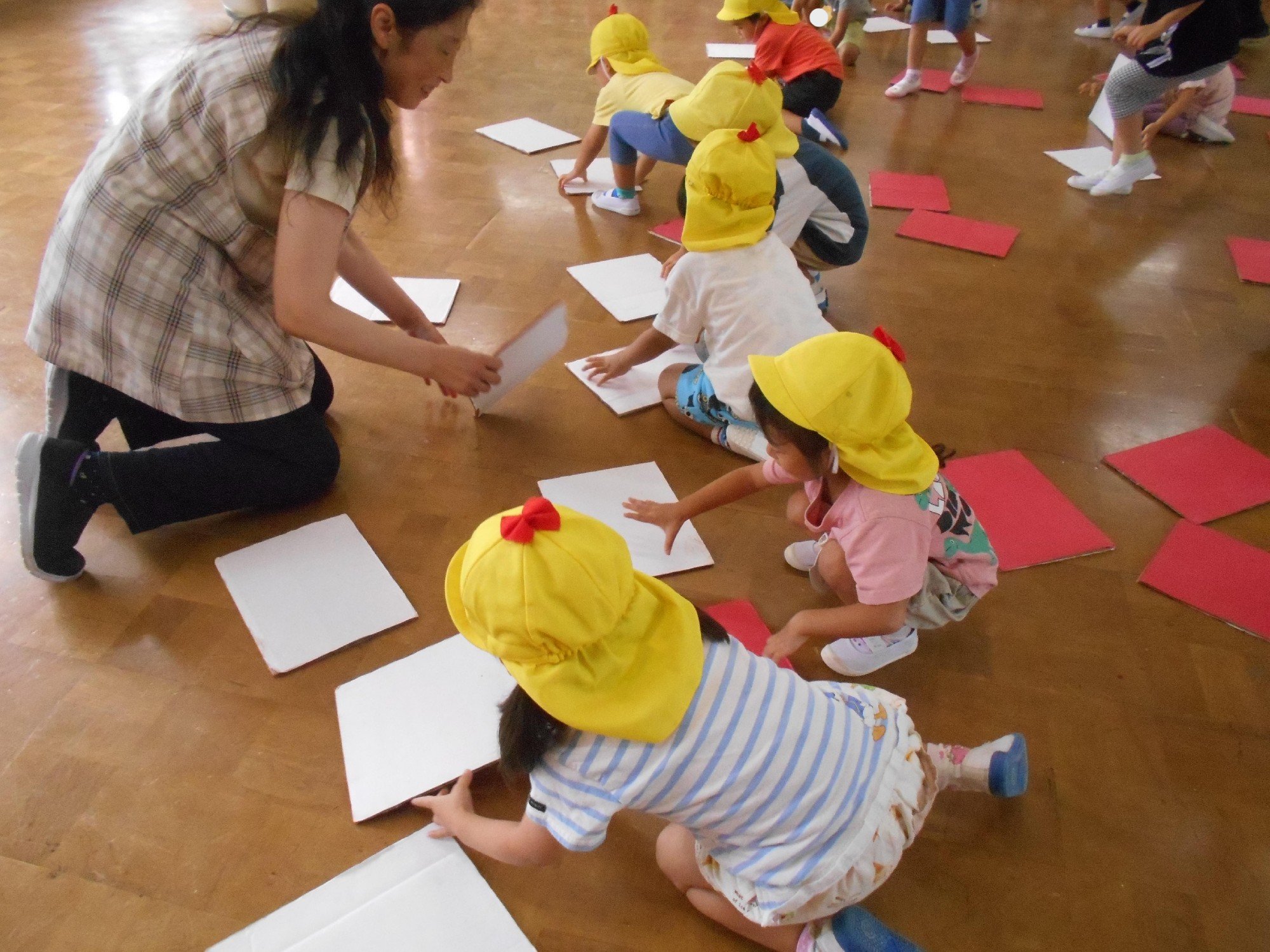 先生は白のカード、みんなは赤のカードにめくるんだよ!と伝えると「赤、赤、赤」と呪文のように唱え、いざ戦いです☺