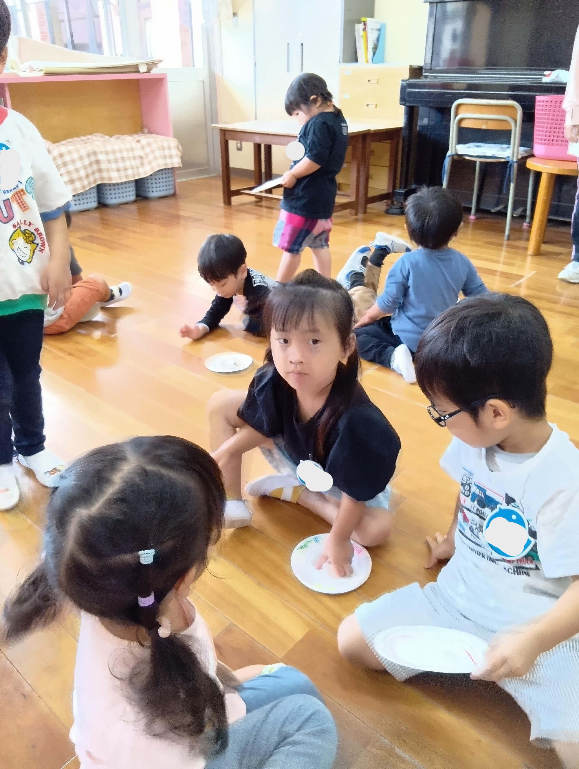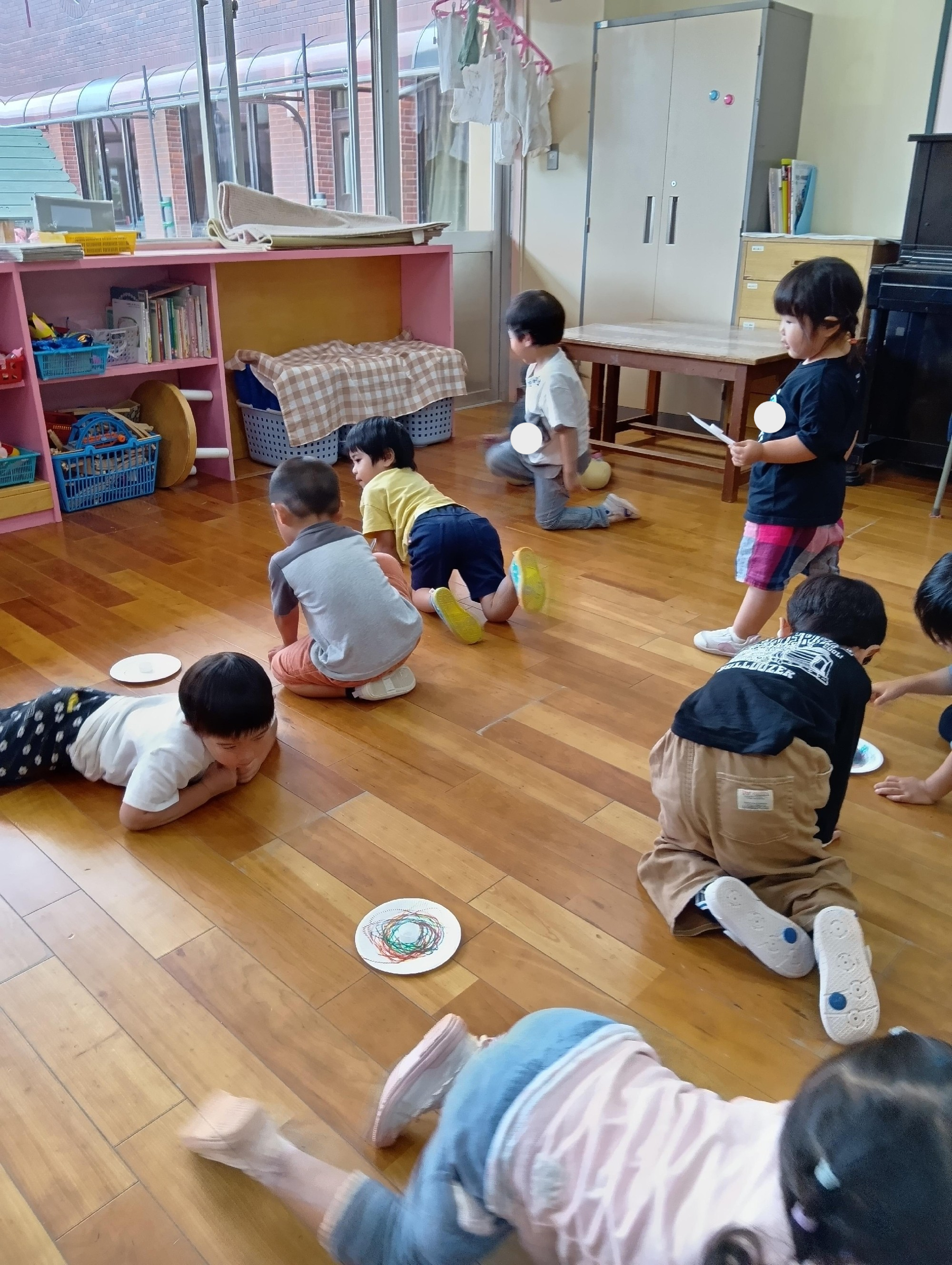 9月19日(金)、りす組にいる実習生の先生が紙皿でこまを作ってくれました。