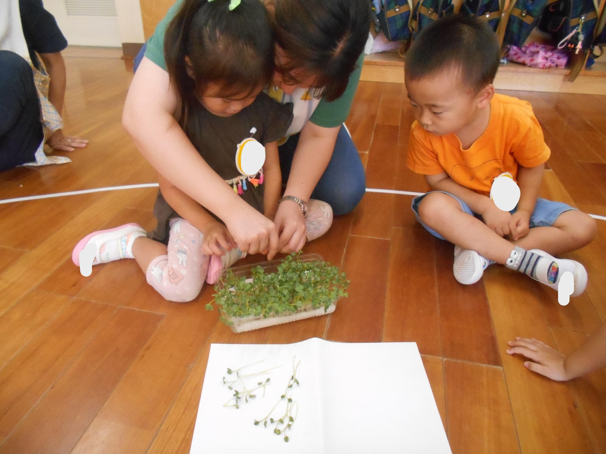 先週みんなで蒔いた「かいわれ大根」の種が、水だけでぐんぐん育ち、収穫の日を迎えました✨