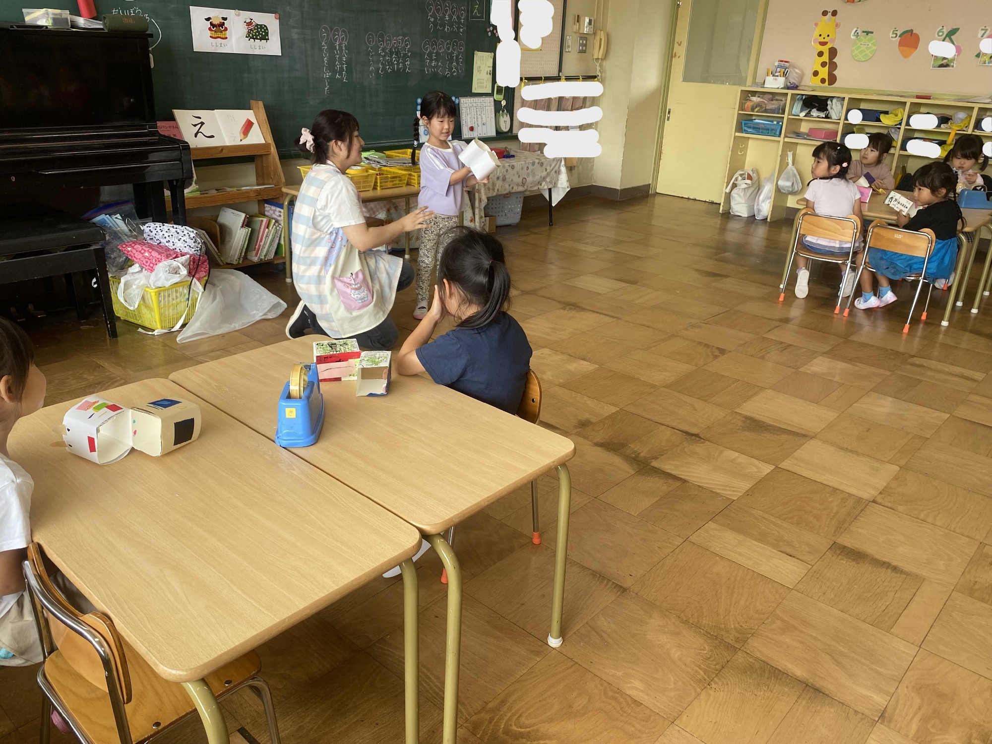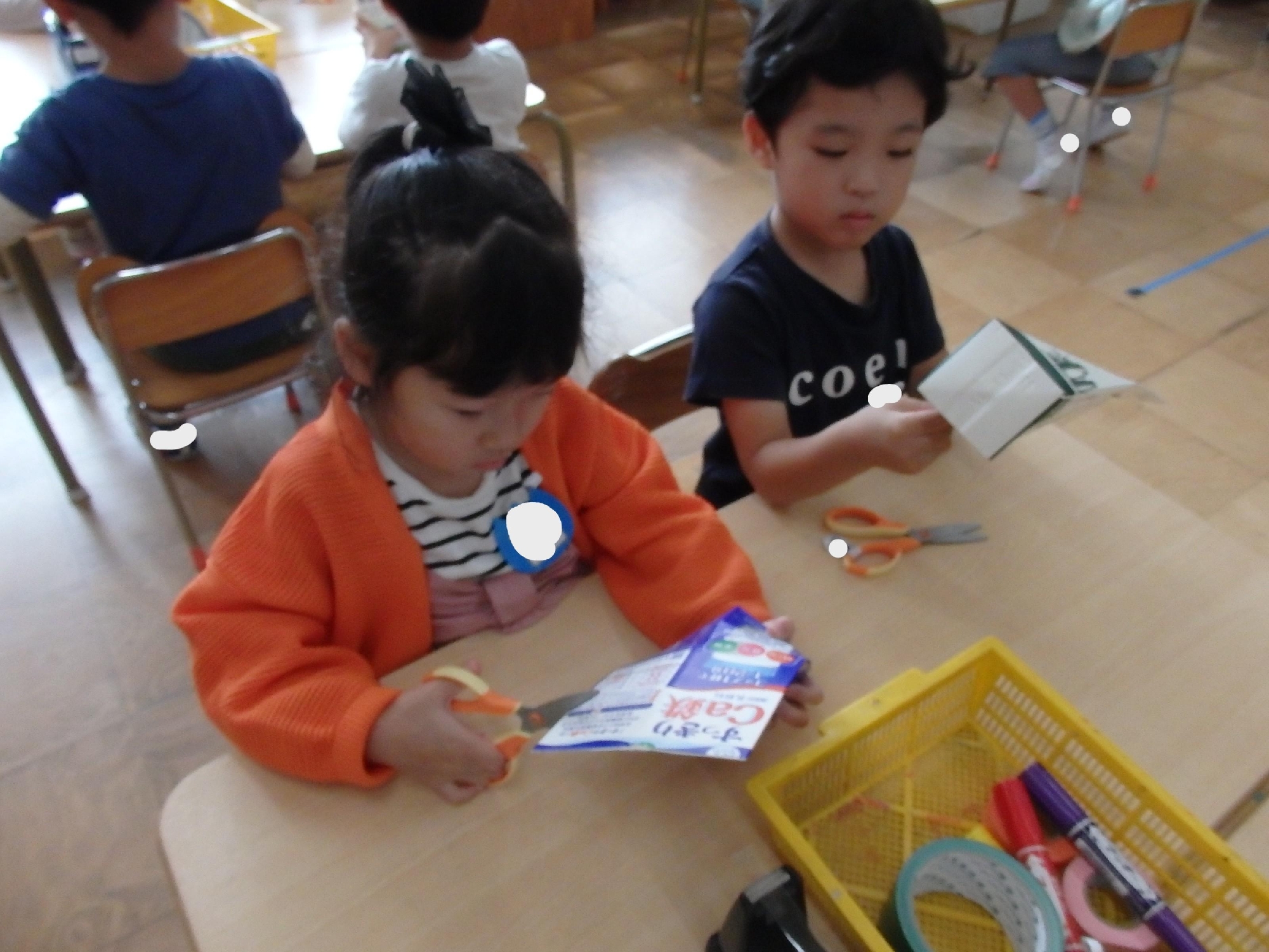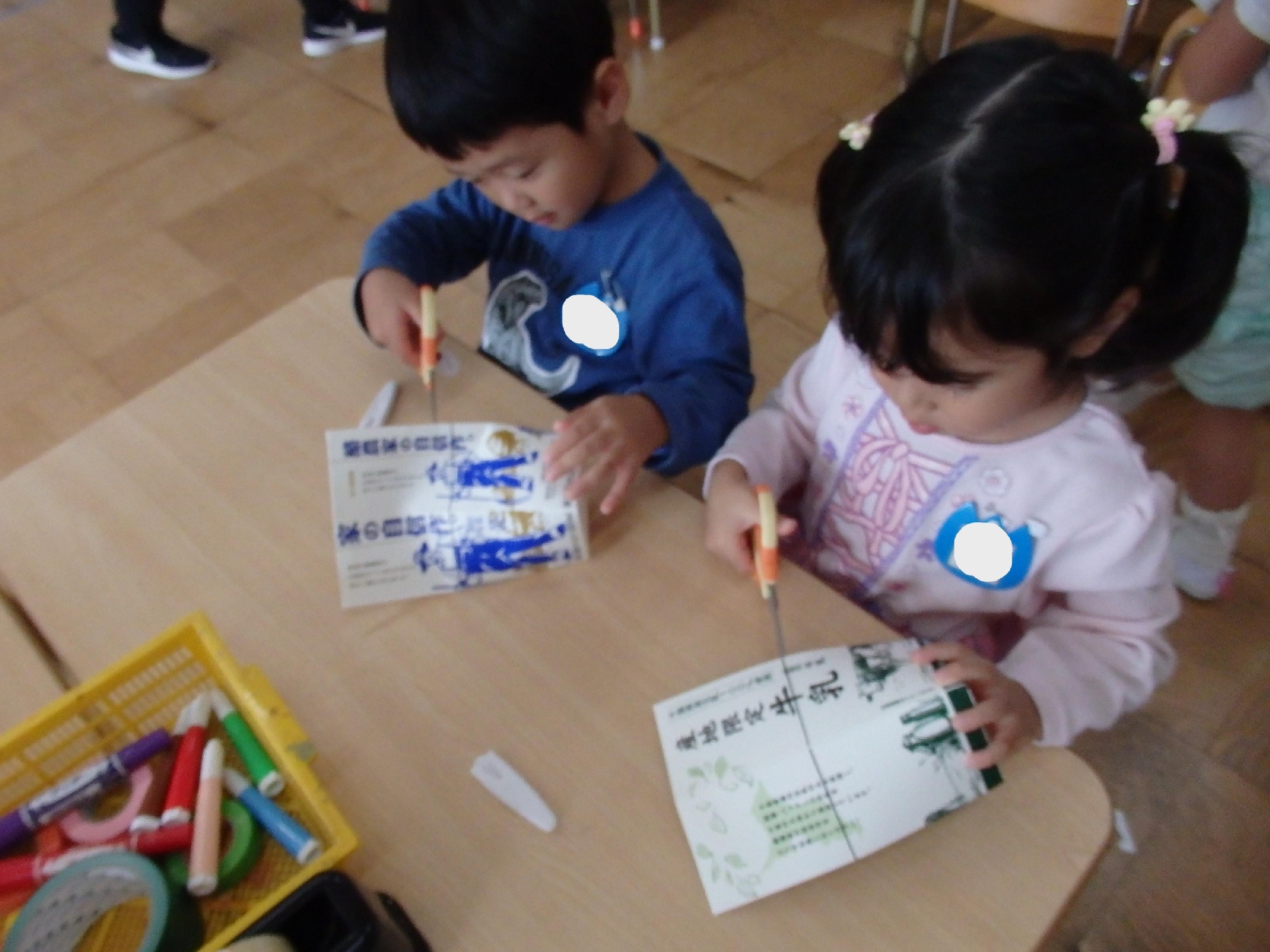 ビニールテープで動物をつけたり、色画用紙にクレヨンや油性ペンで模様を描いたり、工夫していました。