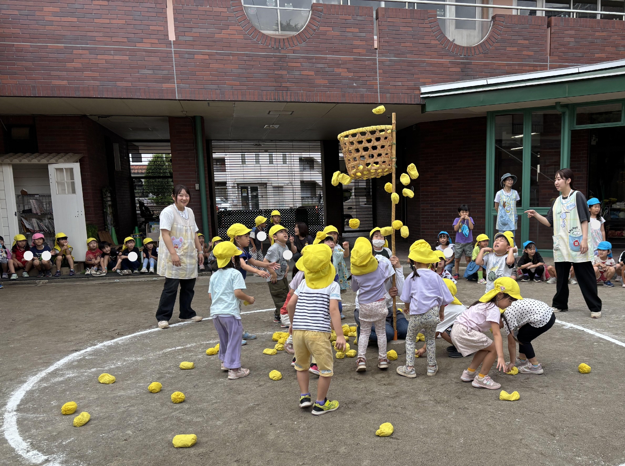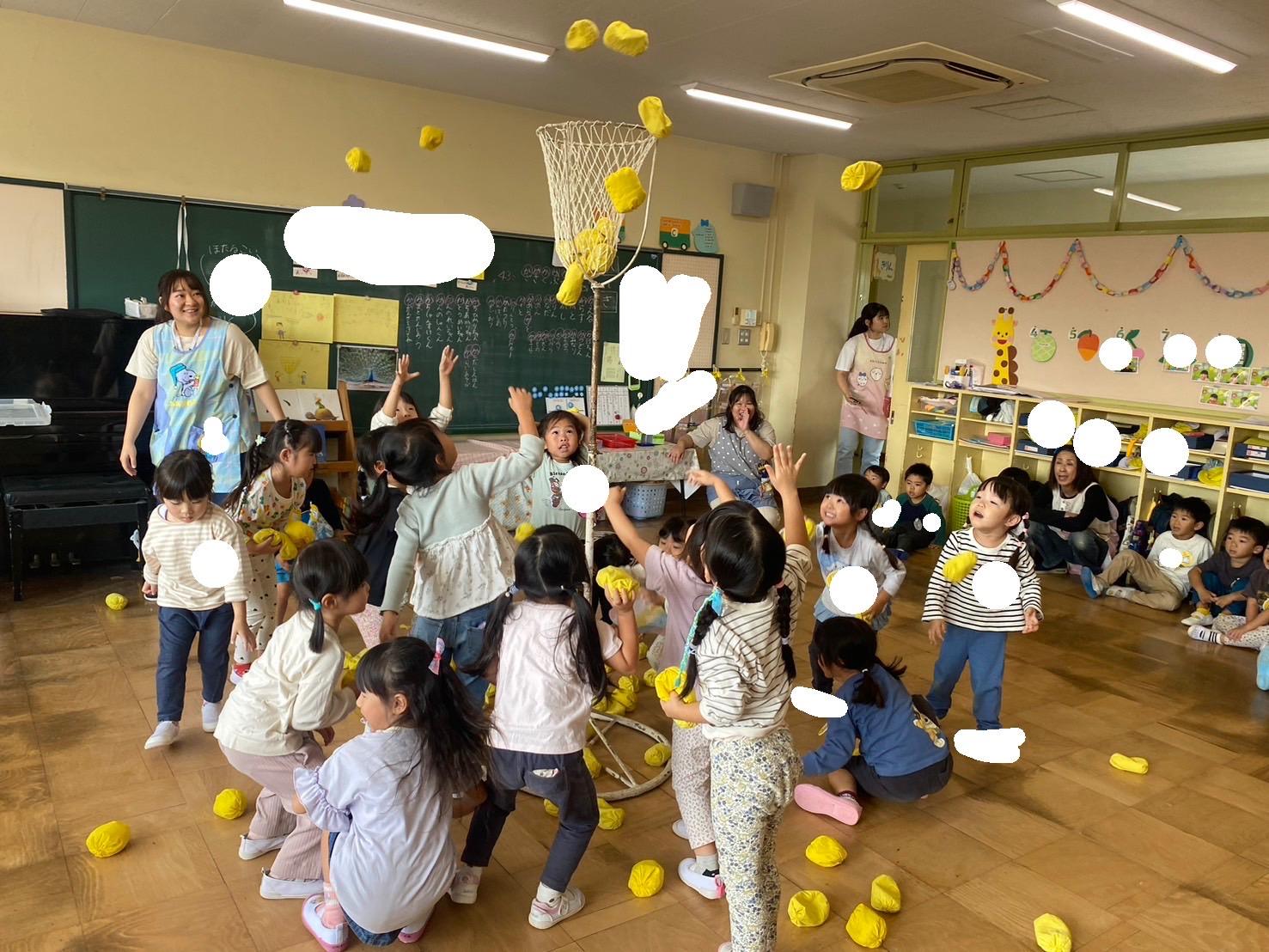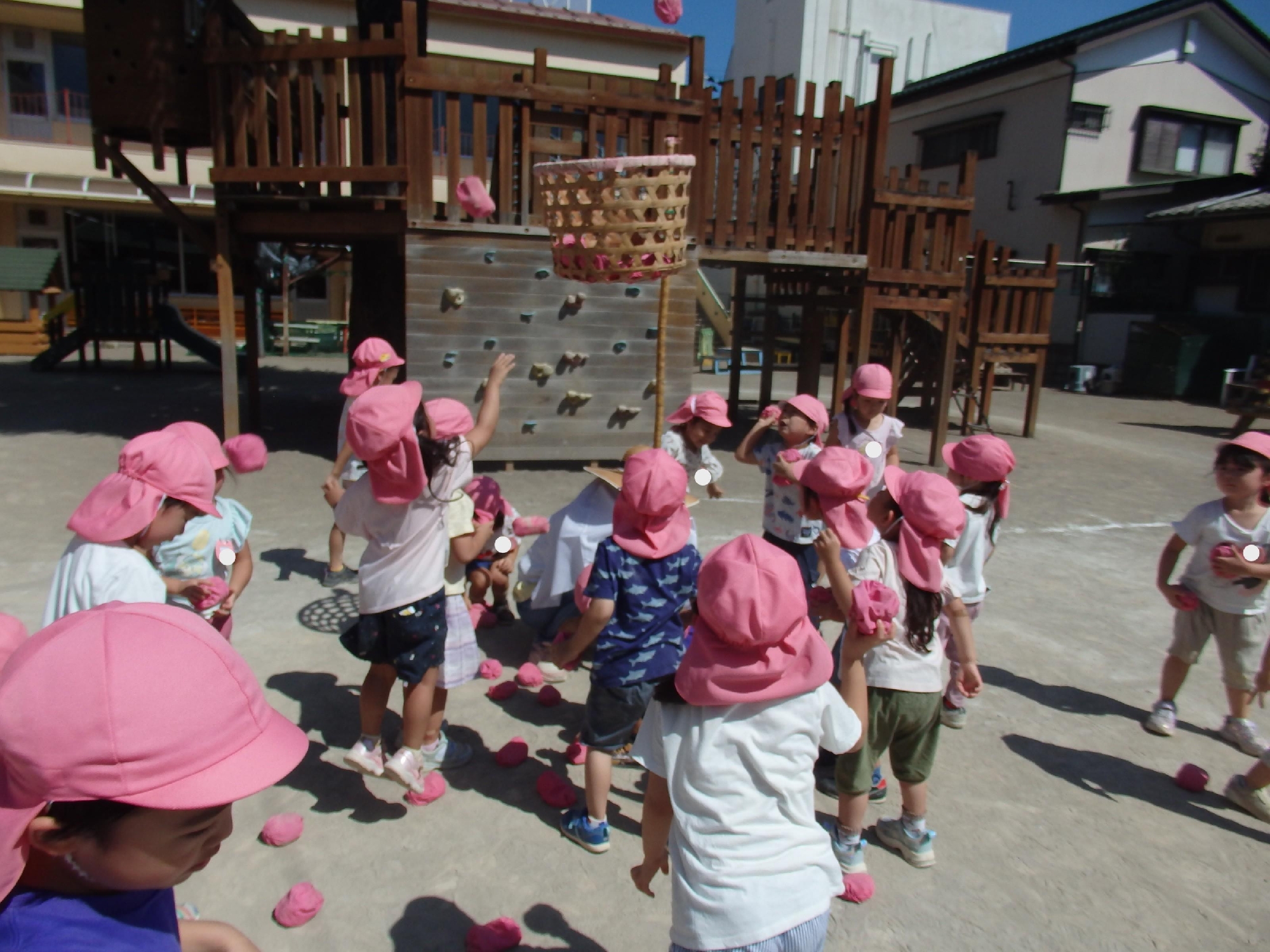 年少組とは、「応援よろしくね!」と玉入れ交流を行いました。