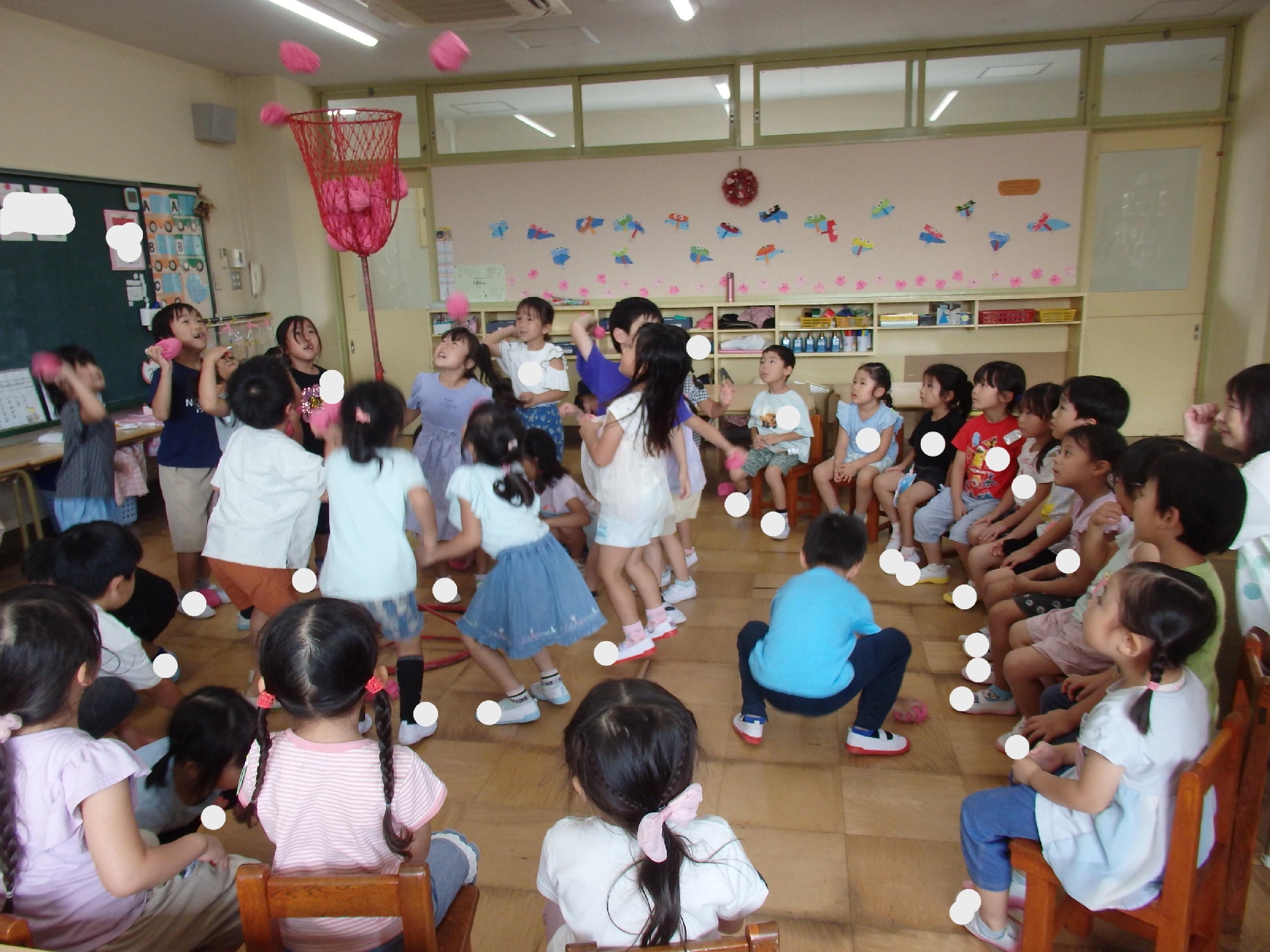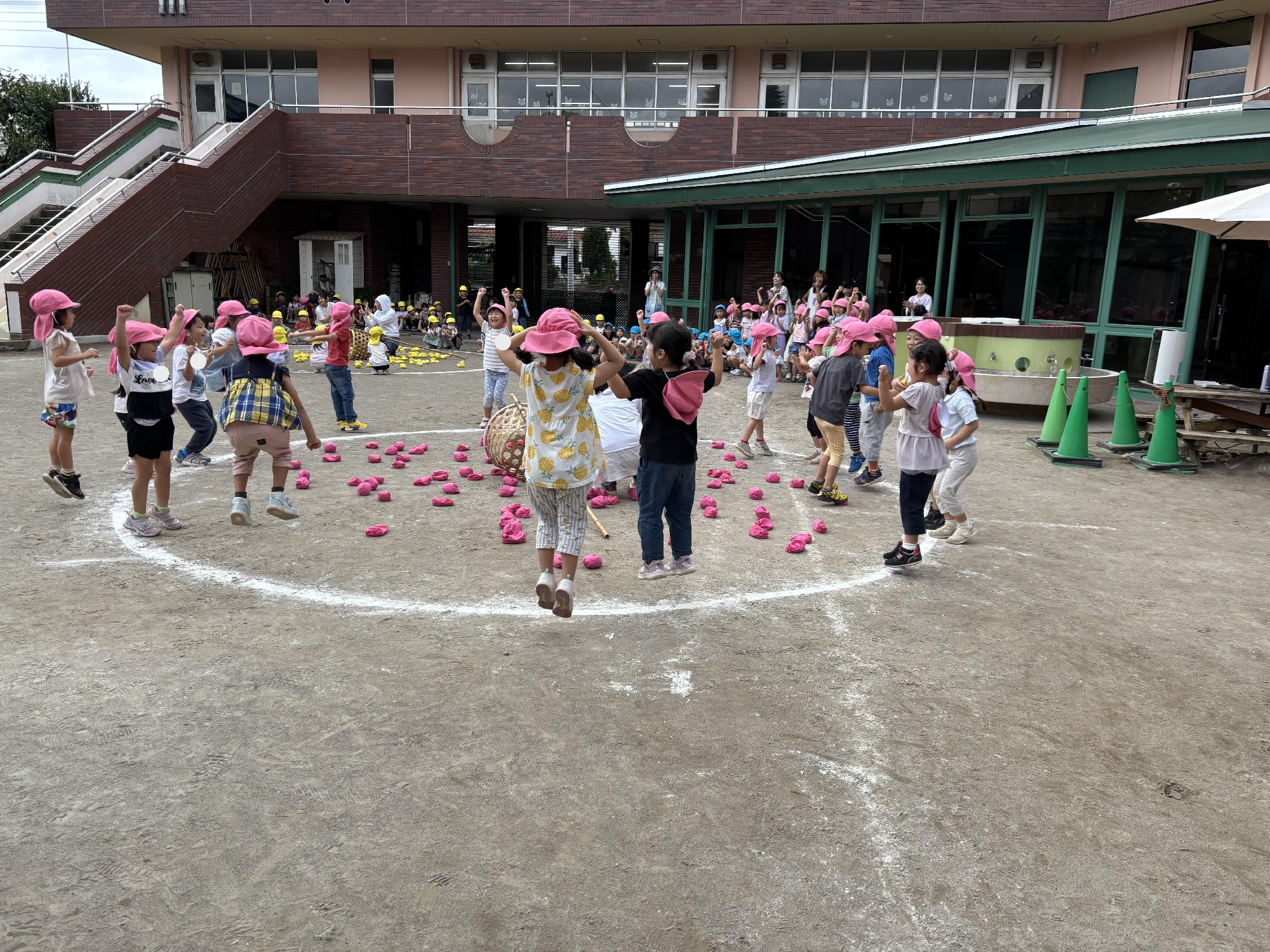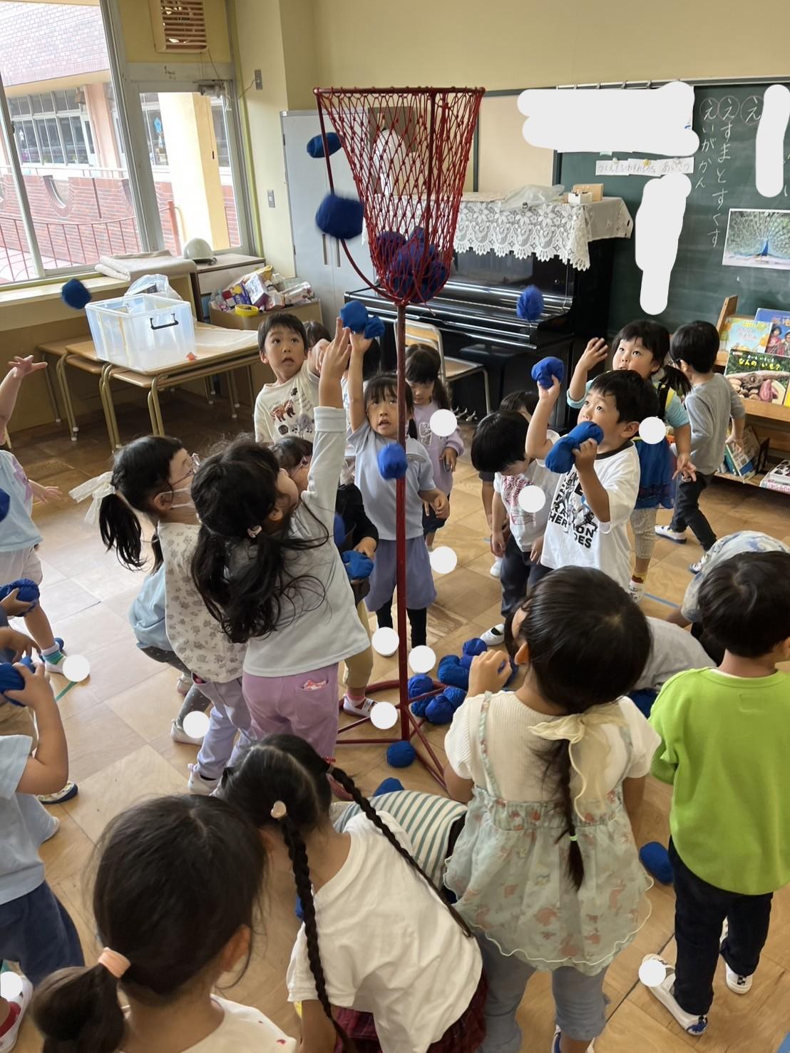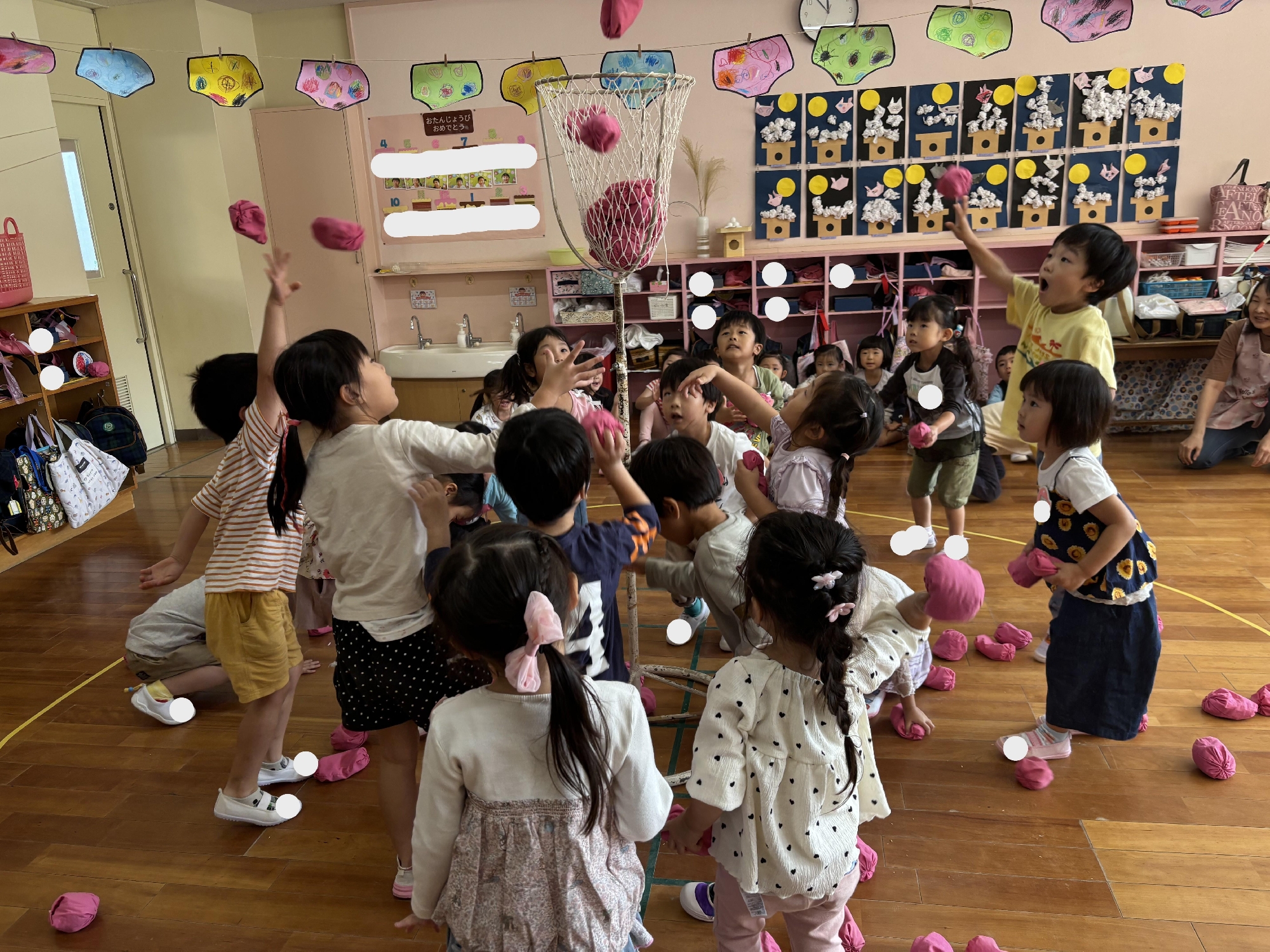 年少組とは、「応援よろしくね!」と玉入れ交流を行いました。