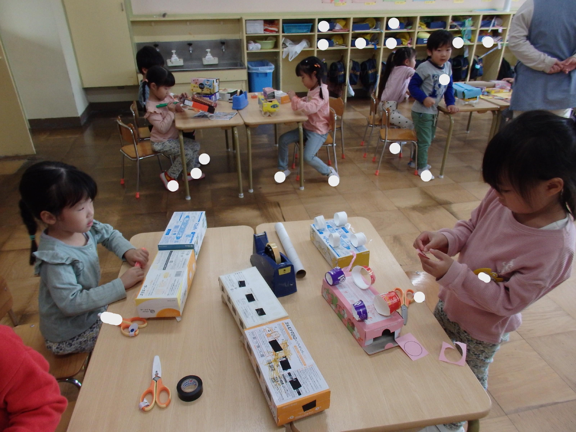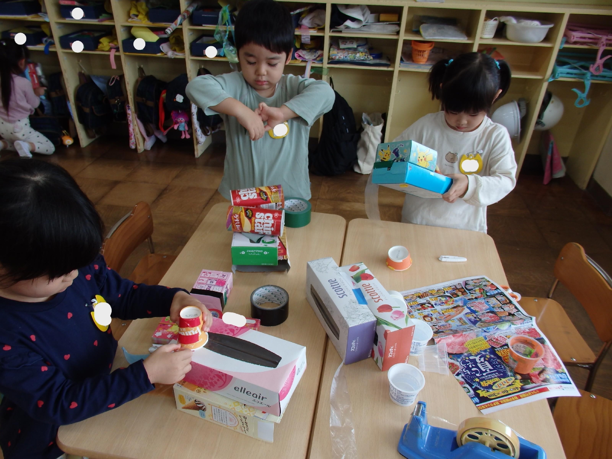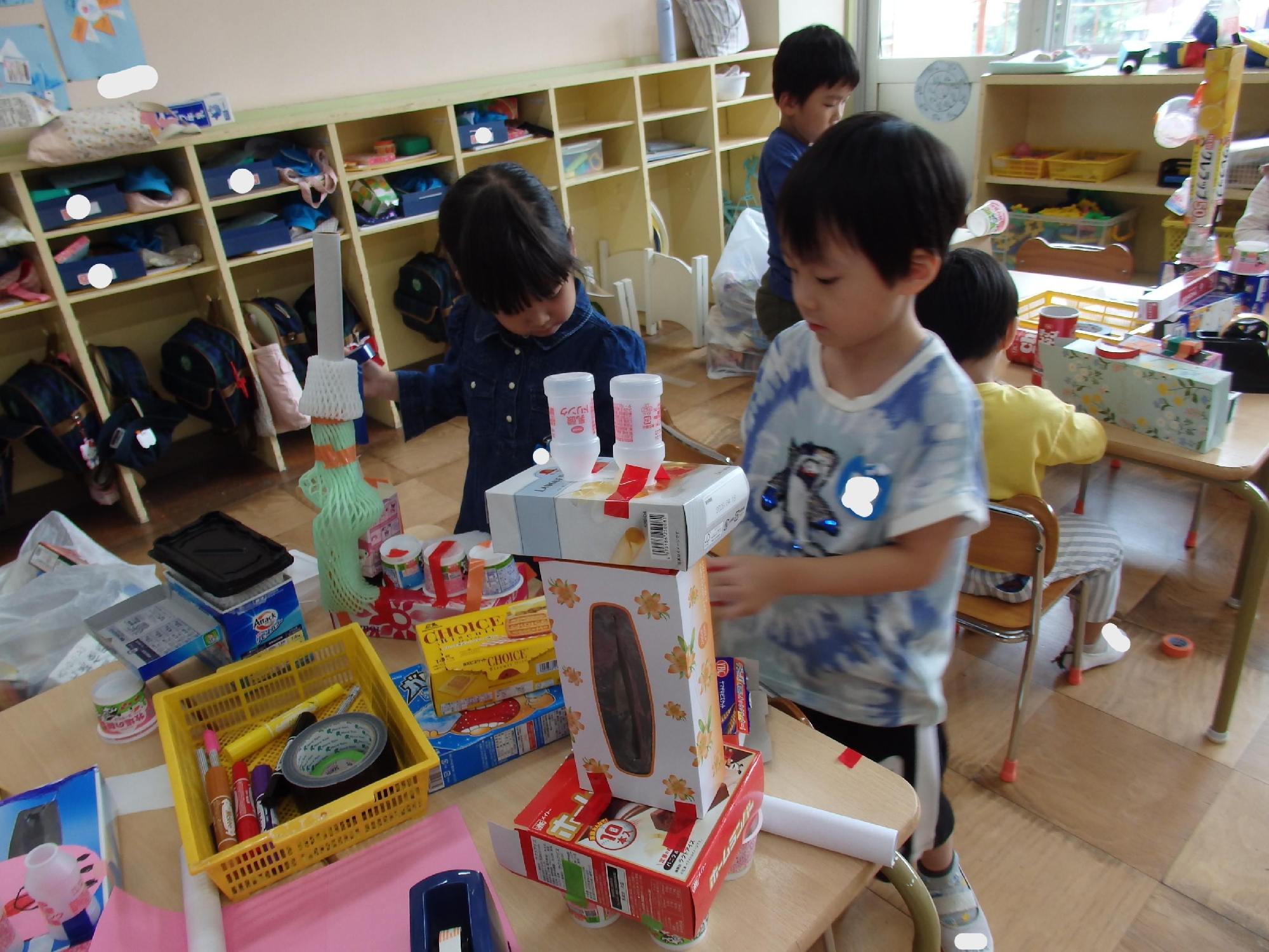 大小、様々な大きさの箱やプラスチックの入れ物などを使い、どうやったらくっつくか、本物のように見えるにはどうしたらいいのかと、考えながら作りました😊