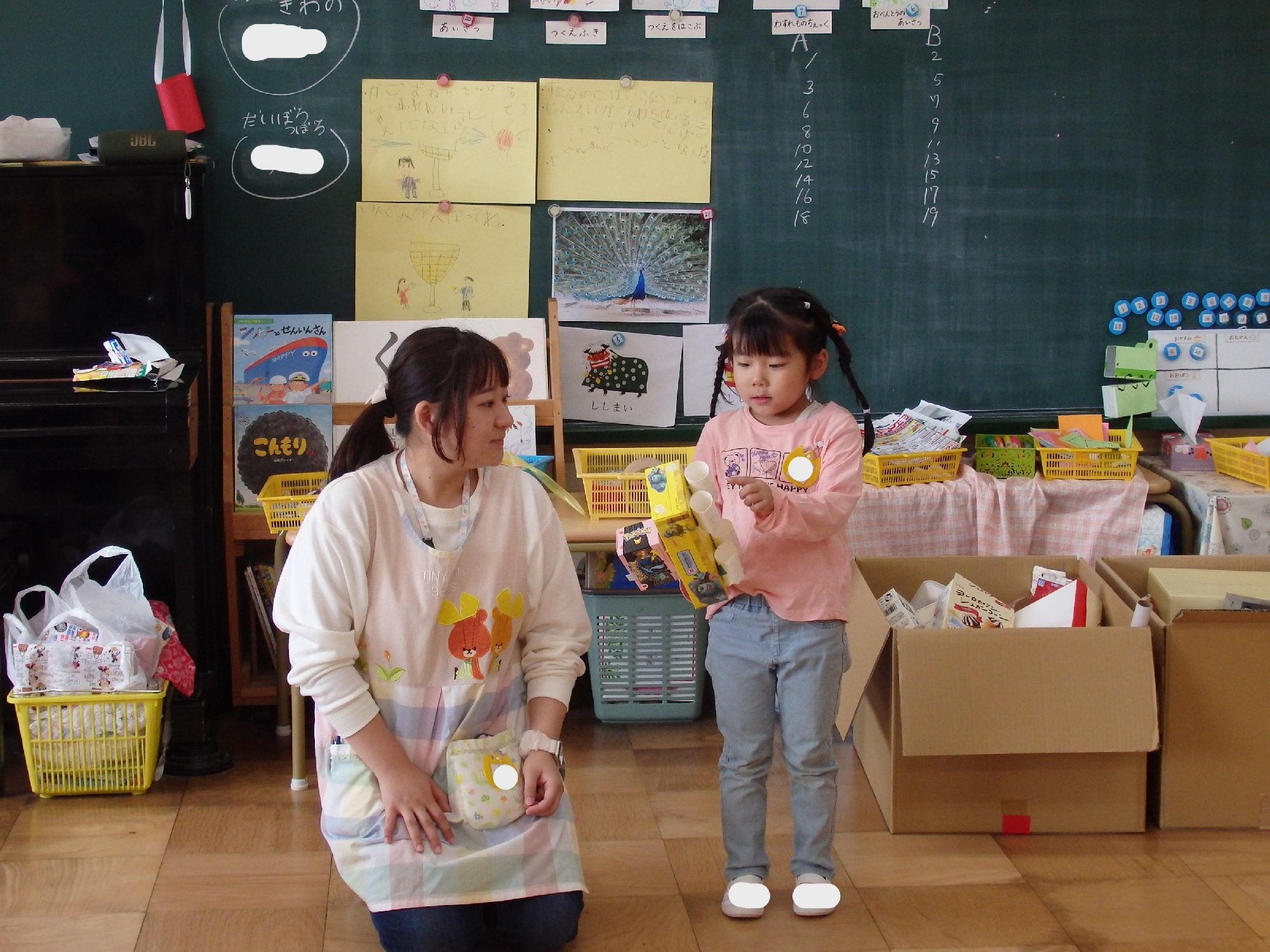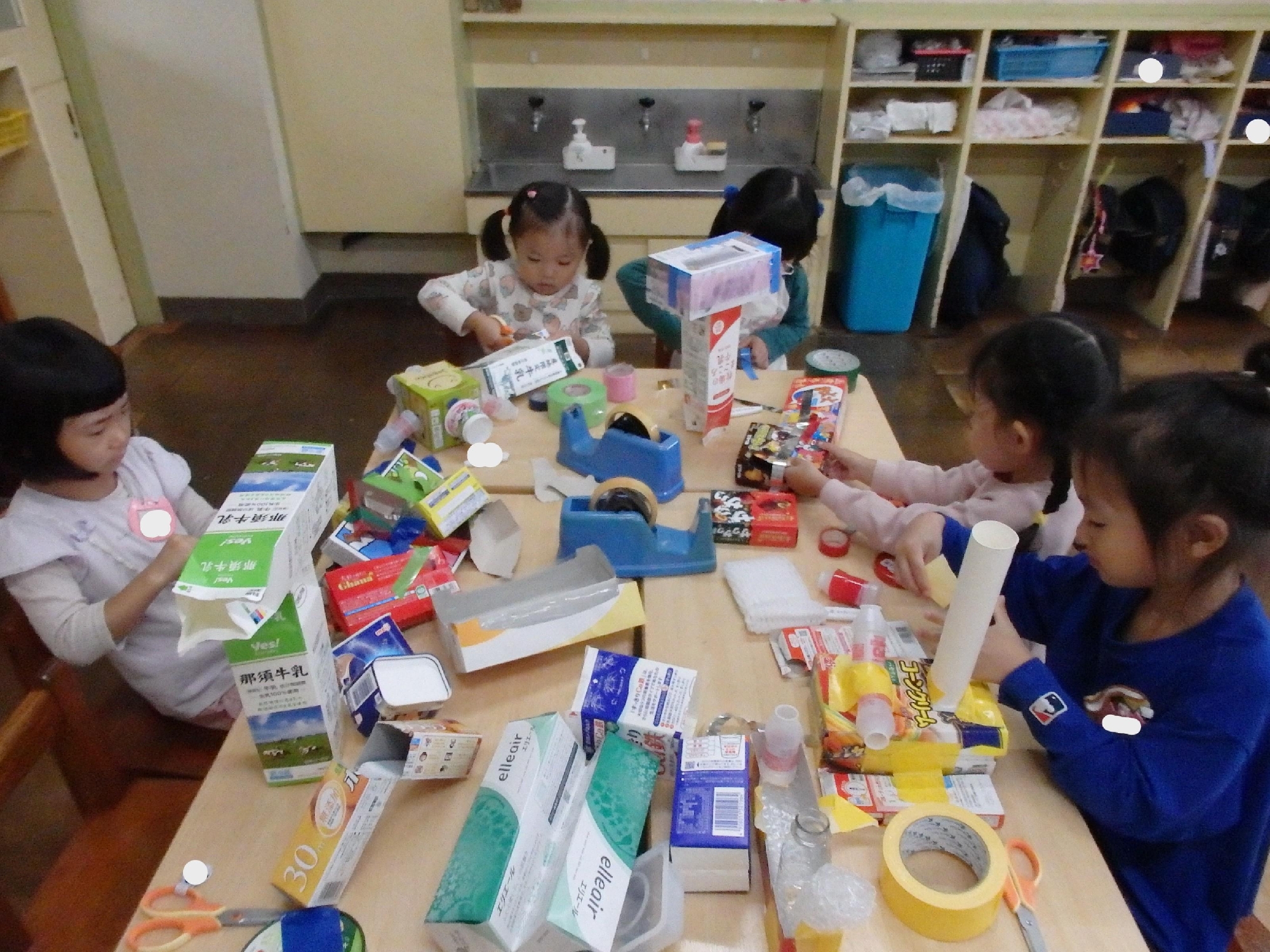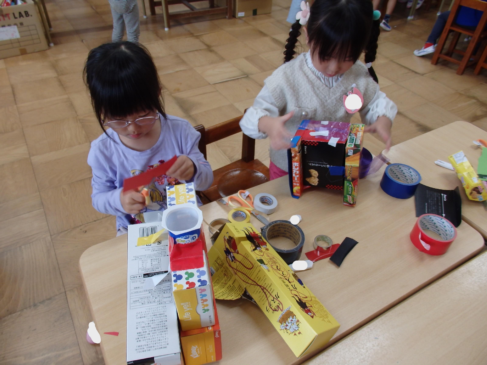 10月16日(木)、空き箱を使って自分でイメージした動物や人間、乗り物などを作りました。