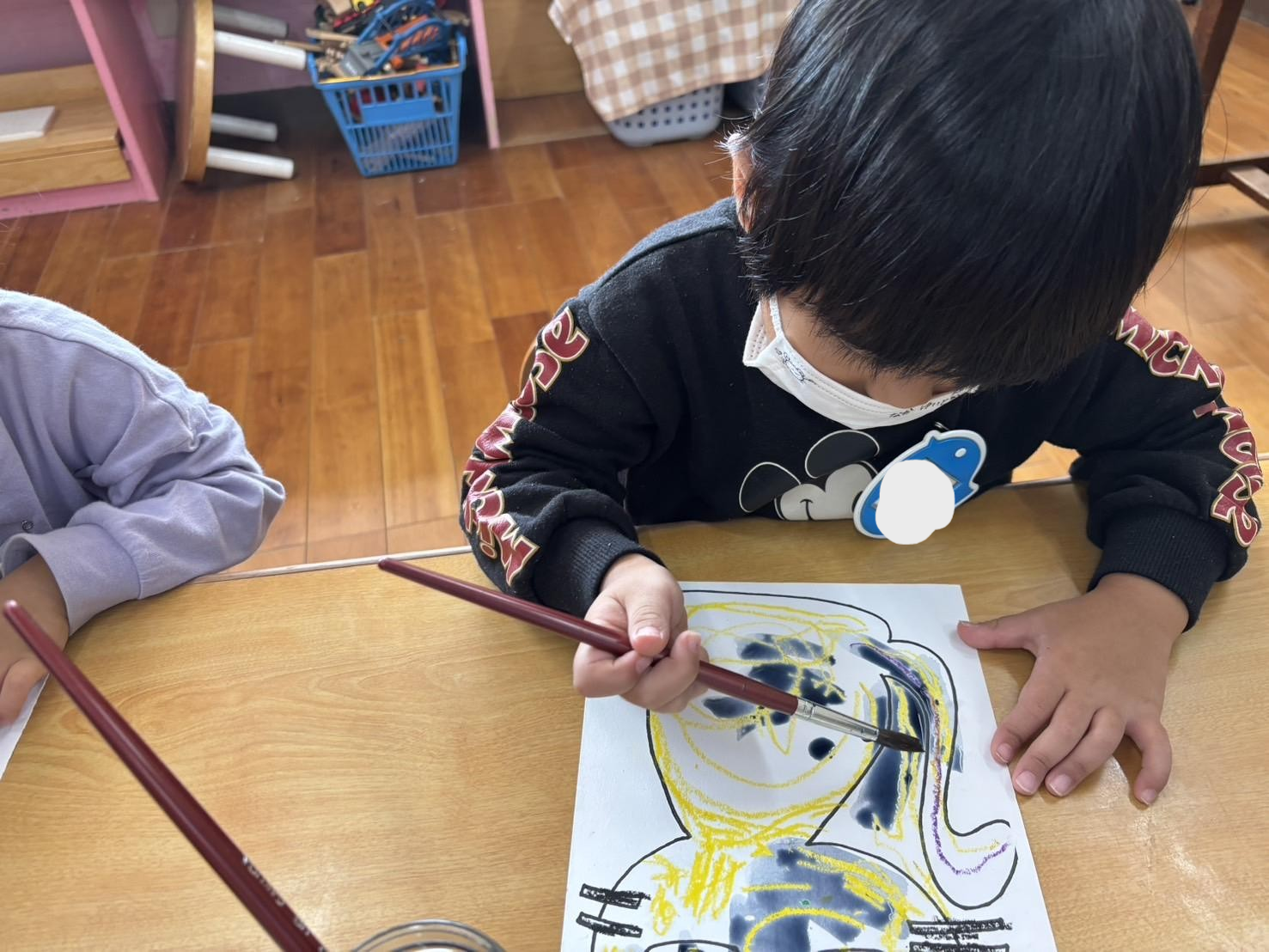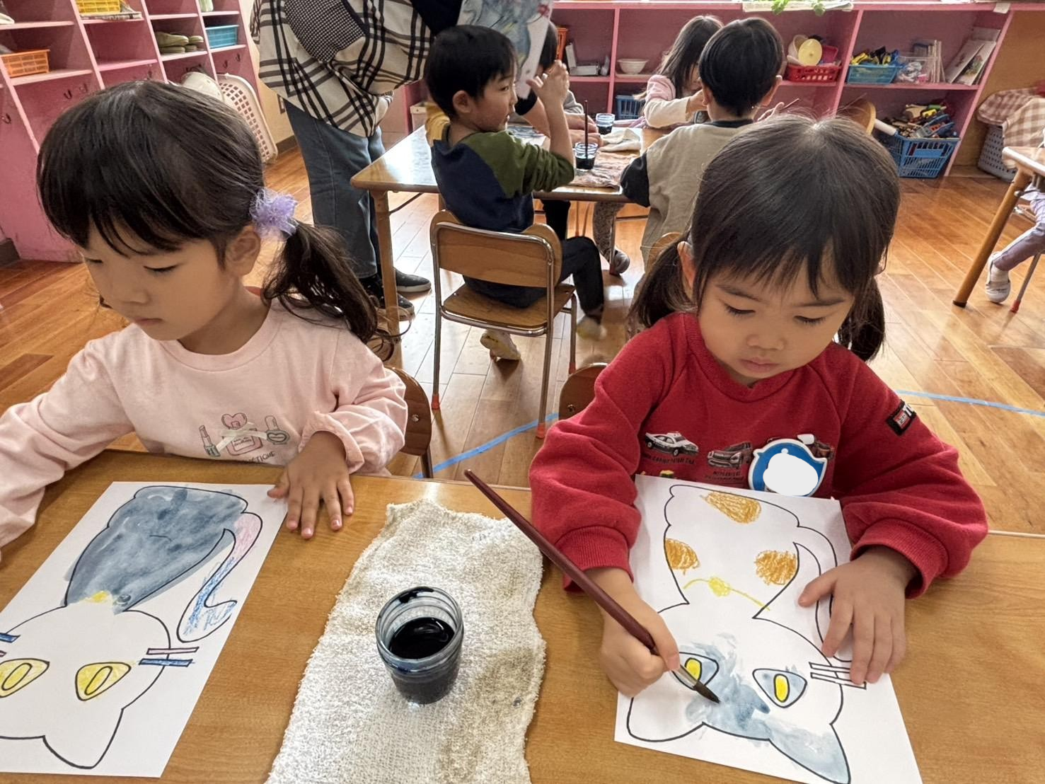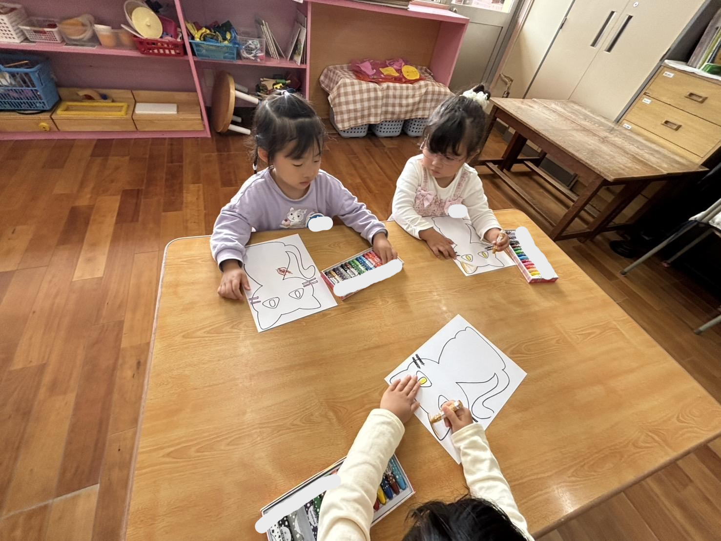 10月24日(金)、りす組ではハロウィンに向けて折り紙でお化けと猫のはじき絵をしました。