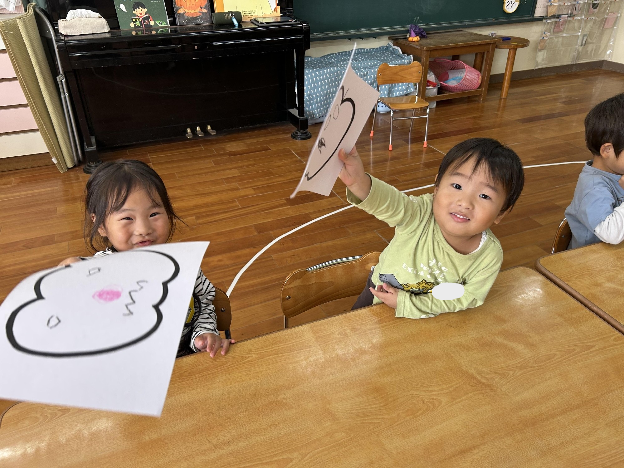 赤の絵の具と黄色の絵の具を混ぜるとオレンジ色、赤色と青色を混ぜると紫色と色が混ざって別の色に変化するところを、不思議そうに見ていましたよ☺