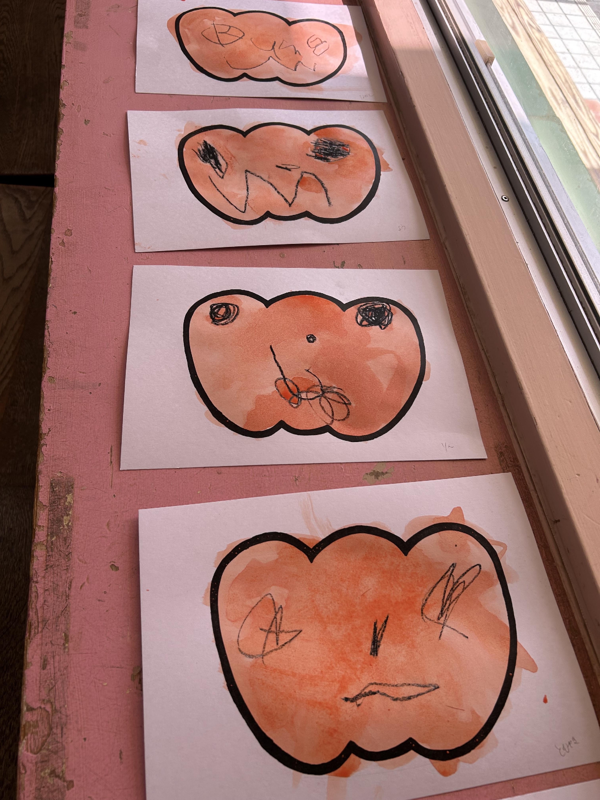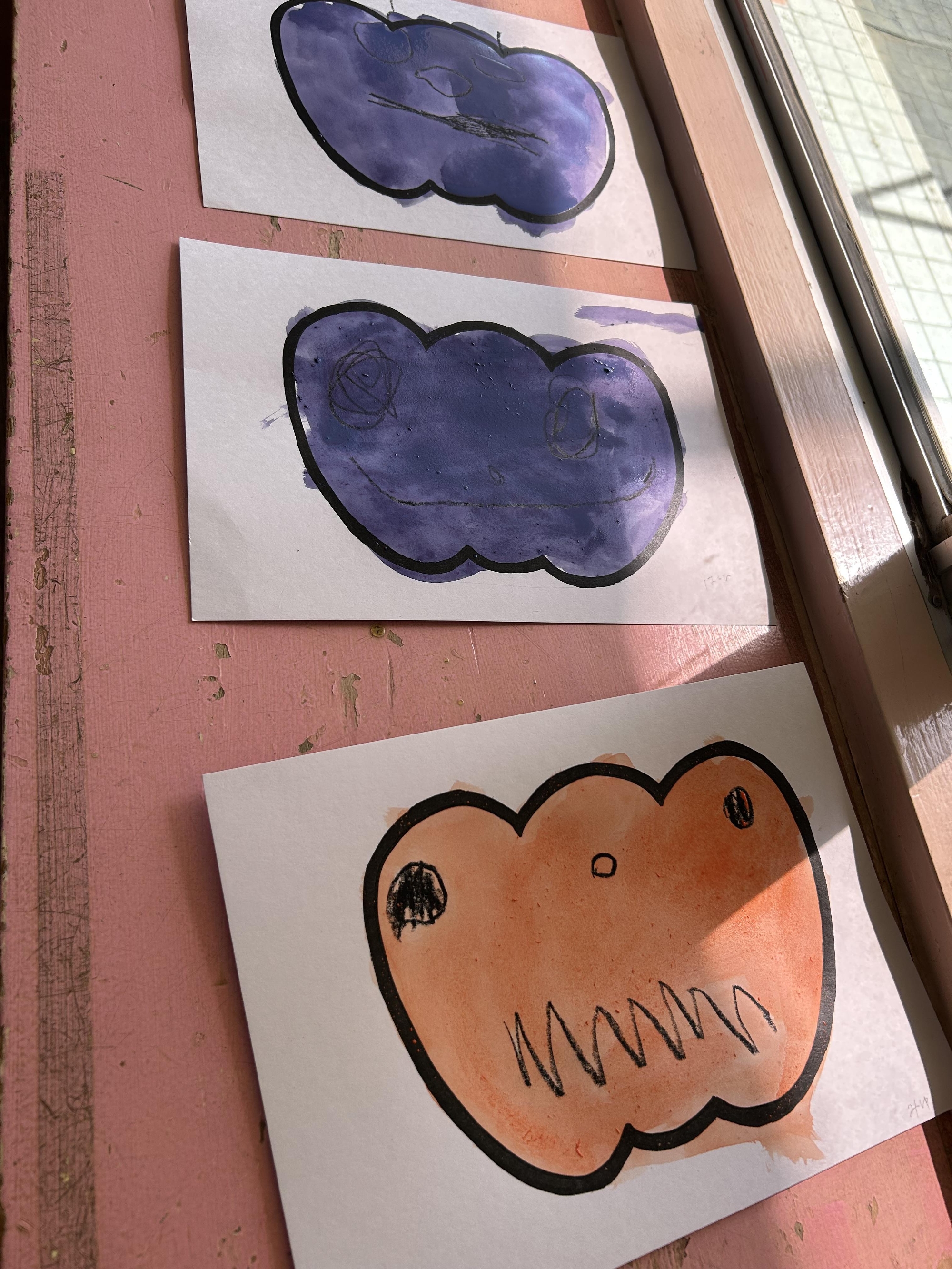 はじき絵は、クレヨンでこわーい顔を描いたあと、好きな色の絵の具で塗っていきました!