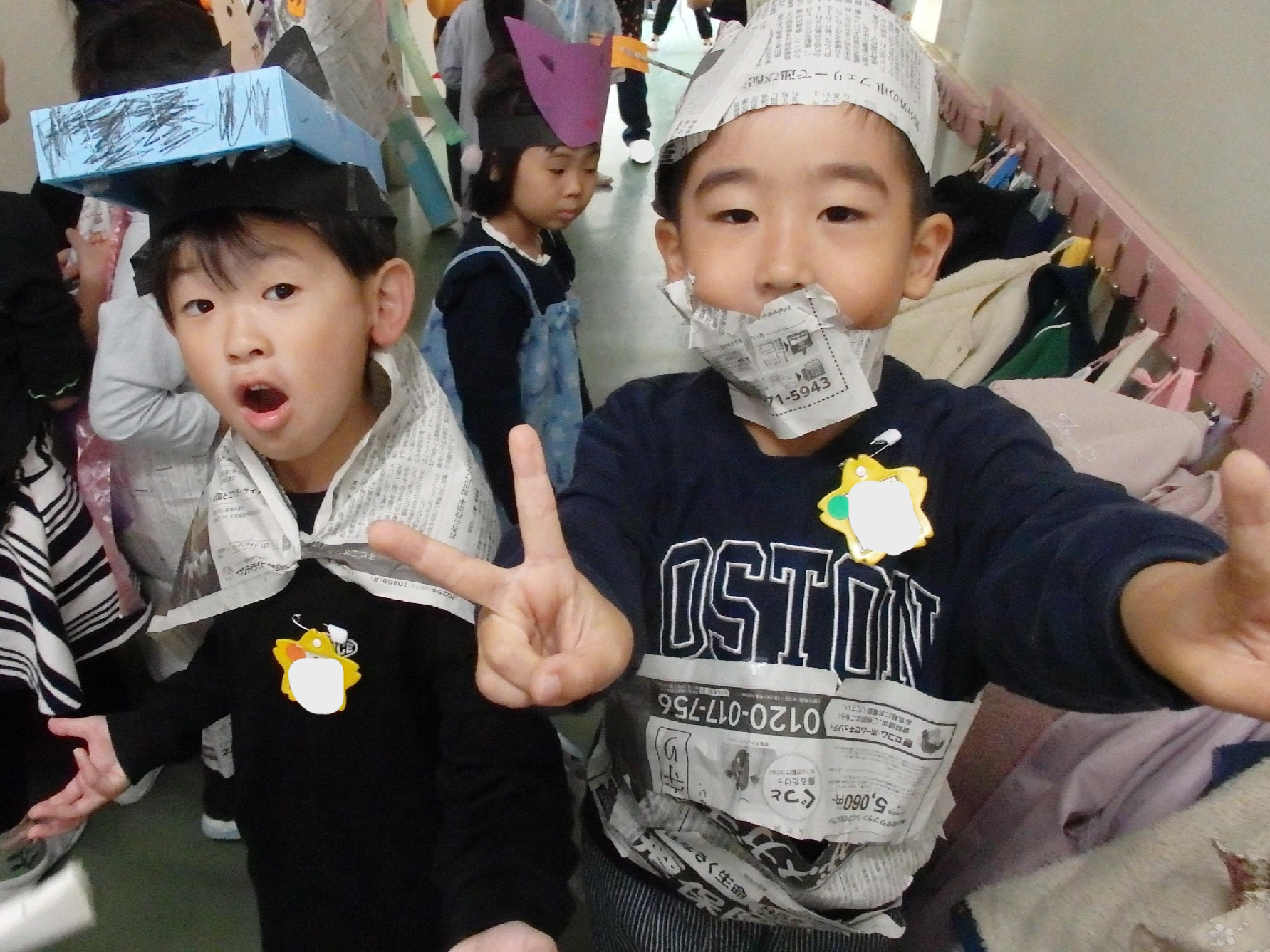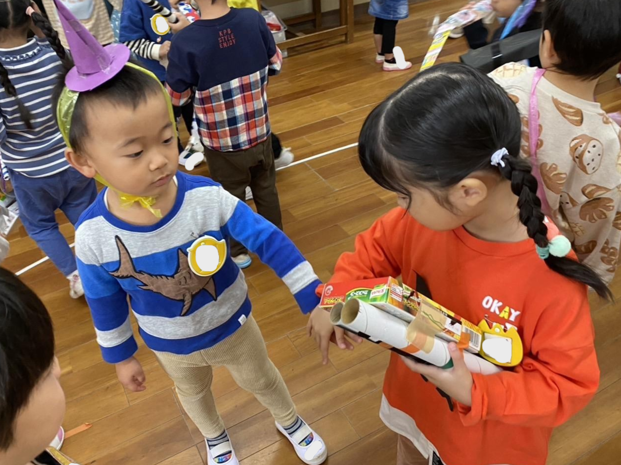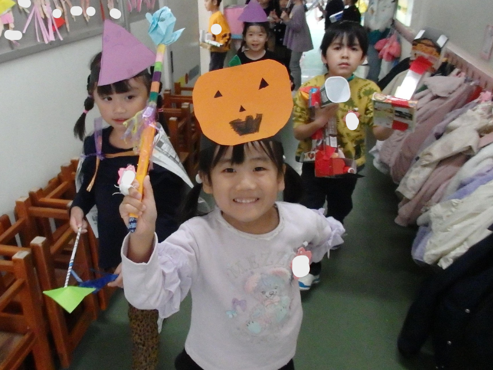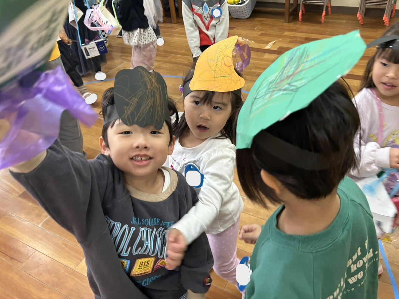 自分たちで作った仮装も、魔女になりきって帽子とほうきを身に付ける子や、猫になりきって耳を付けている子も!お互いの仮装を見て「可愛いね~!」「おばけみたいで怖いよ~!」と褒め合いながらハロウィンの雰囲気を楽しみました。