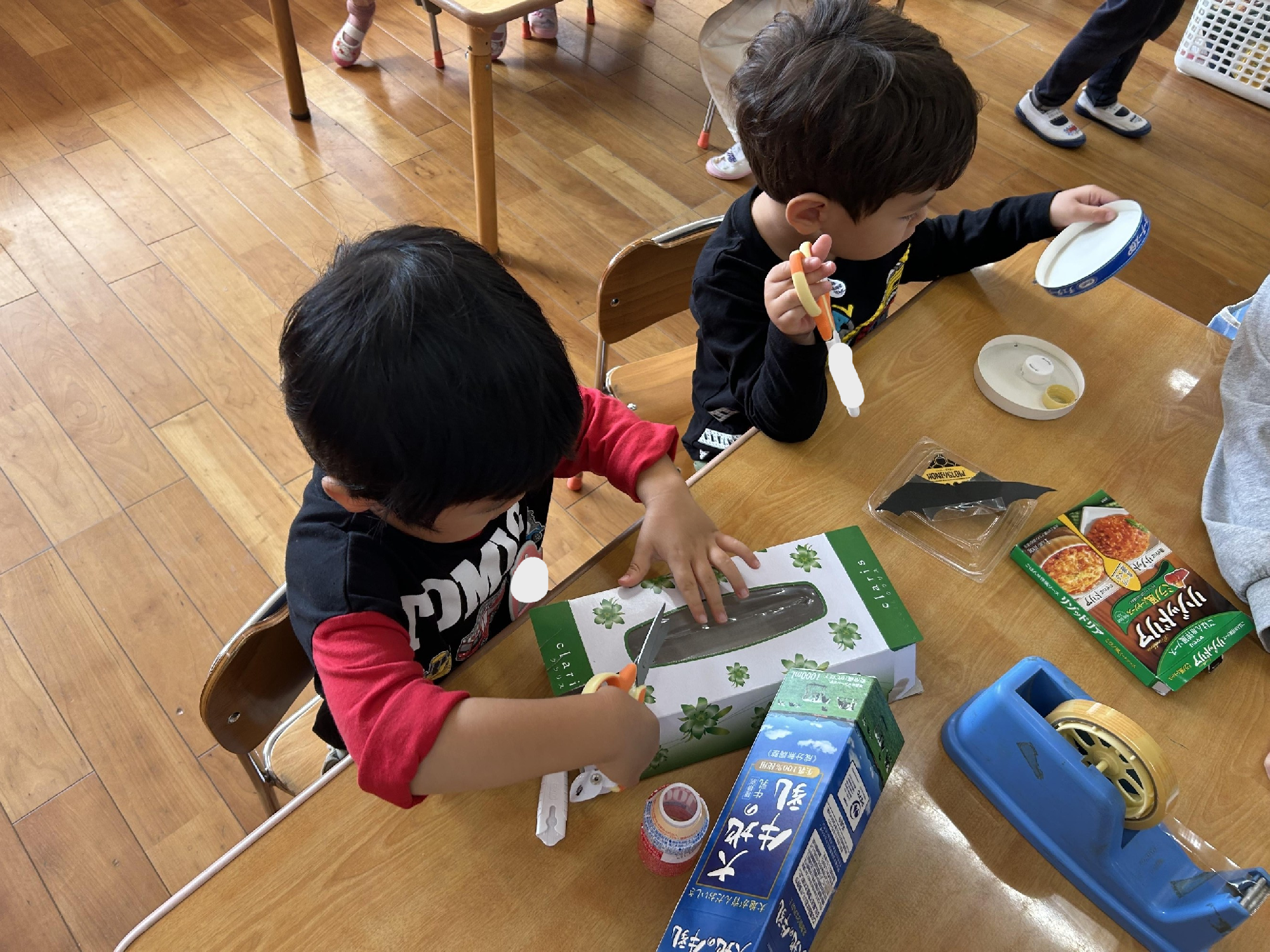 長さを考えてテープを切ったり、廃材をつなげて好きな形にしたりと、イメージを形にするために夢中で取り組んだ子どもたち。