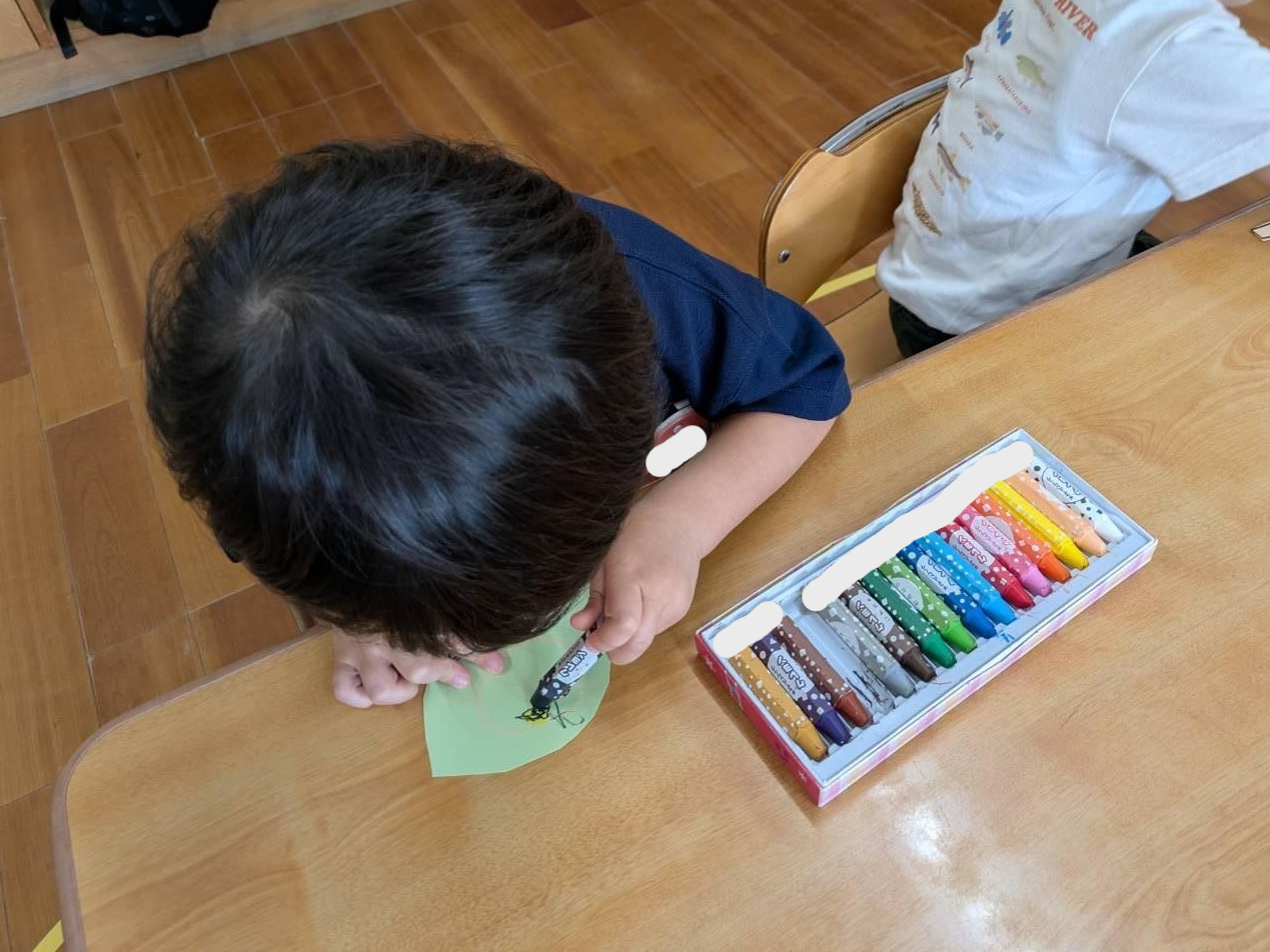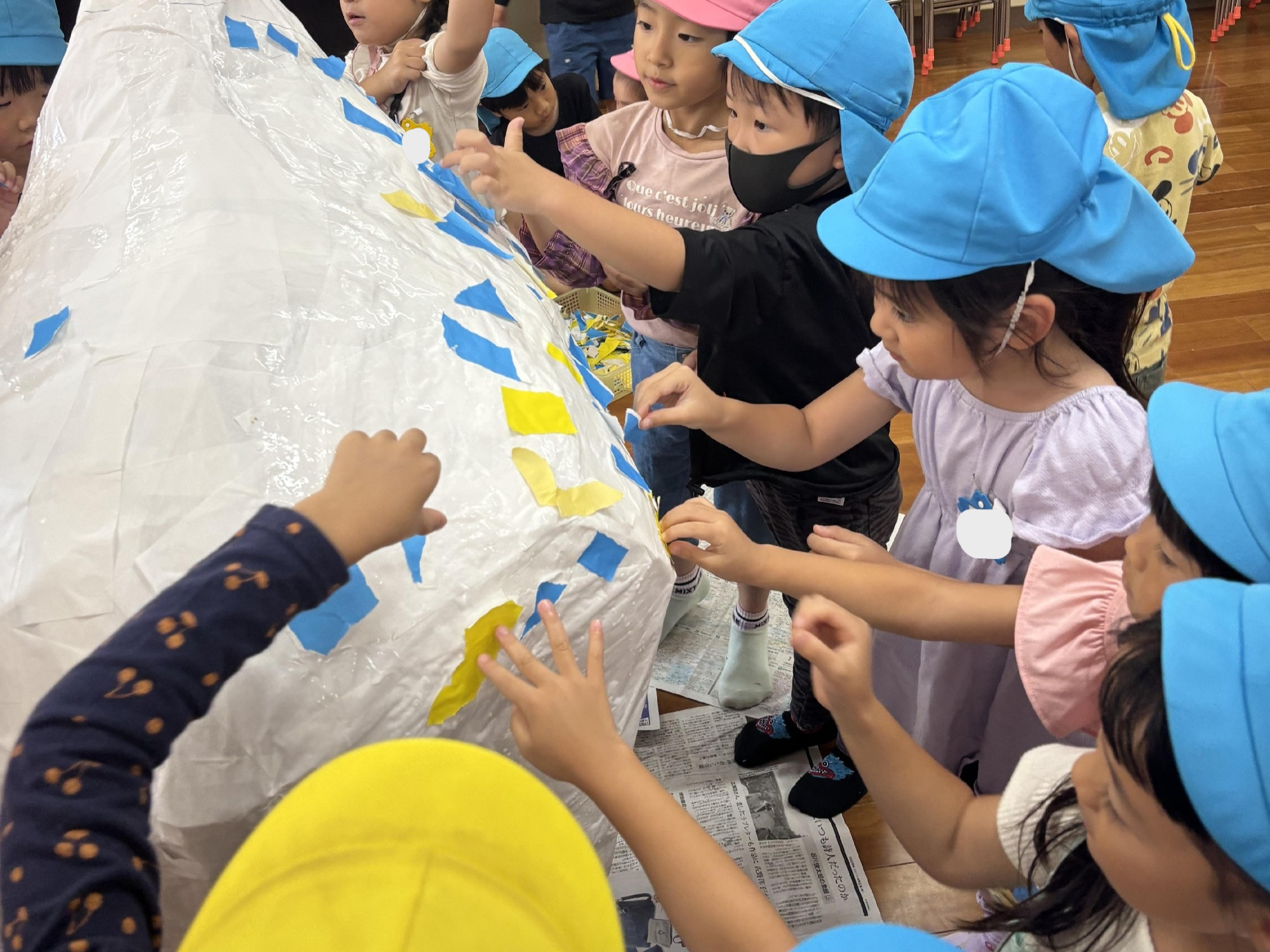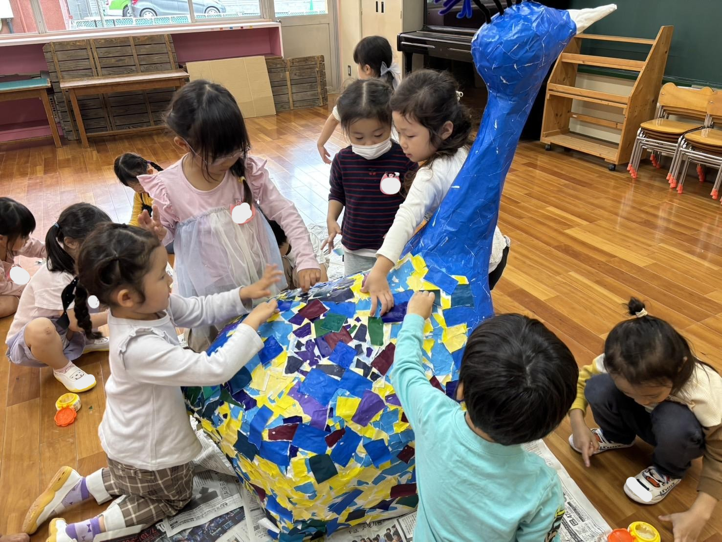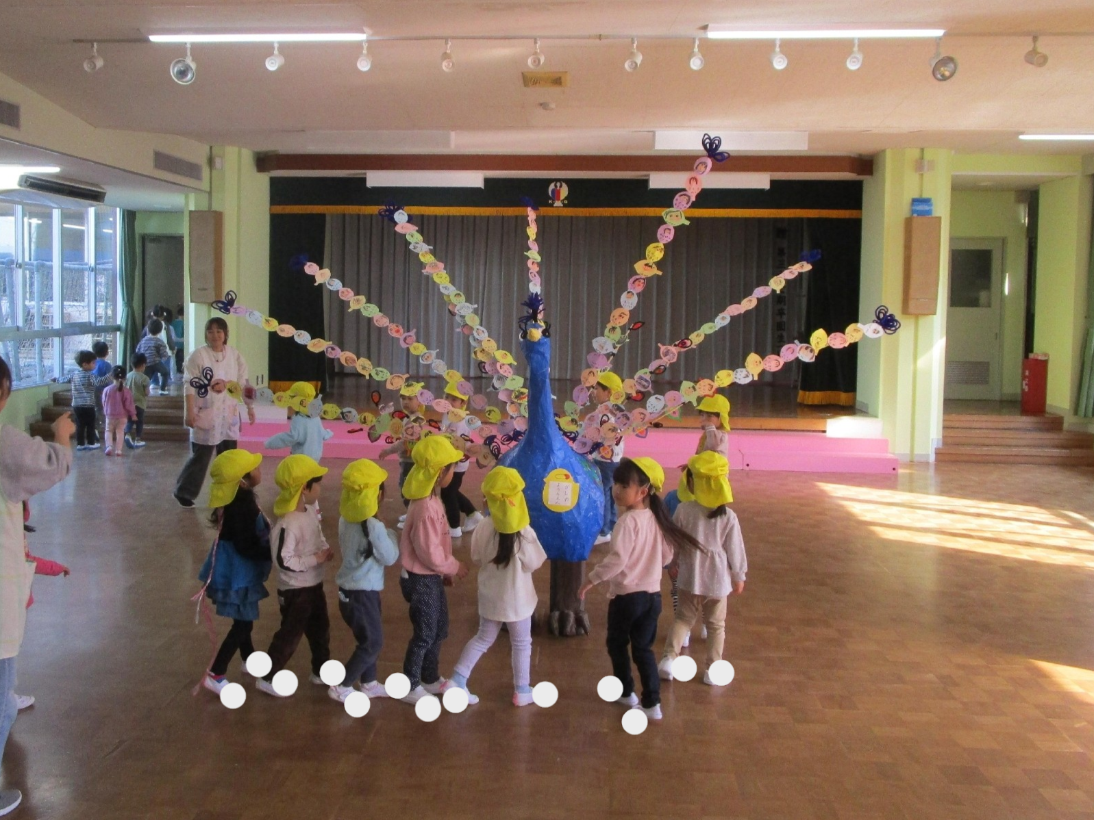 それに、年中と年長が折り紙を貼り付け、全園児が自分の顔を描き、それが『くじゃく』の羽になりました😊