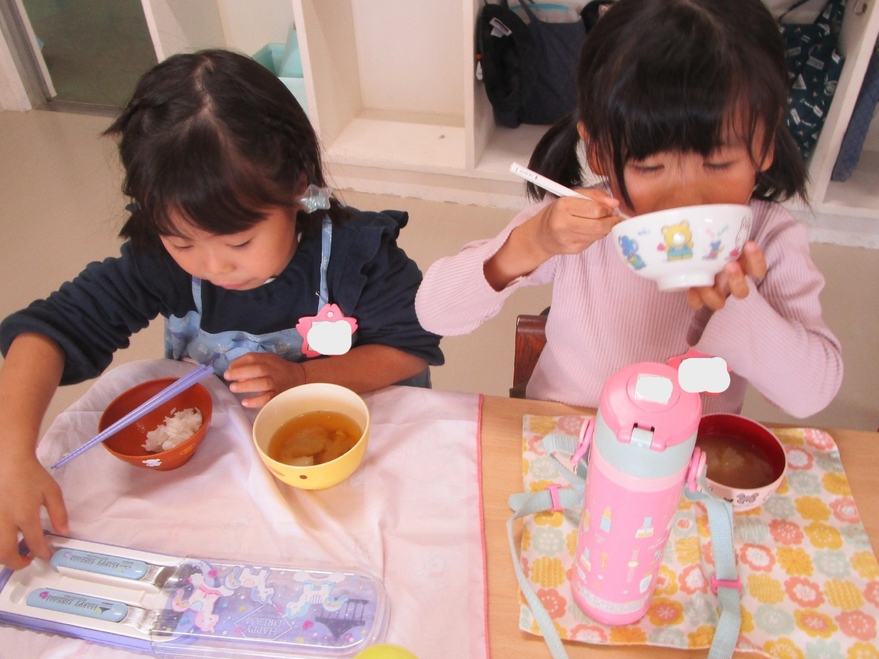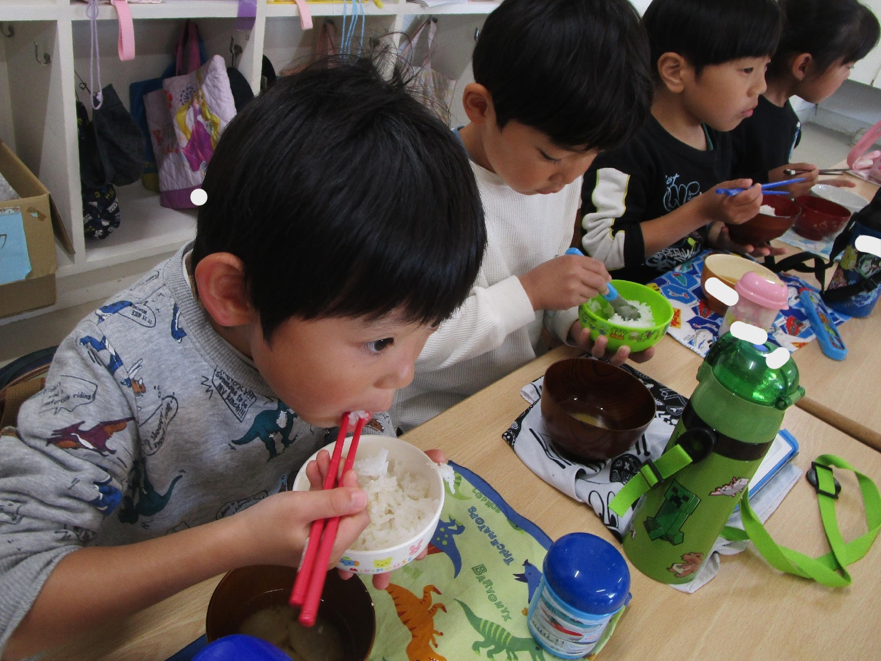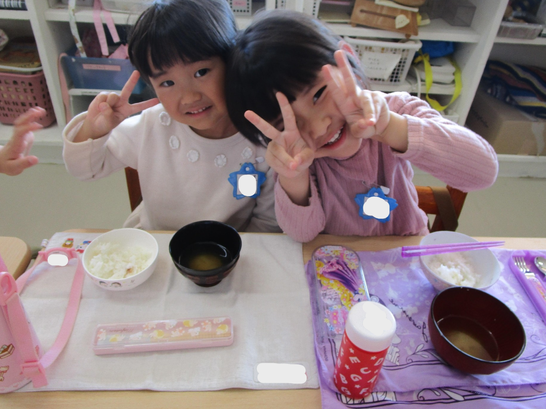 部屋に戻り、茶碗とお椀の配置をみんなで確認してから「いただきます!」