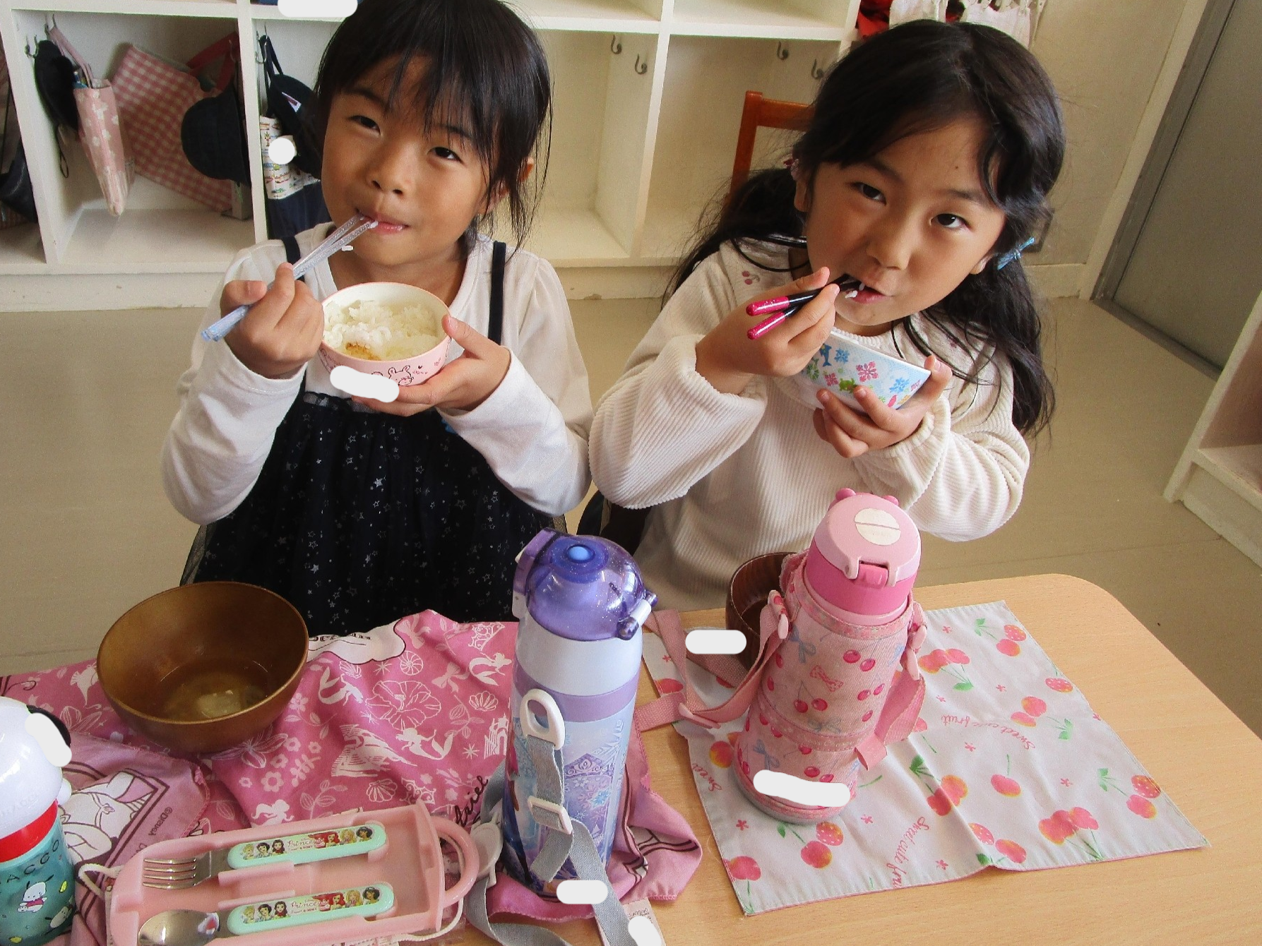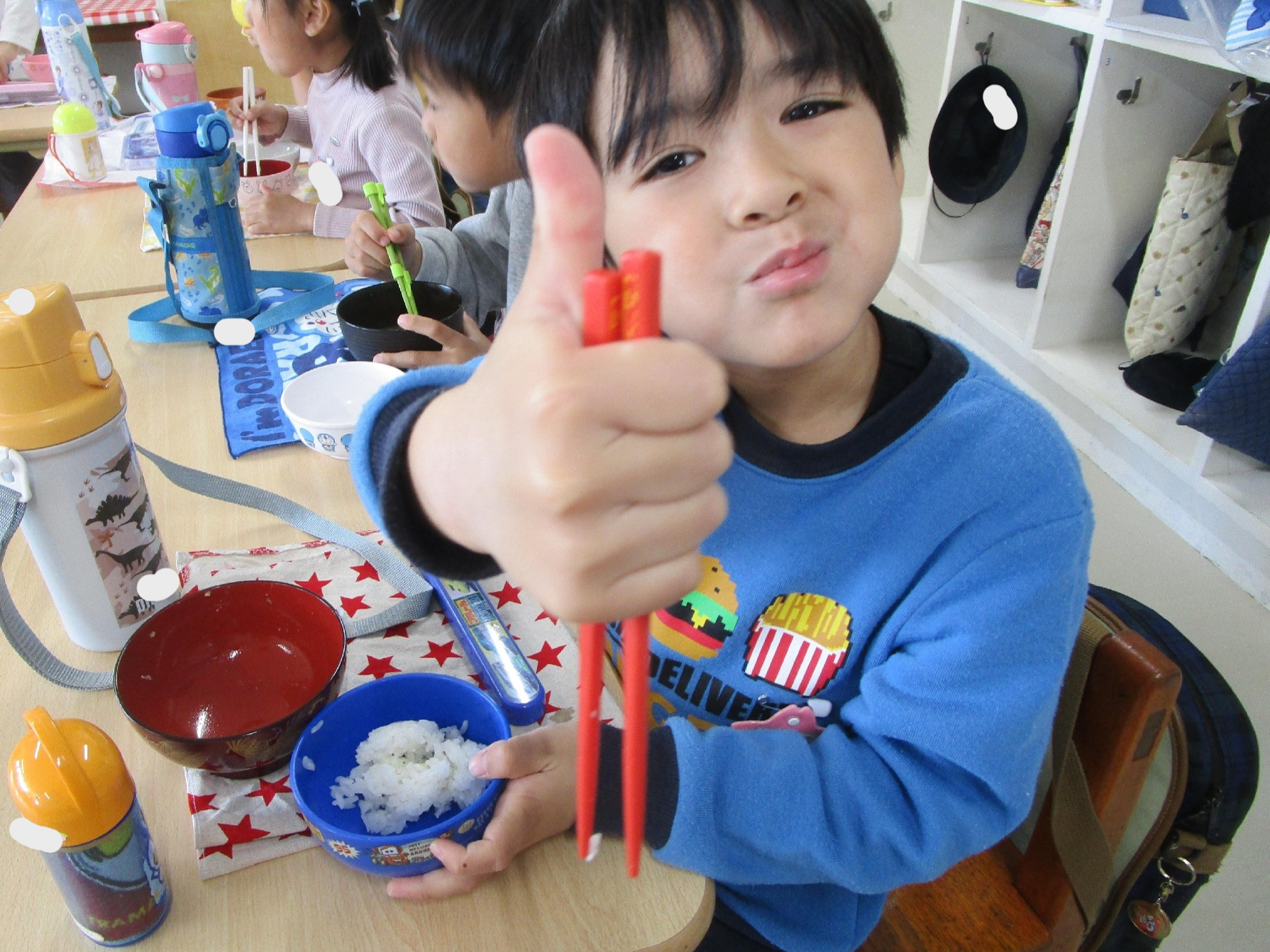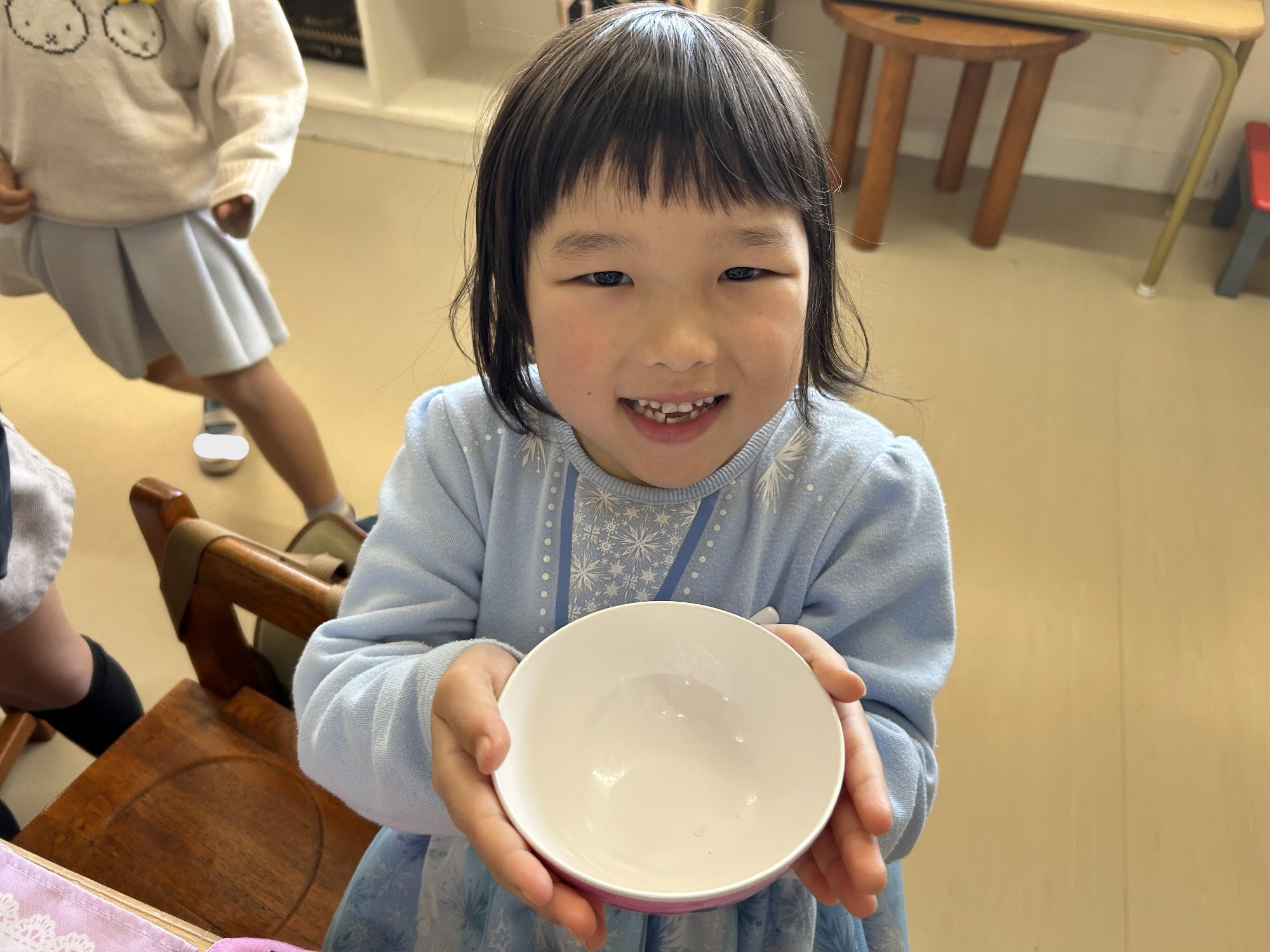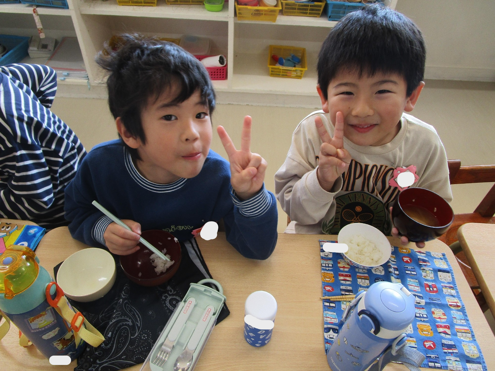 部屋に戻り、茶碗とお椀の配置をみんなで確認してから「いただきます!」