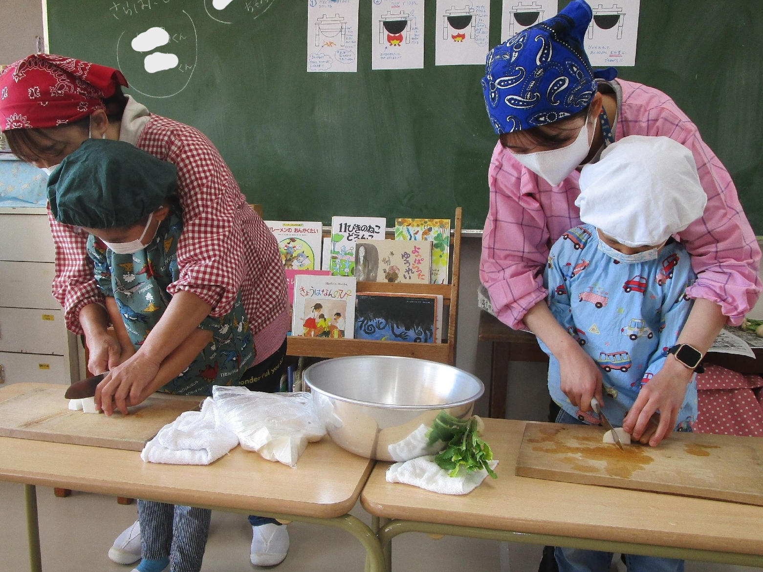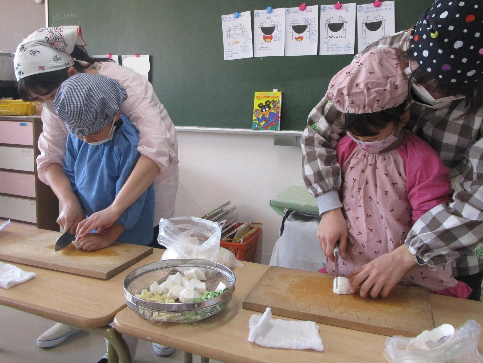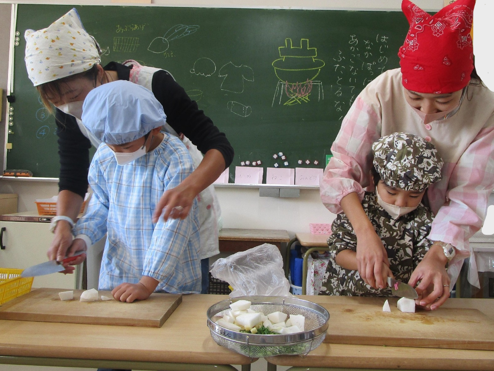 当日の朝、まずは各クラスで味噌汁に入れるかぶの野菜切りを行いました。