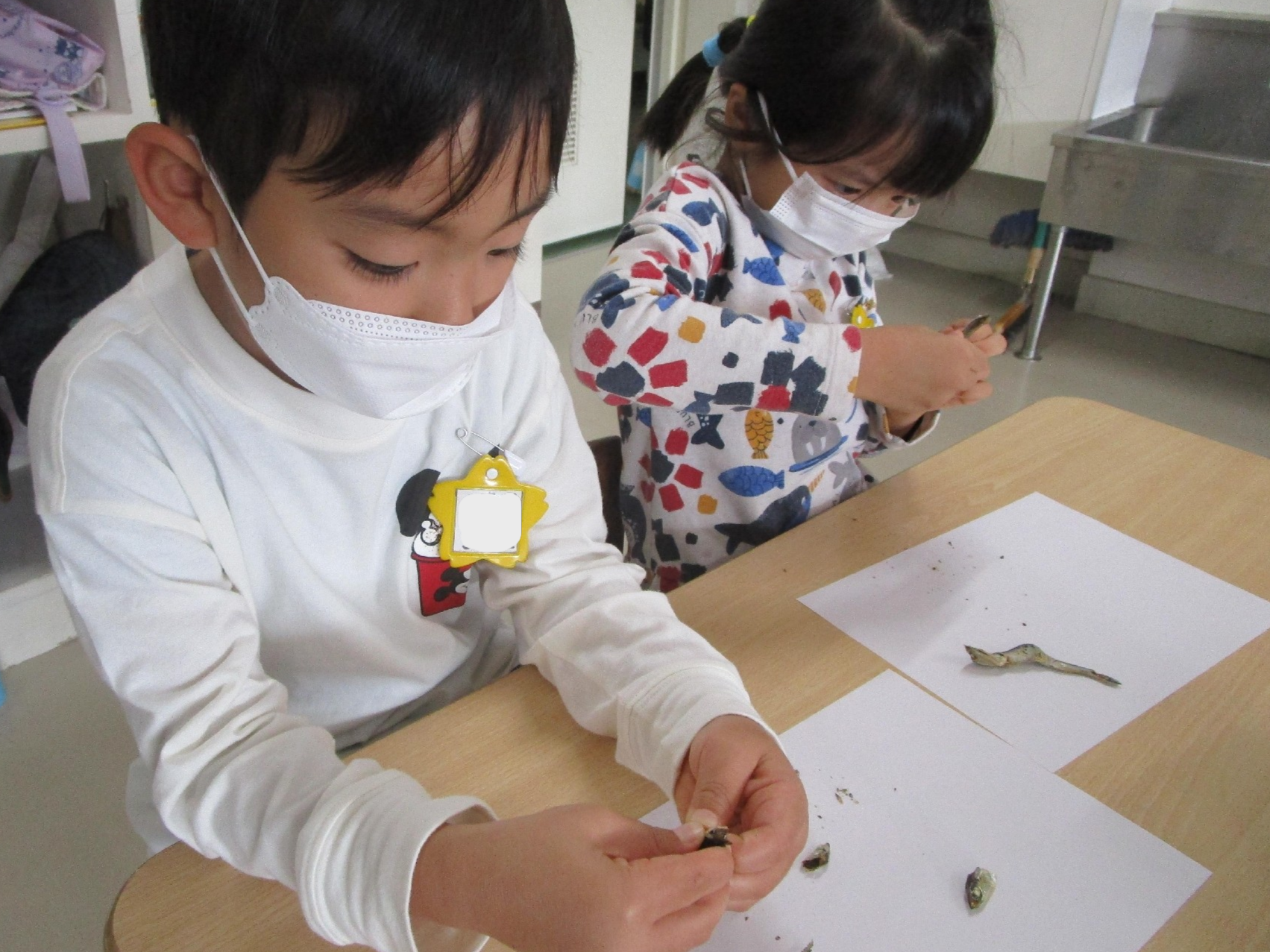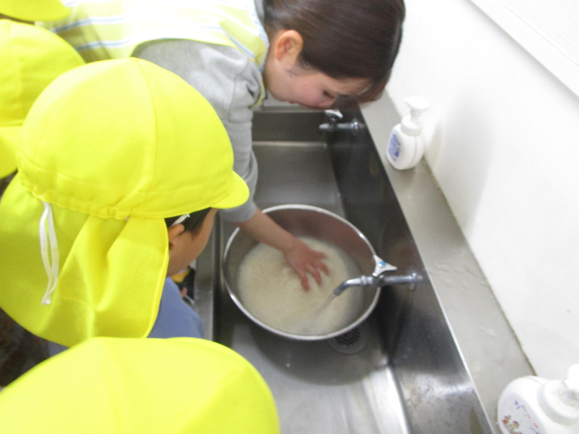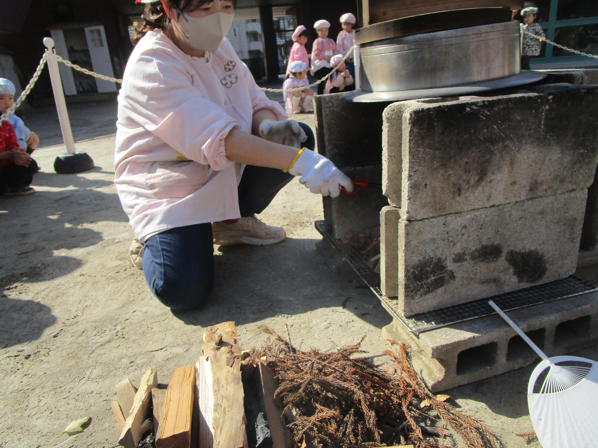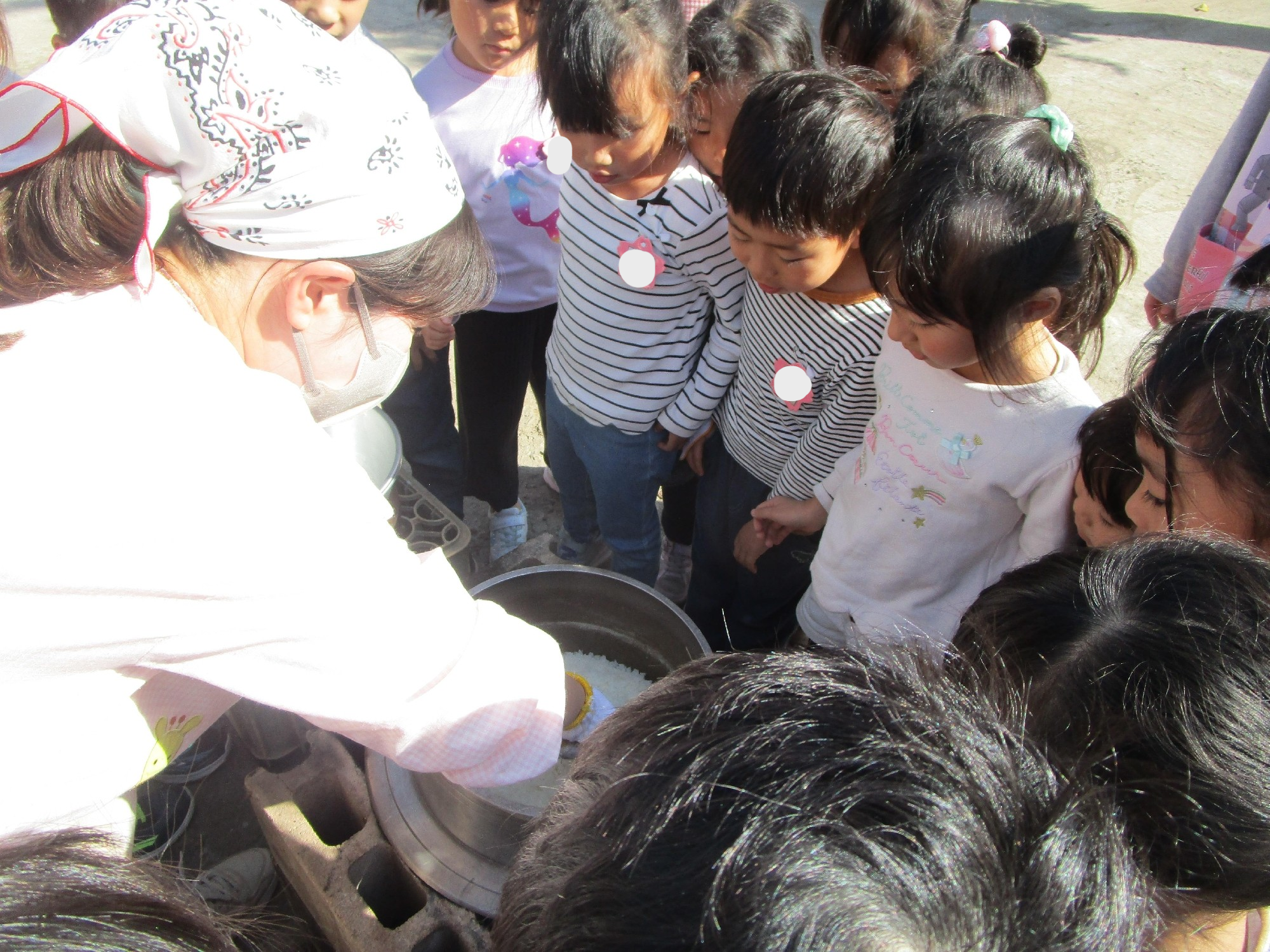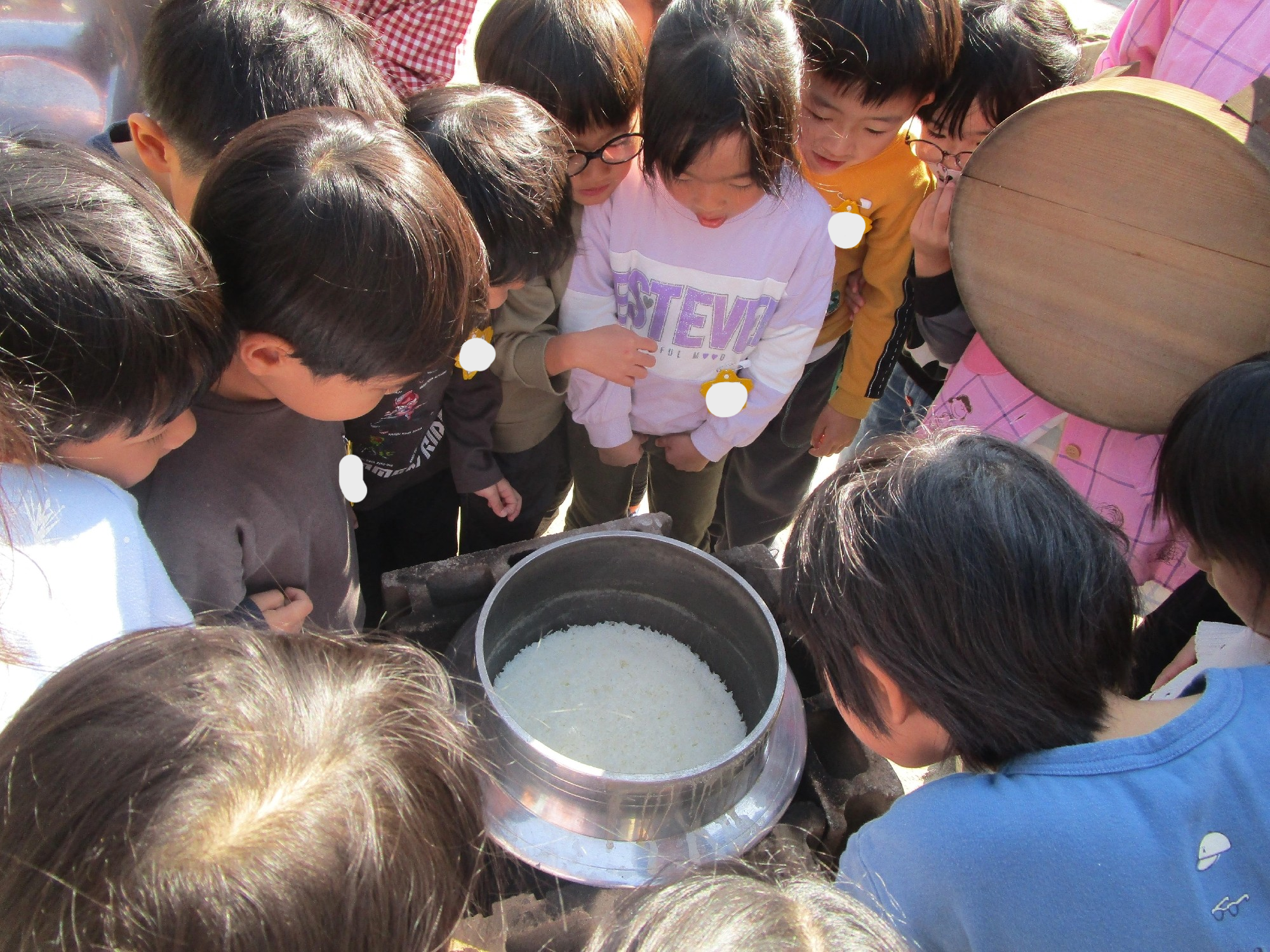 「湯気がでてきた!」「ブクブクしてる!」「始めチョロチョロ中パッパ。ブツブツ言ったら火を引いて赤子泣いてもふたとるな」等、変化に気付きながら、子ども達は見守っていました。