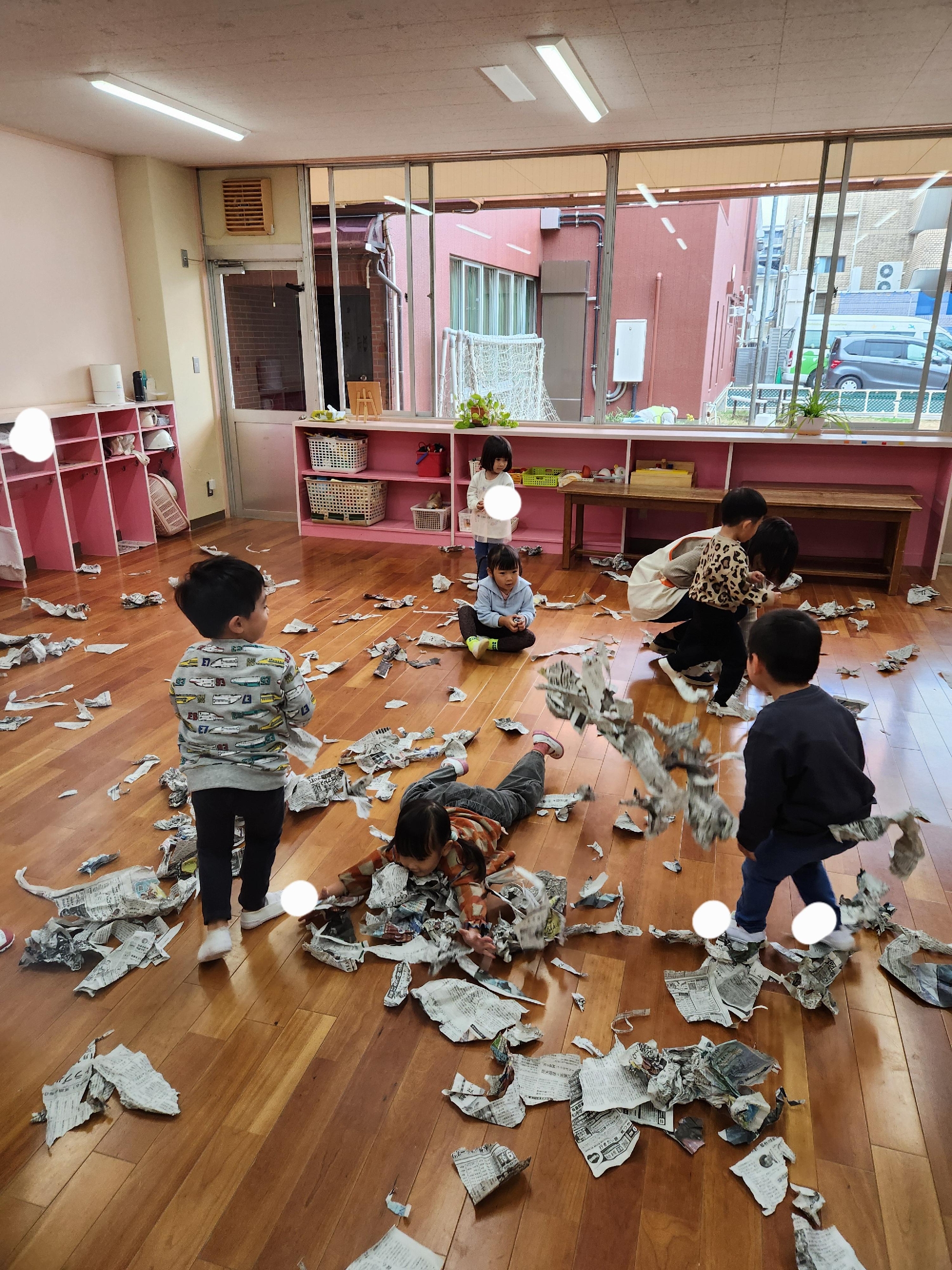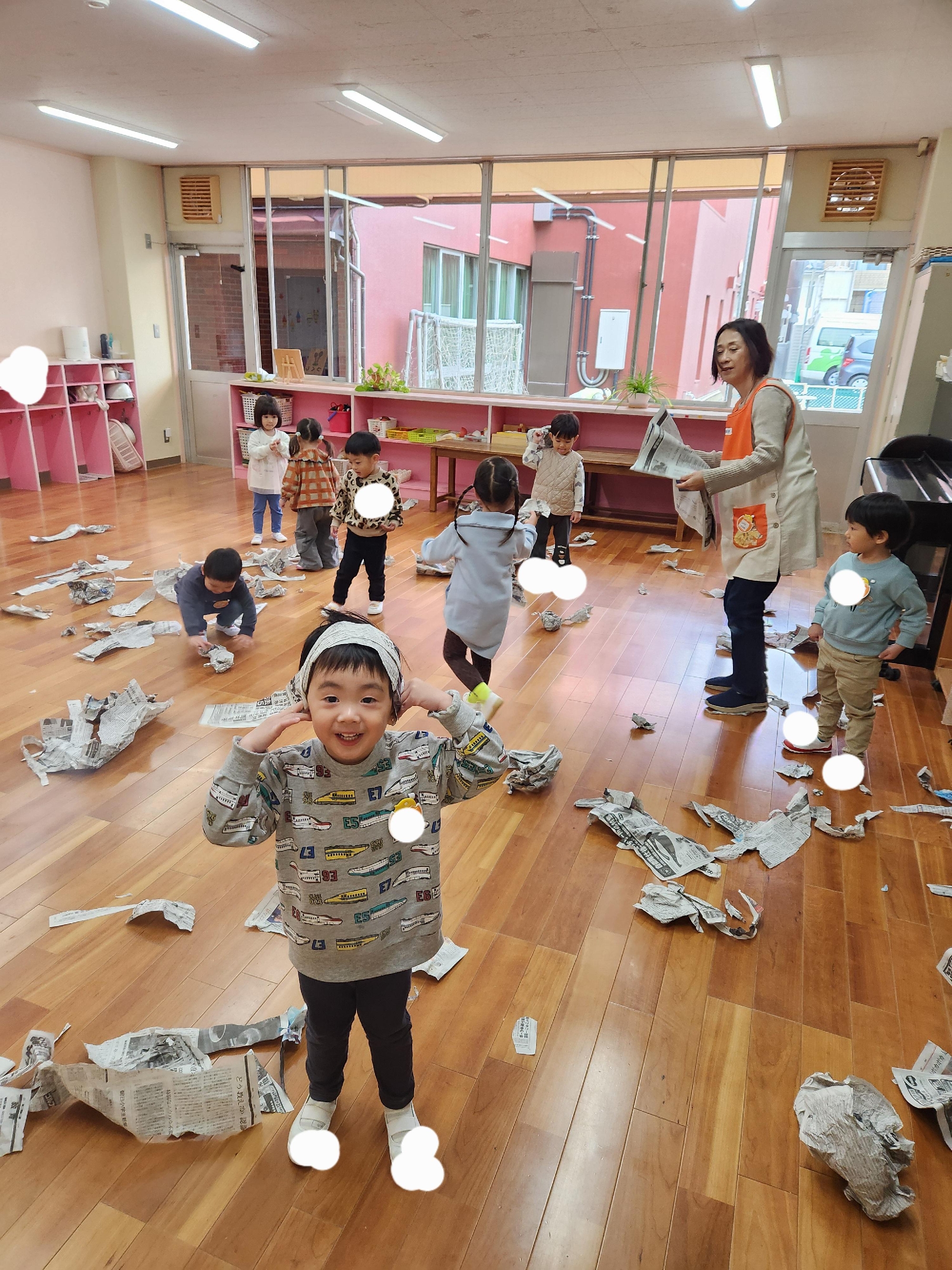 新聞紙が半分にさけると「キャー(^o^)/」と、「もっとやりたい!!」と子どもたち大喜び❤