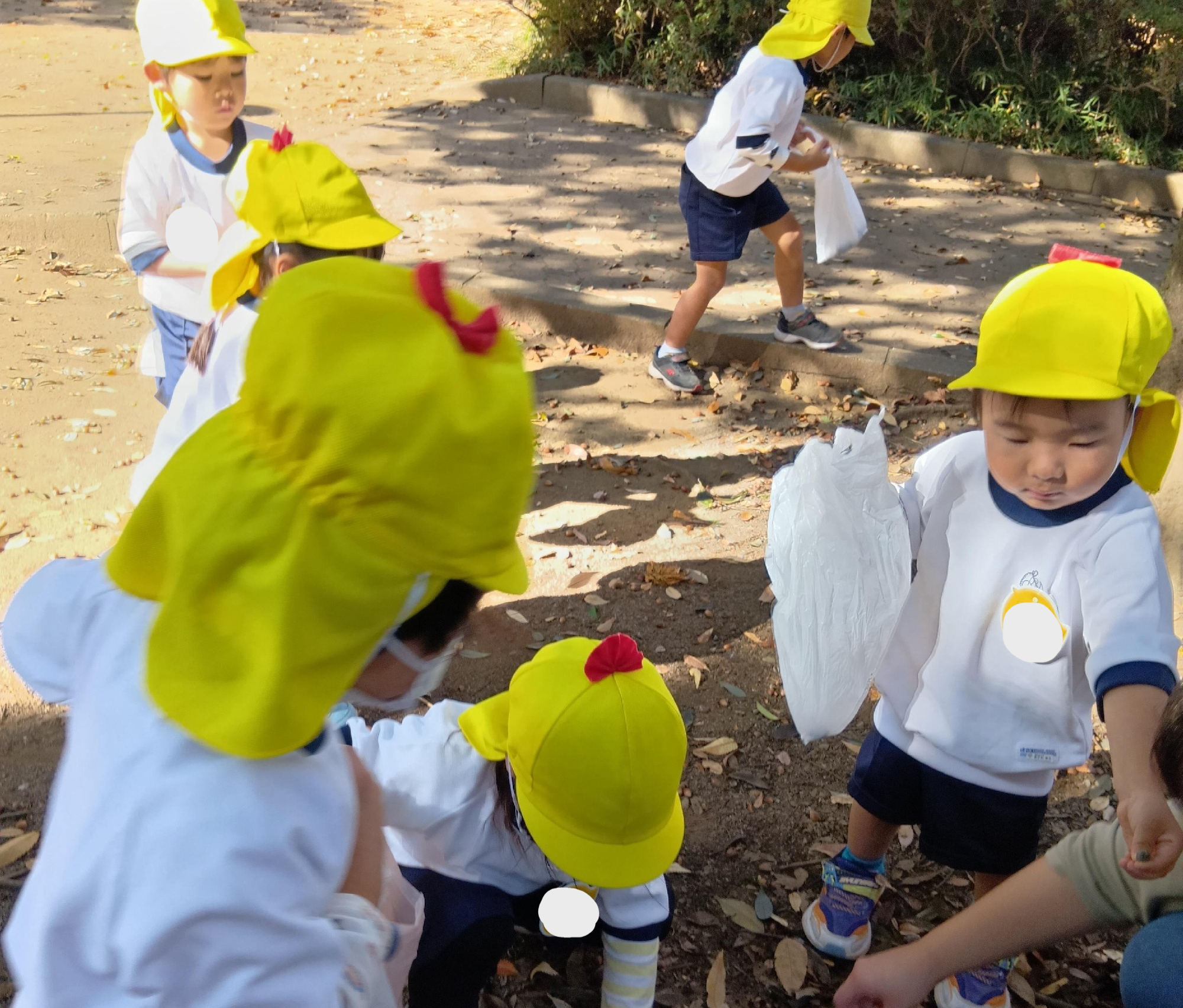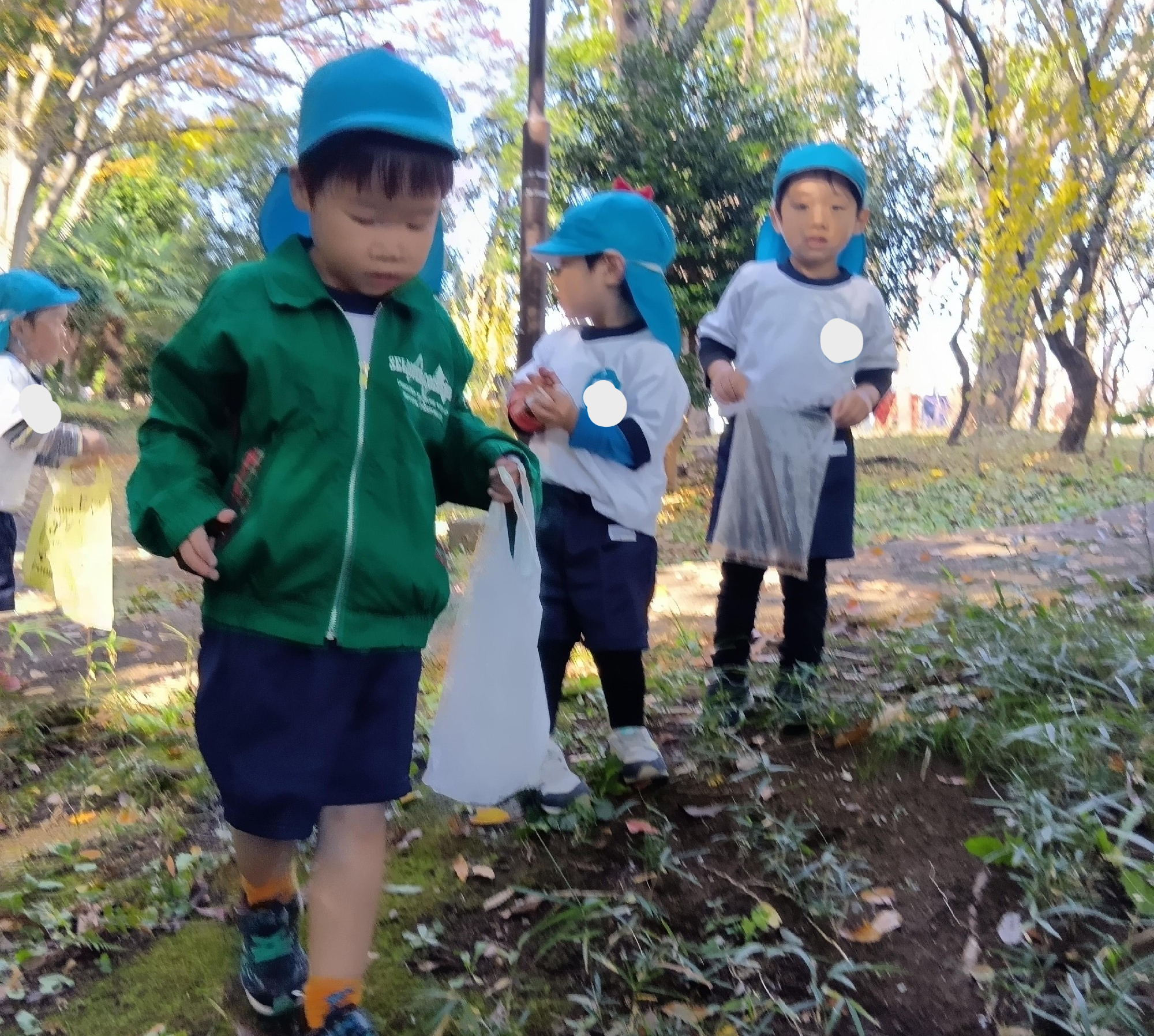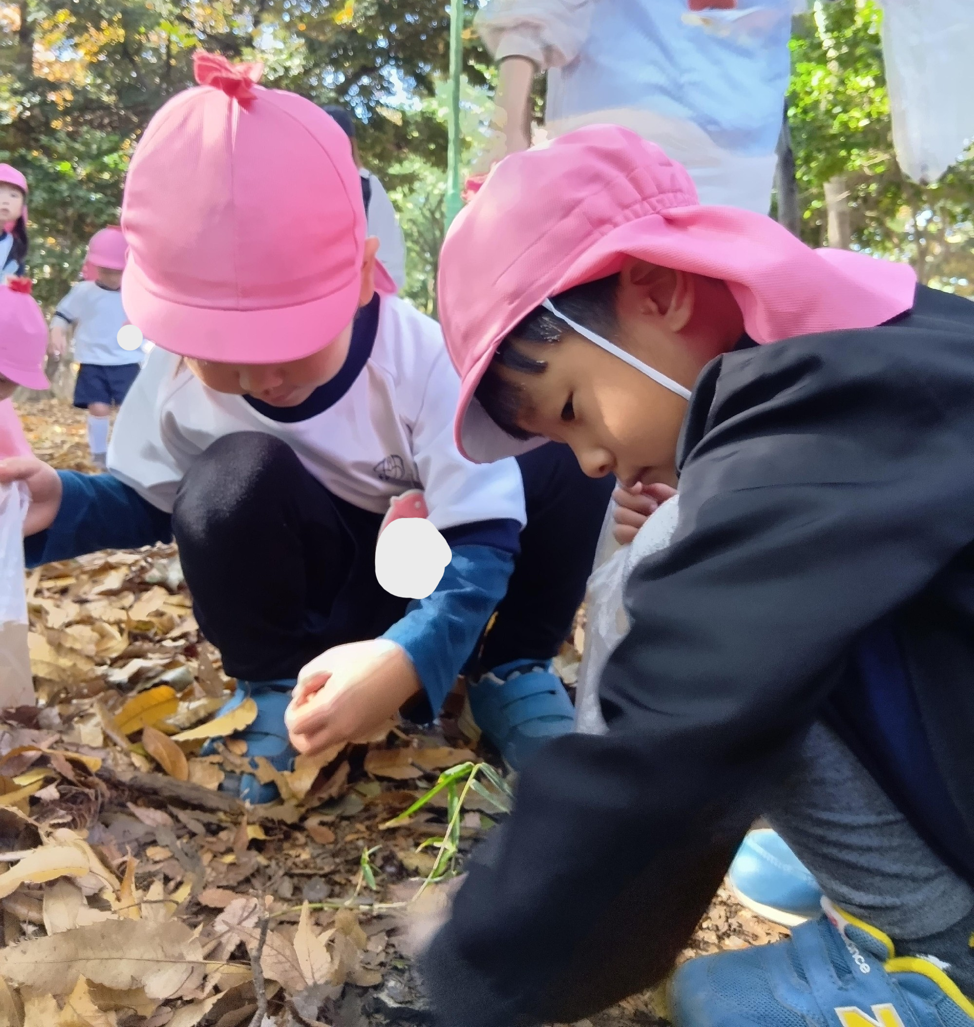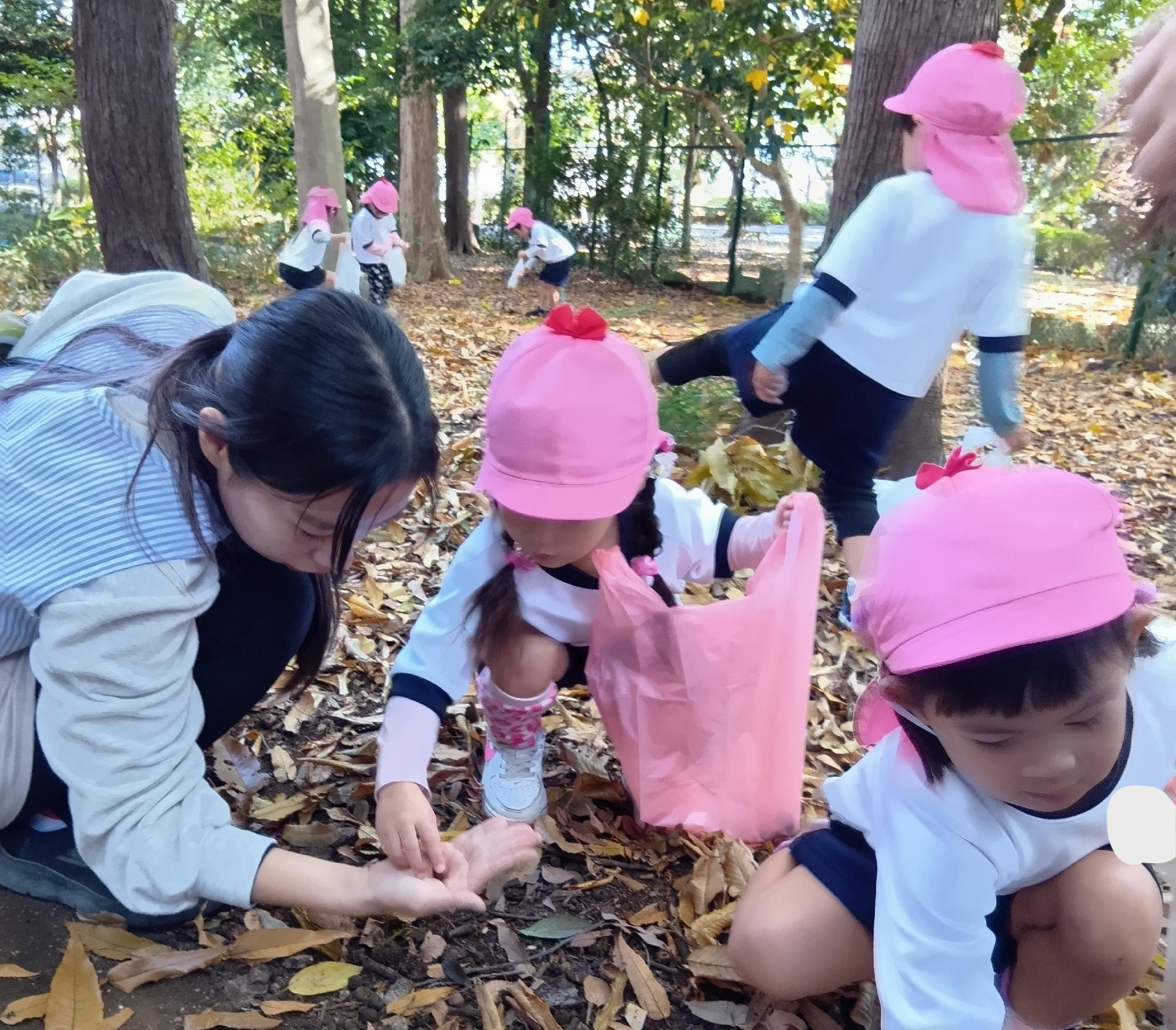 公園ではたくさんの種類のどんぐりが。もじゃもじゃ帽子でまんまるのくぬぎ、しましま帽子でまるっこいしらかし、とげとげ帽子でとんがってるすだじいなど、どんぐりの形の違いに気づいて、大興奮の子どもたちでした!!
