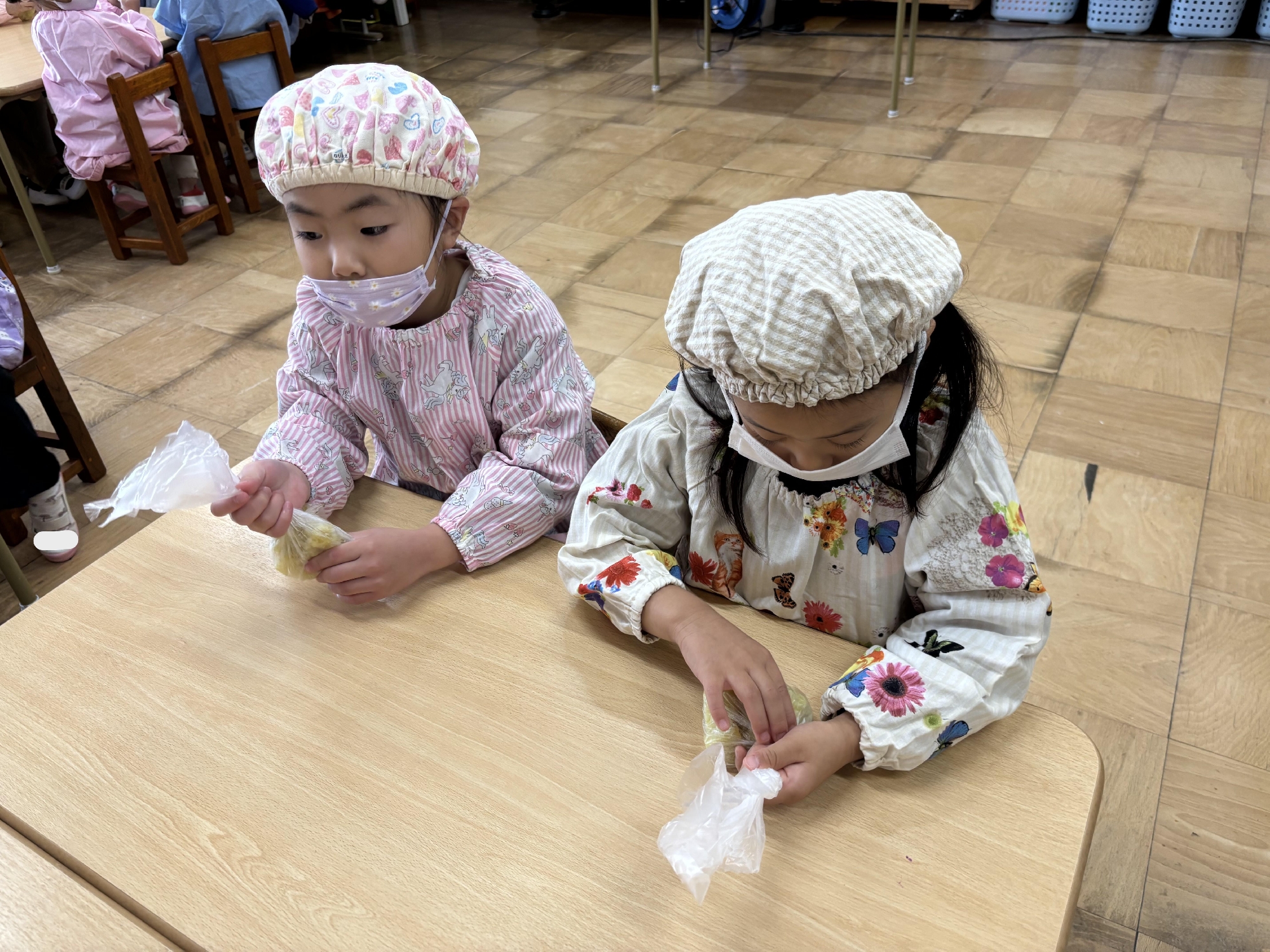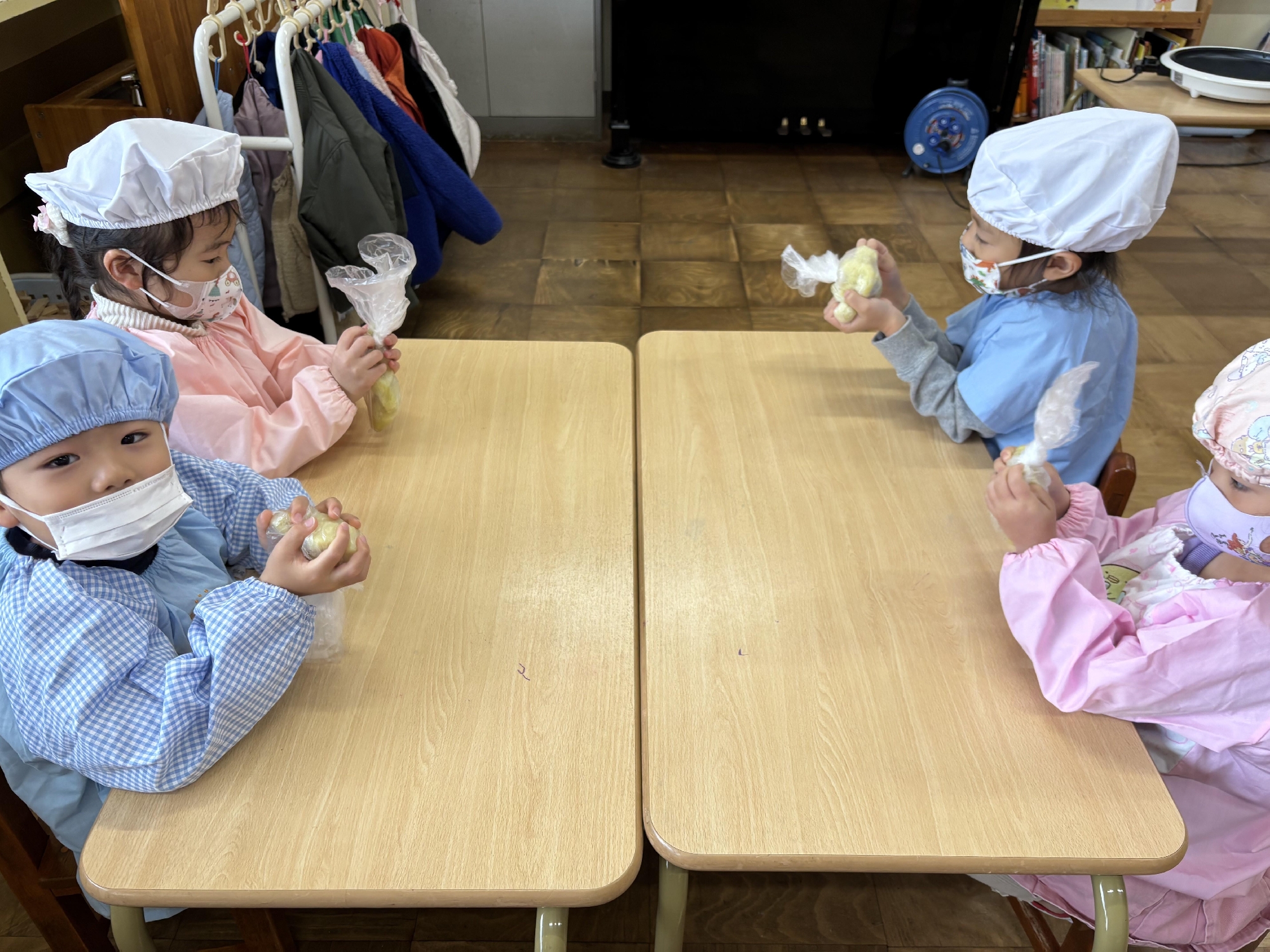11月25日(火)にらいおん組、27日(木)にきりん組、12月2日(火)にぞう組で木村農園で収穫したさつまいもを使って、「いももち作り」をしました。