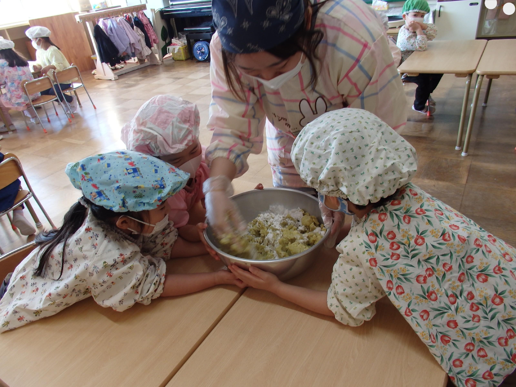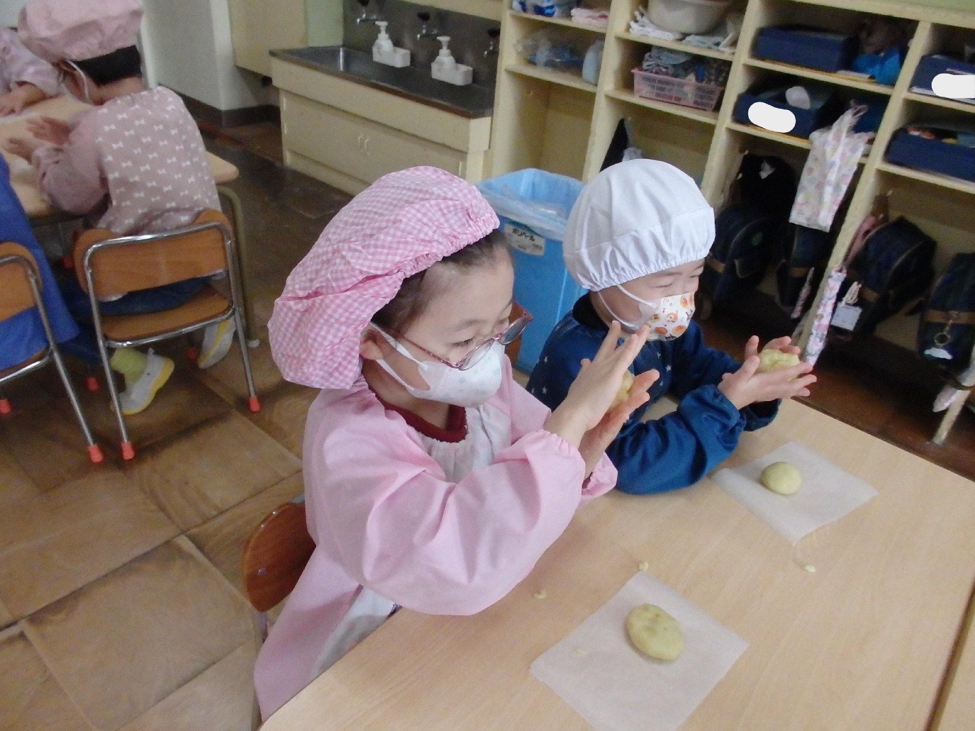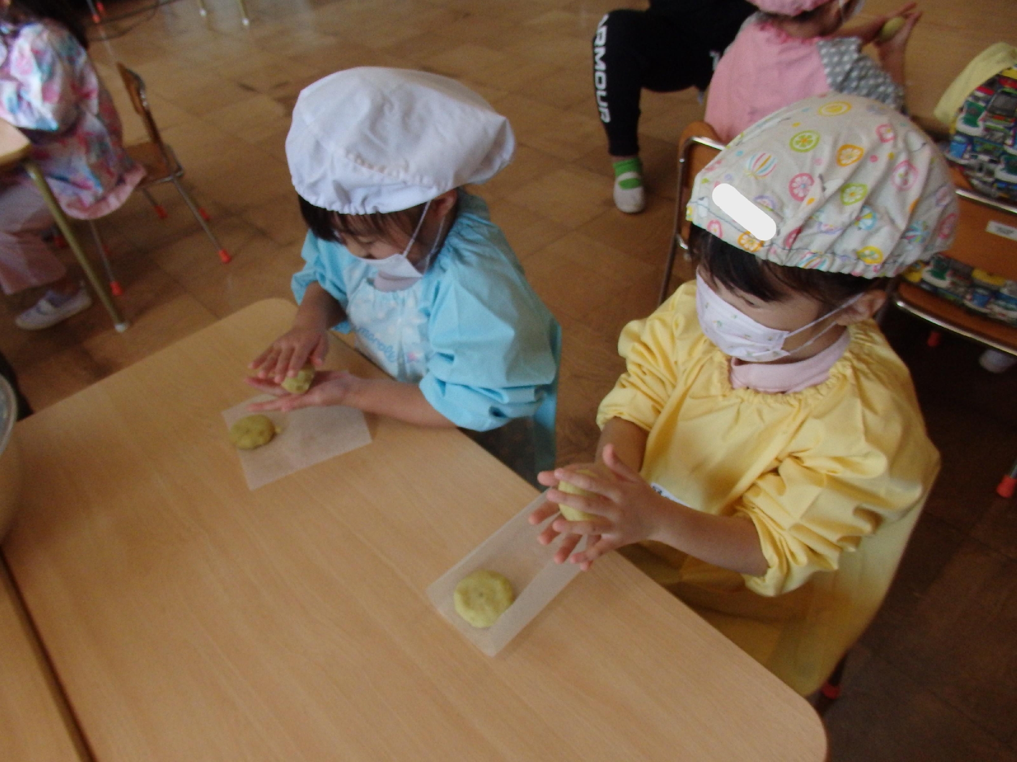 つぶしたさつまいもの中に片栗粉と砂糖を入れたらどうなるのか⁈と子ども達にクイズを出し、担任が混ぜましたが、ボール押さえは子ども達の仕事です。