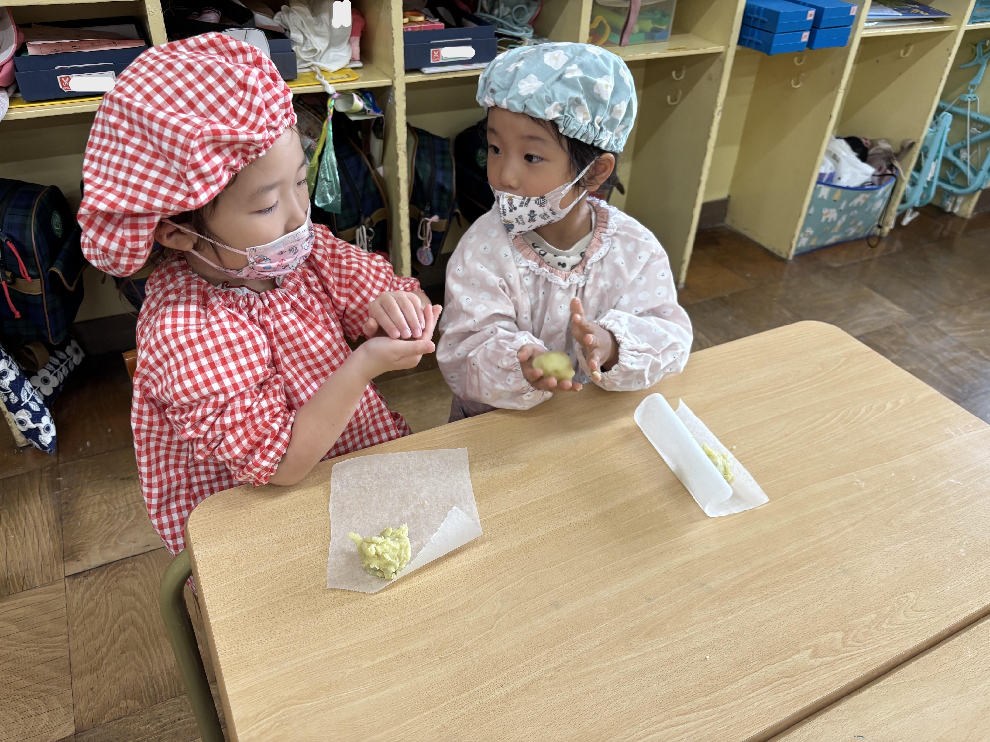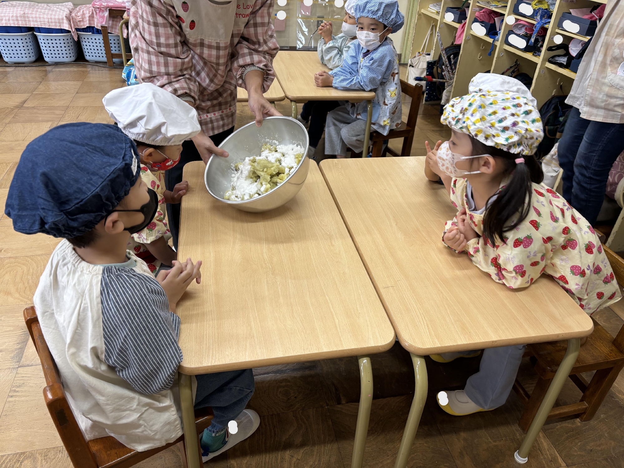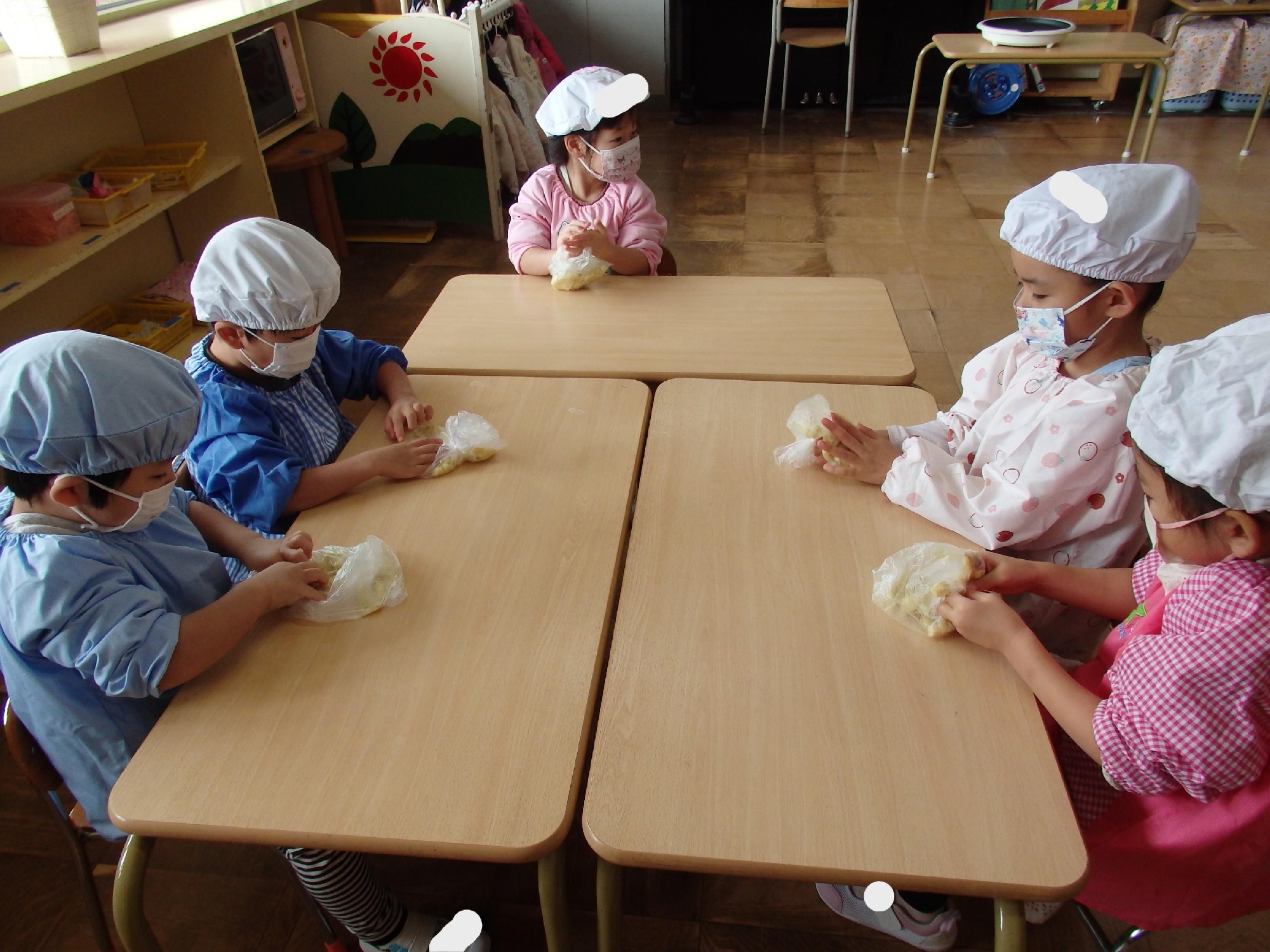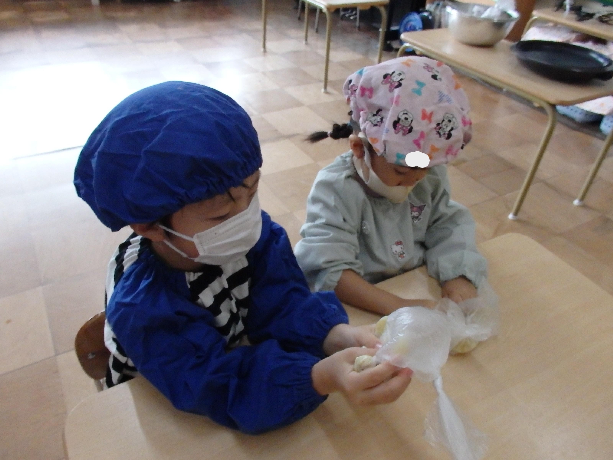 つぶしたさつまいもの中に片栗粉と砂糖を入れたらどうなるのか⁈と子ども達にクイズを出し、担任が混ぜましたが、ボール押さえは子ども達の仕事です。