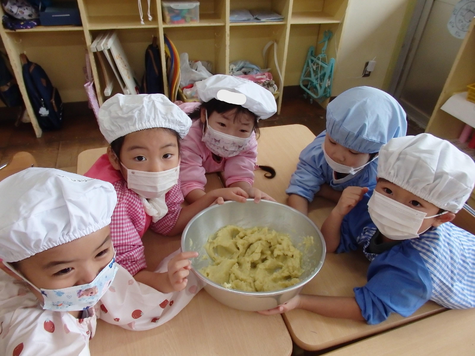 担任が切り、あく抜きしたものを茹で、茹でたさつまいもを子ども達がつぶしました。