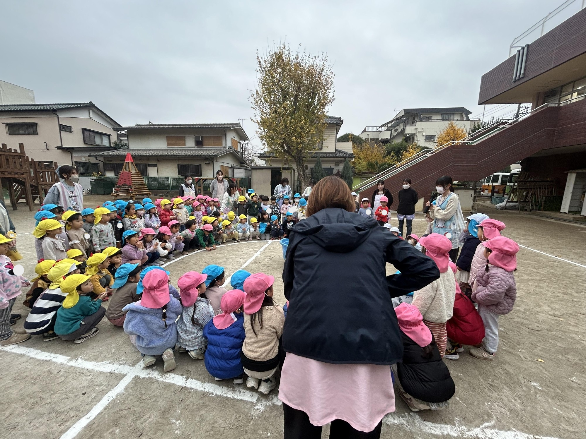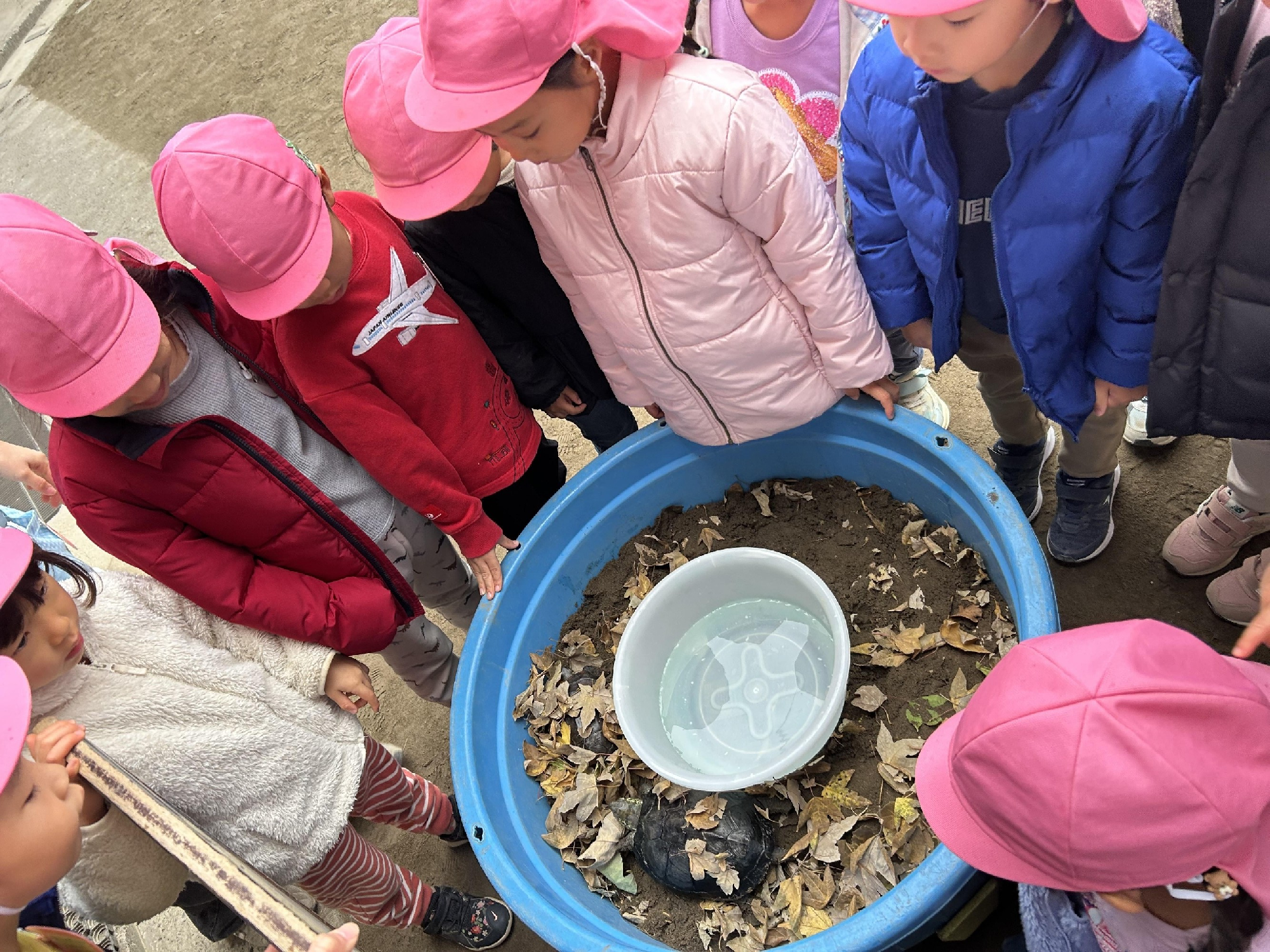みんなで園庭に集まり、けんちゃんとげんちゃんの冬眠を見届けました!
