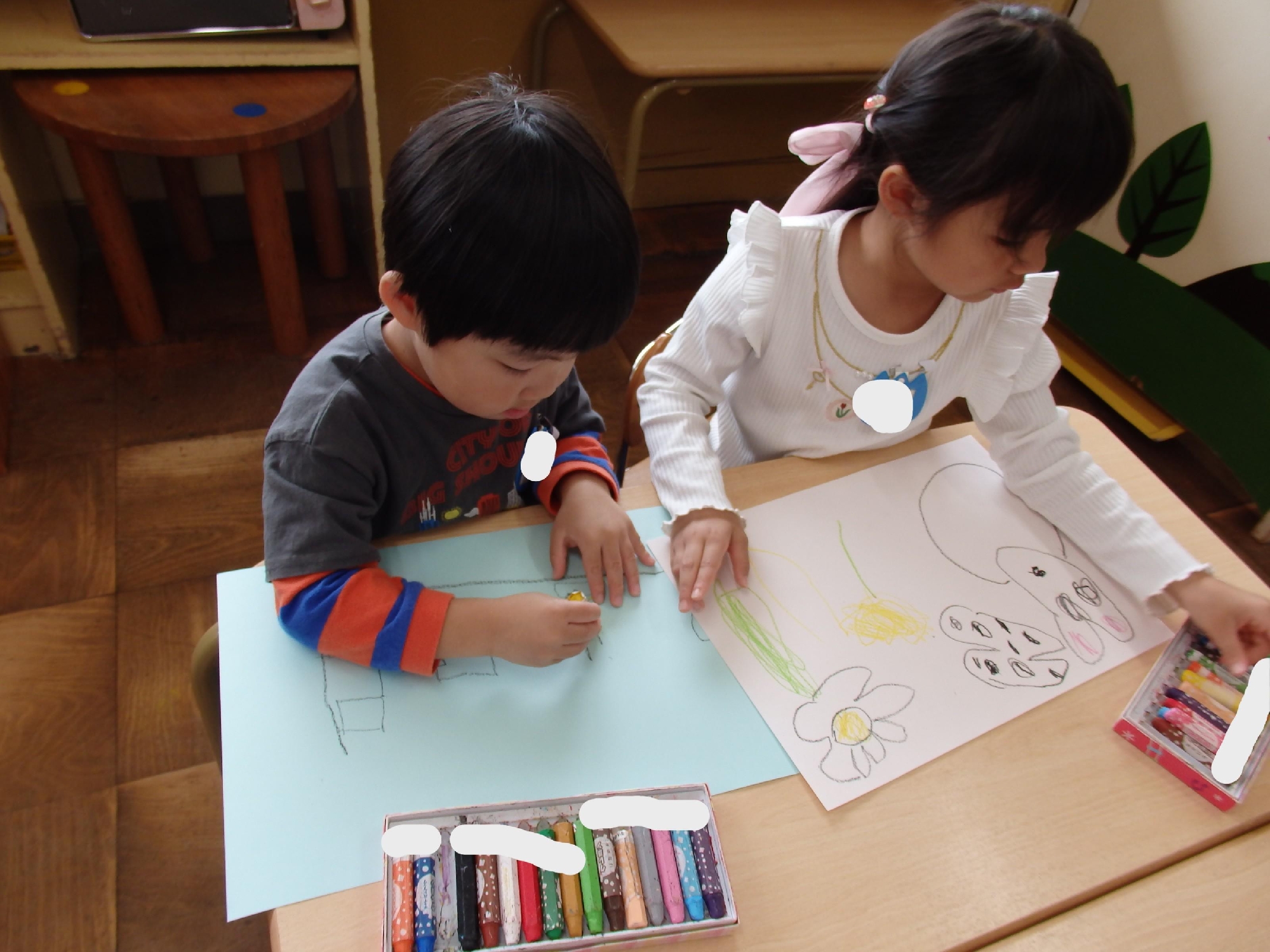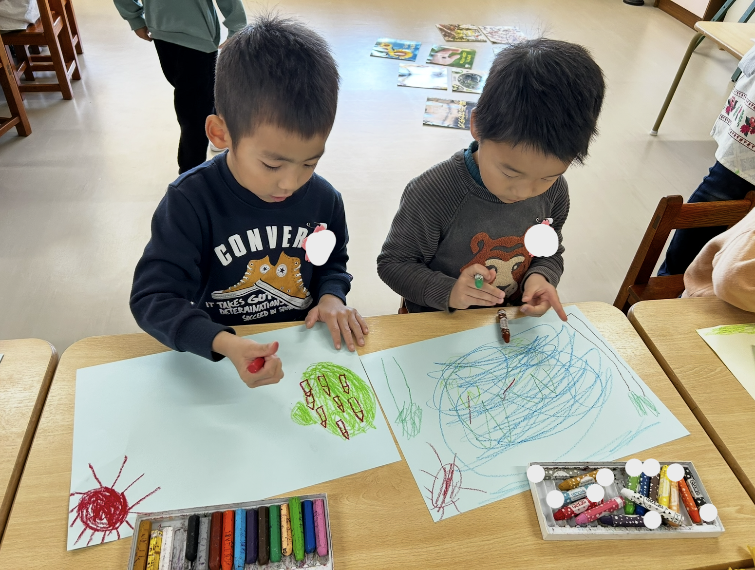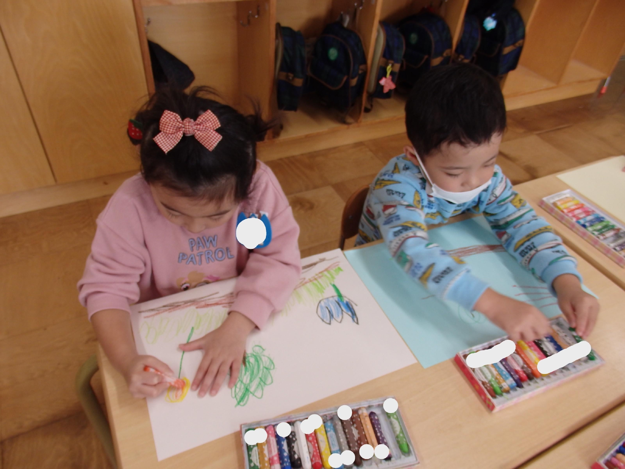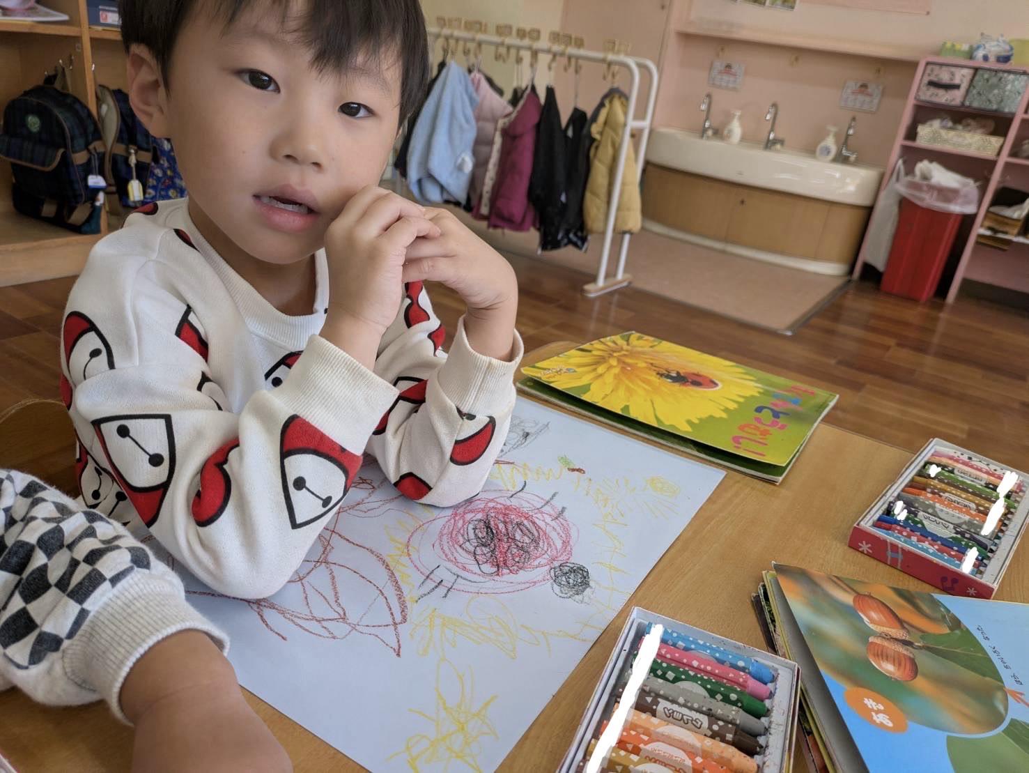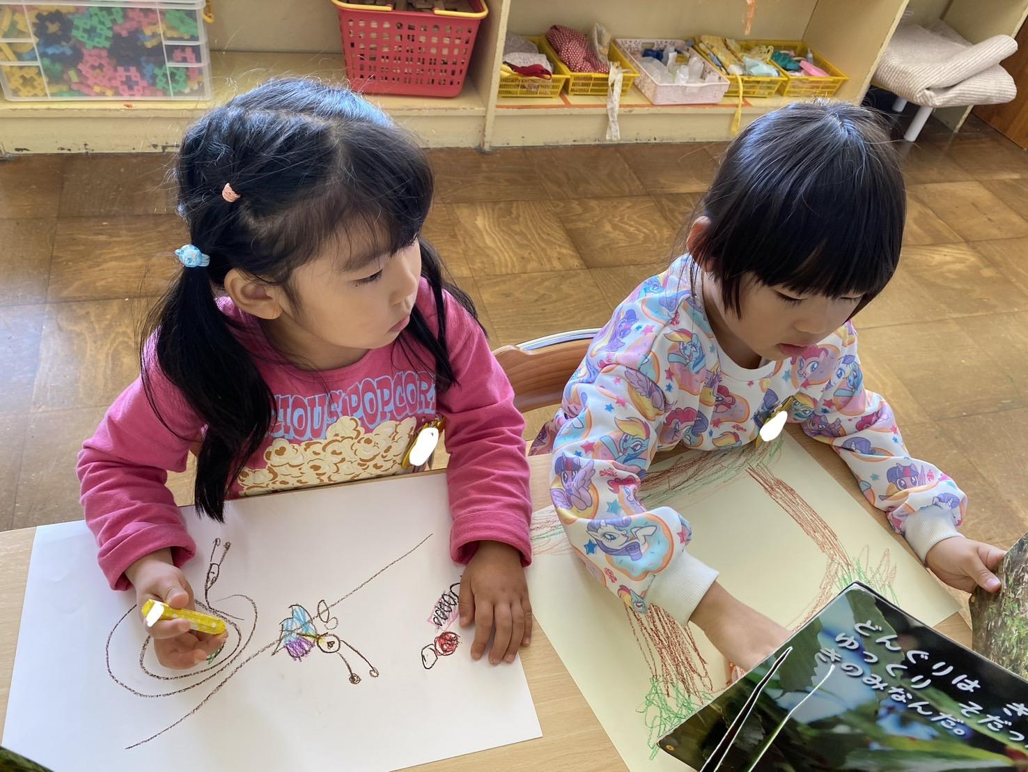 自然に関する絵本を見ながら、絵を描き「虫ってこんなところに足があるね~」「木って色んな色が混じっているんだね~」など発見をしていました♫