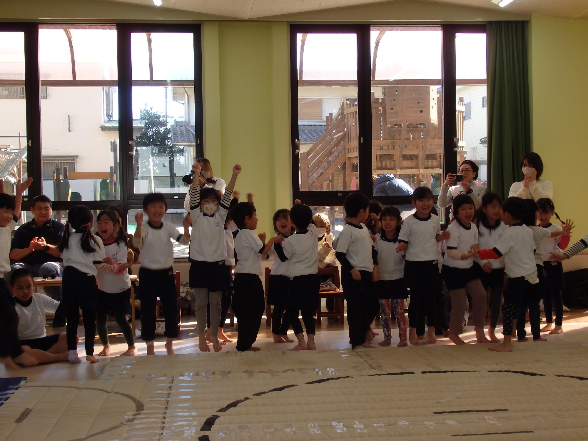 力を合わせて力士さんのお腹を押し、外に押し出すと「やった~!」と大喜びでした😊