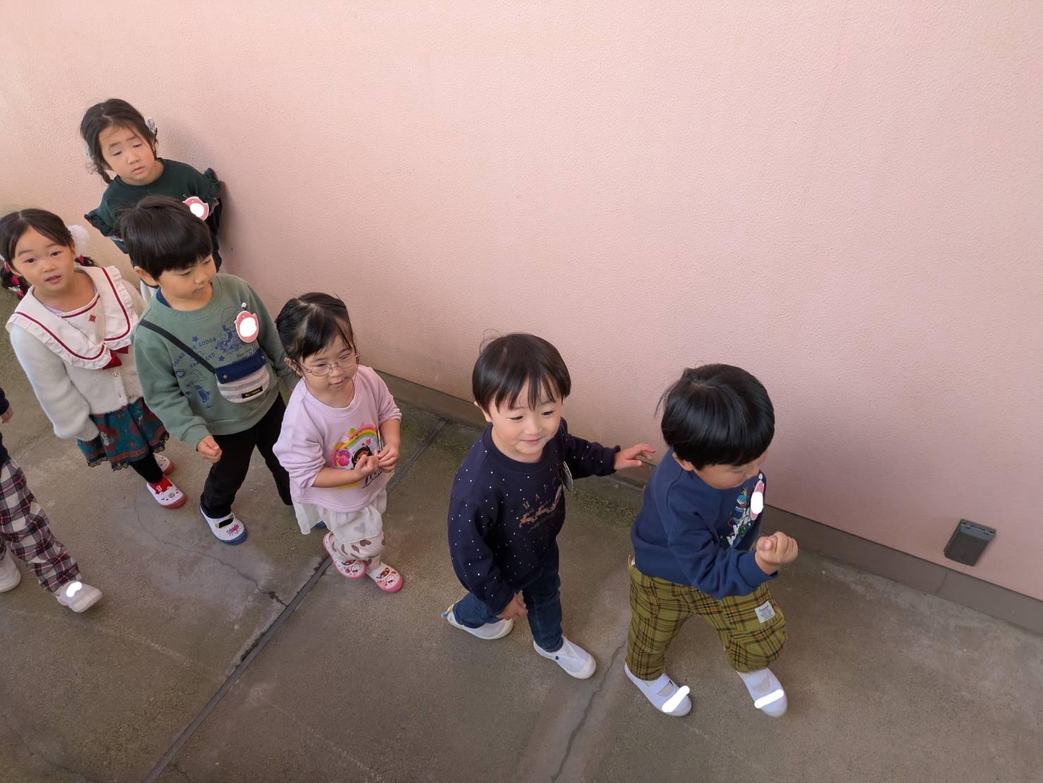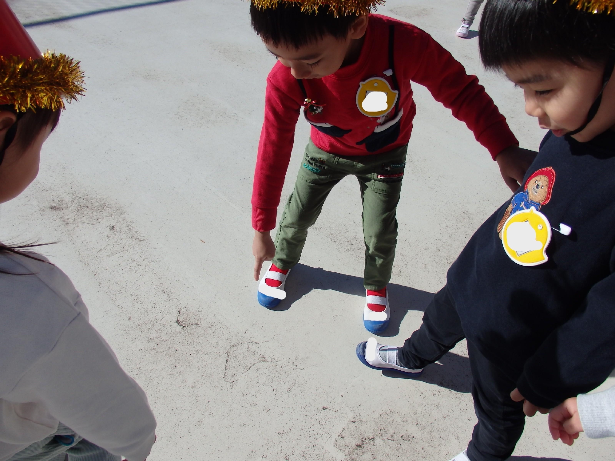 屋上の黒い跡を見つけ、「これサンタさんの足跡だよ!」「サンタさん屋上から来たのかな?」と言う子や、年少組の部屋の前にあったキラキラした粉を見て、「サンタさんの魔法の粉があるよ!」「すごい!」と大盛り上がりでした😊