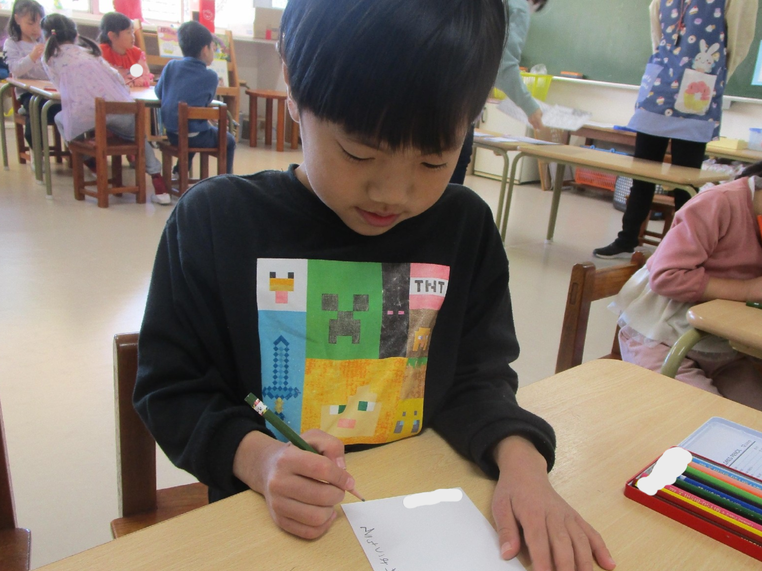 その後には、他クラスの友達やいつもお世話になっている先生への感謝の気持ちなど一人ひとりが気持ちを込めながら書いていました。