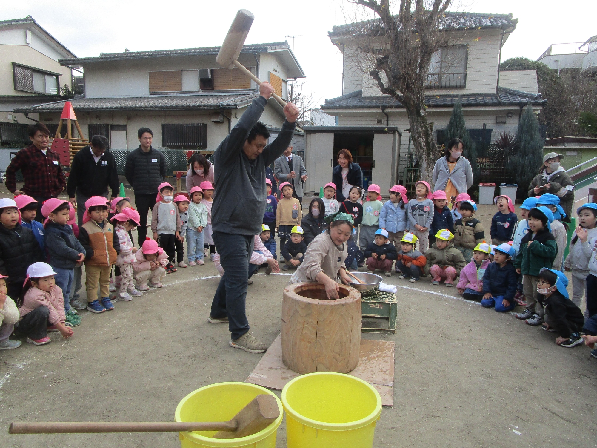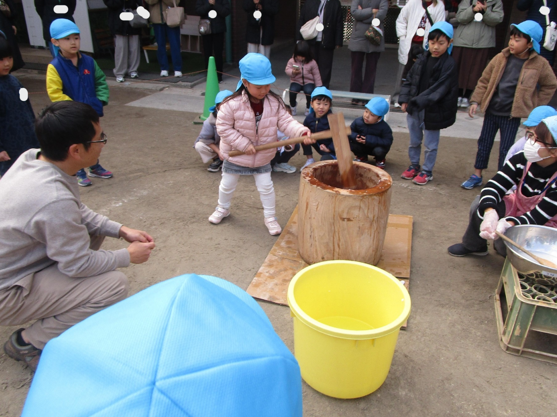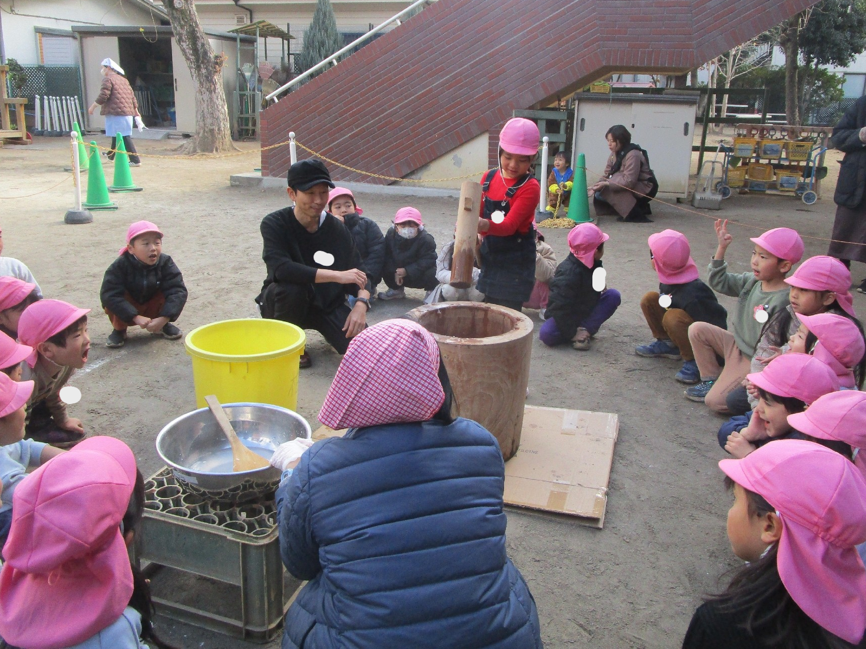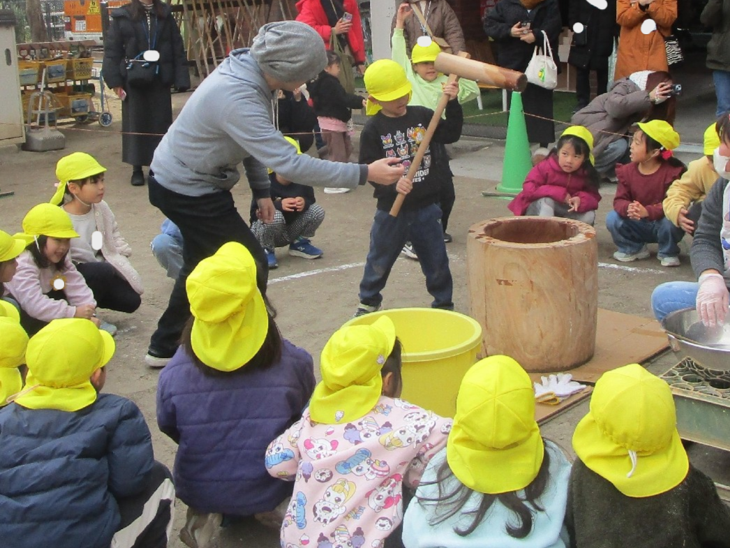 理事長先生や保護者の方々が力いっぱい杵を振る姿に、「よいしょ!」「がんばれー」と子どもたちの元気な声援が響いていました!