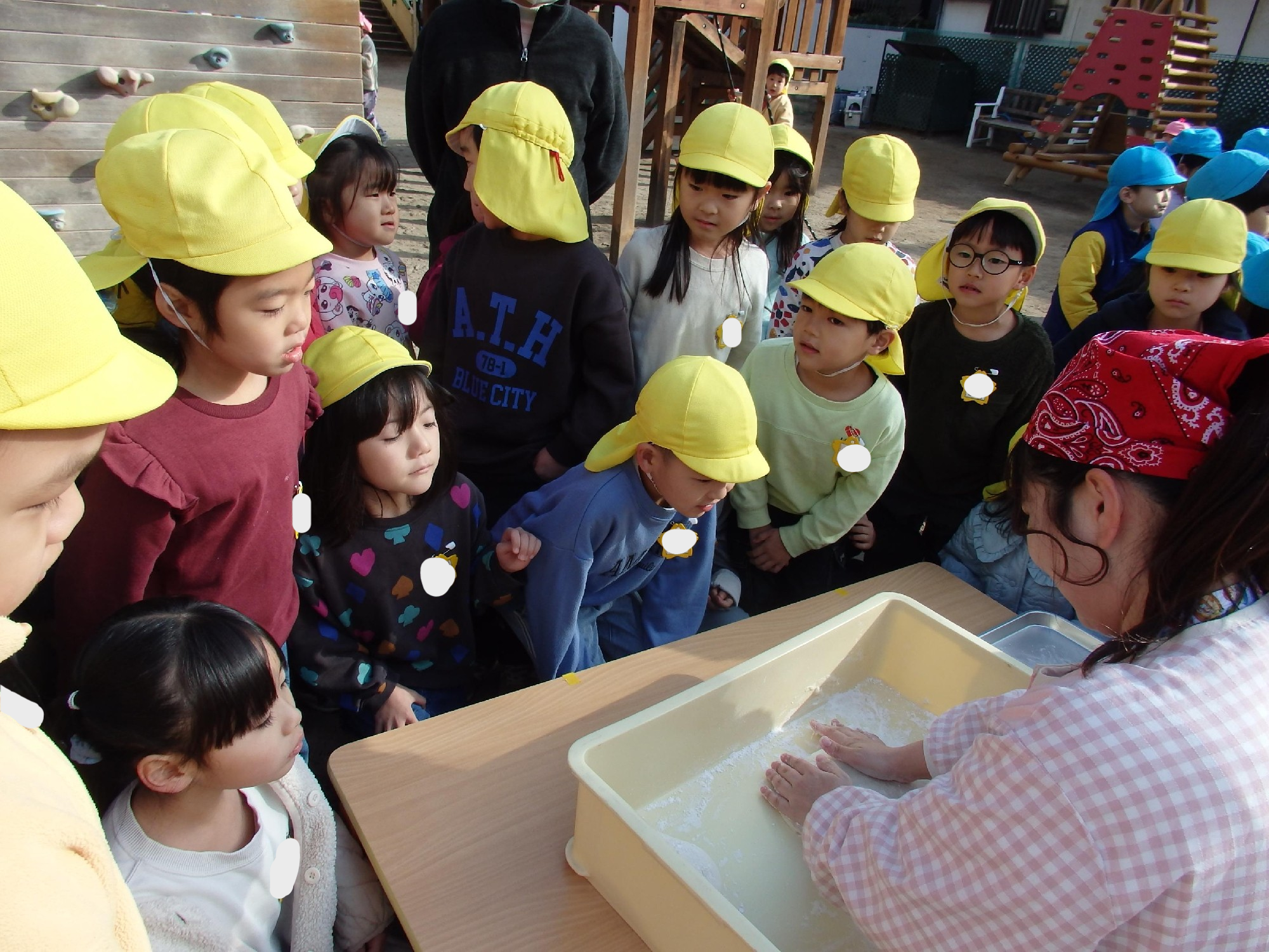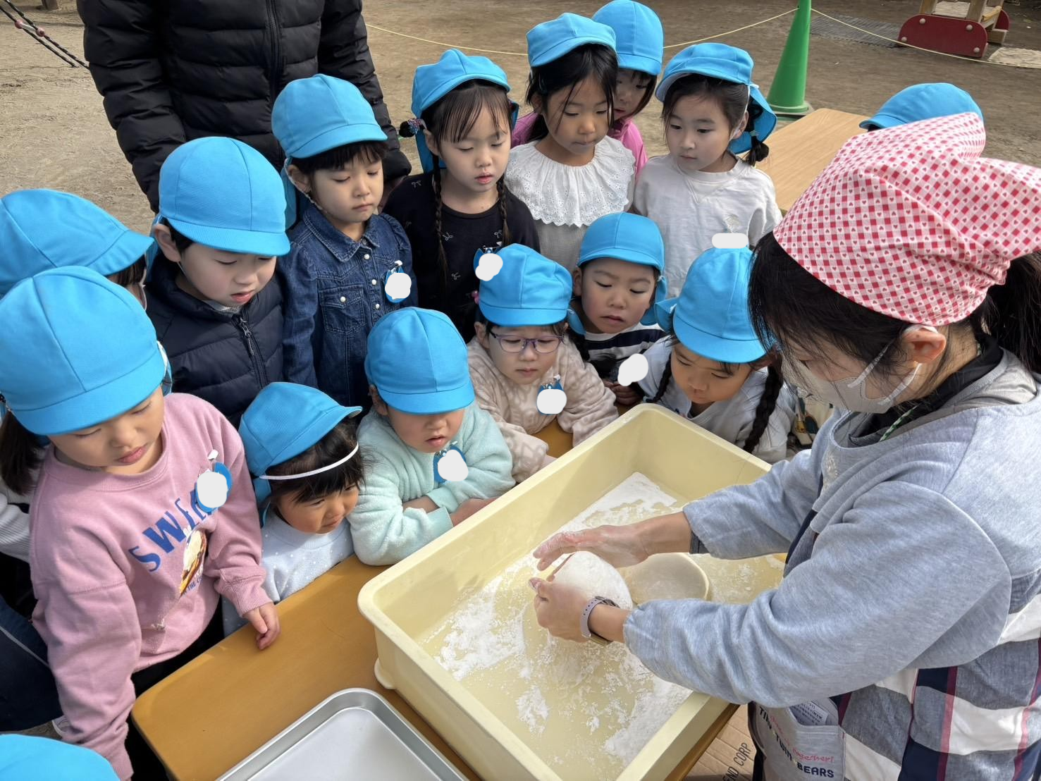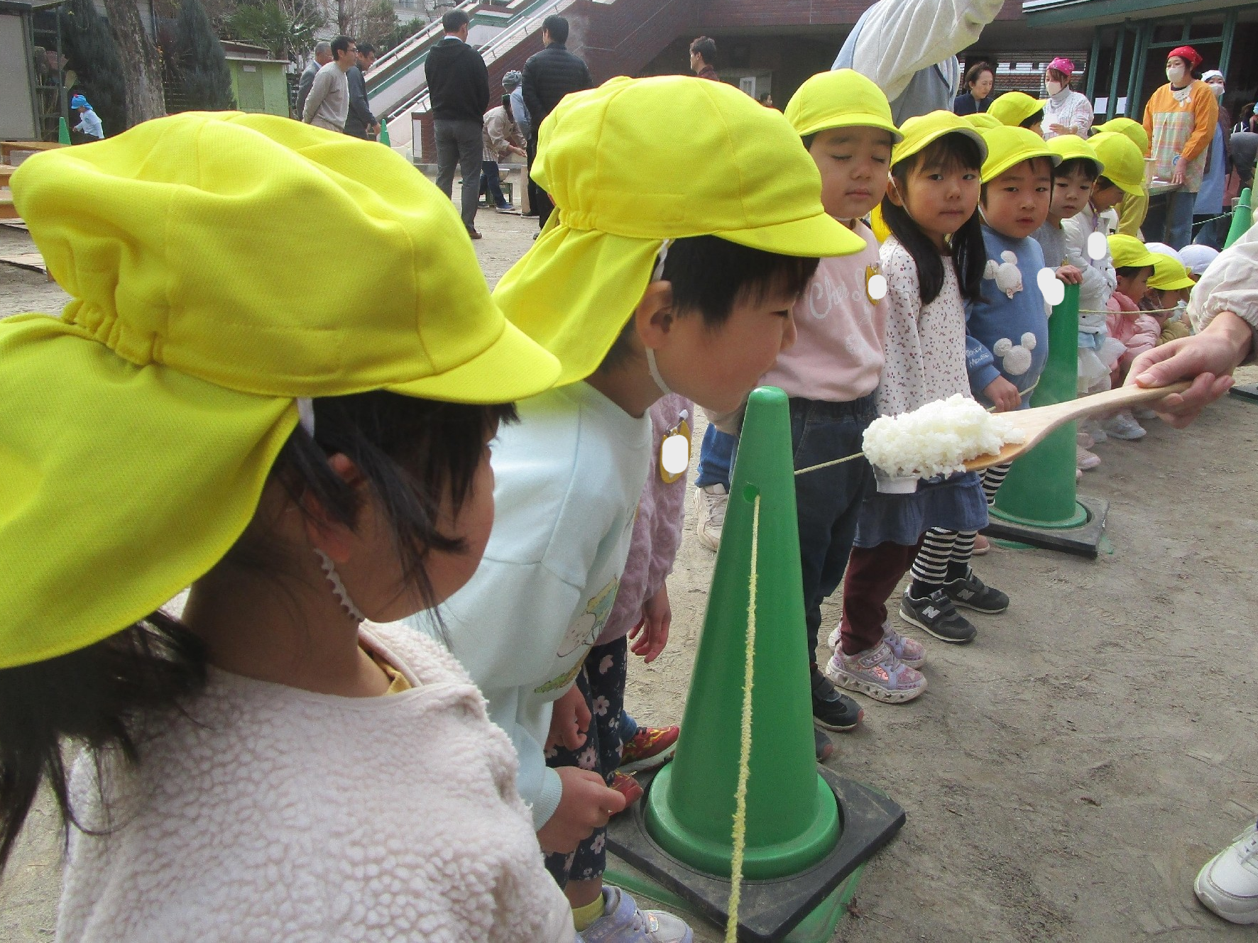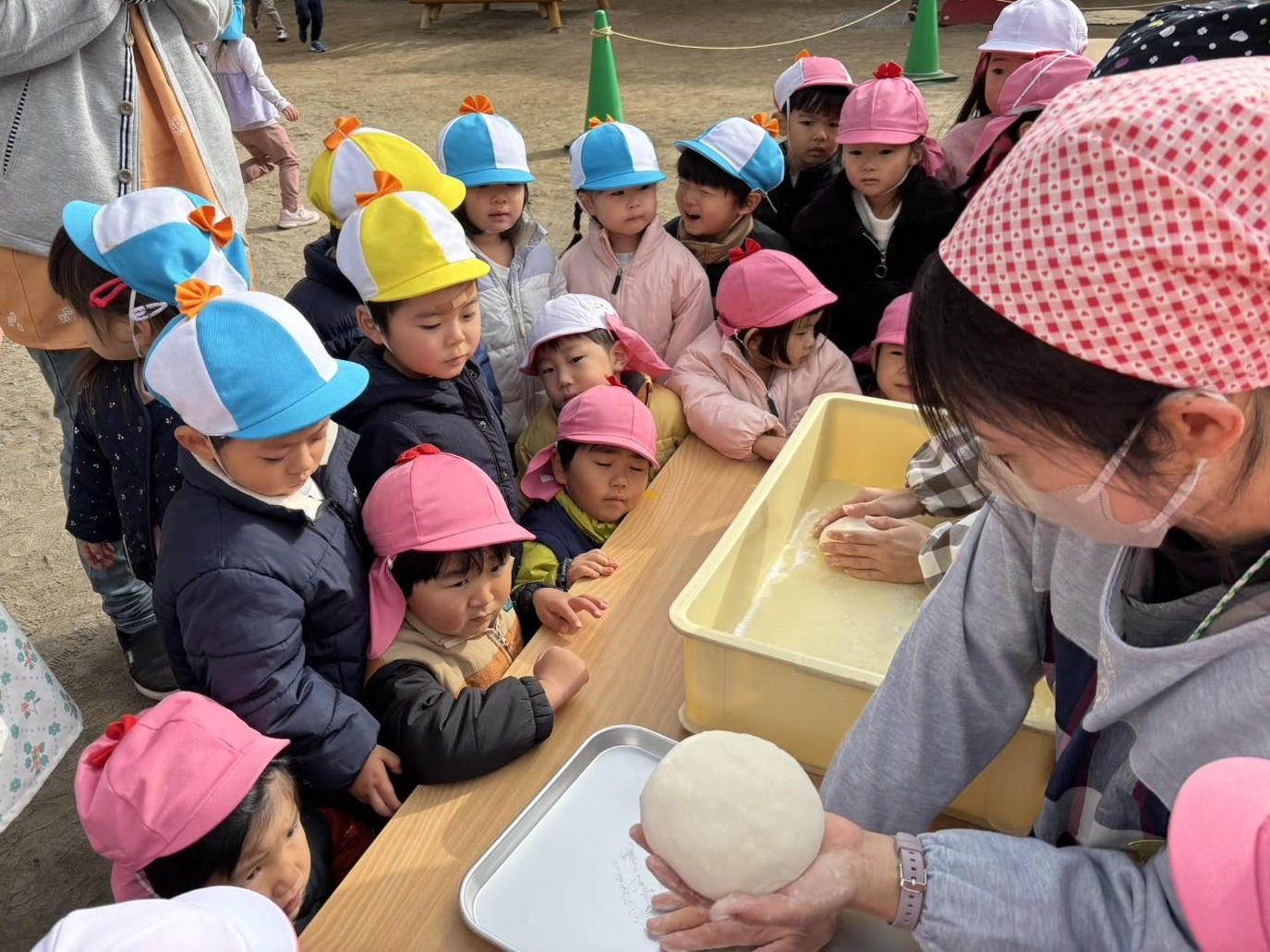 理事長先生や保護者の方々が力いっぱい杵を振る姿に、「よいしょ!」「がんばれー」と子どもたちの元気な声援が響いていました!