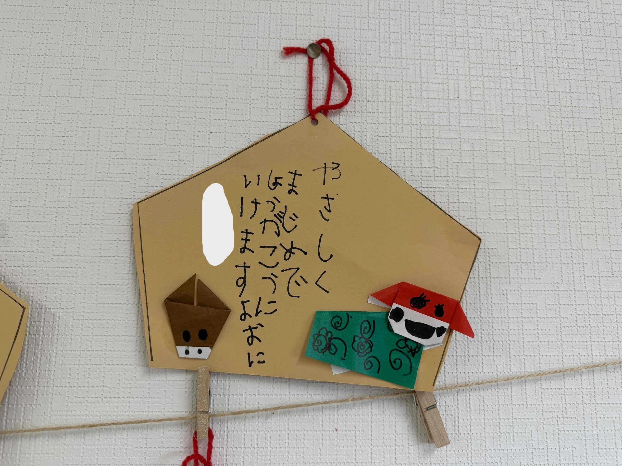 まずは、折り紙で干支の牛と、運動会でも踊った『獅子舞』を作っていきます。
