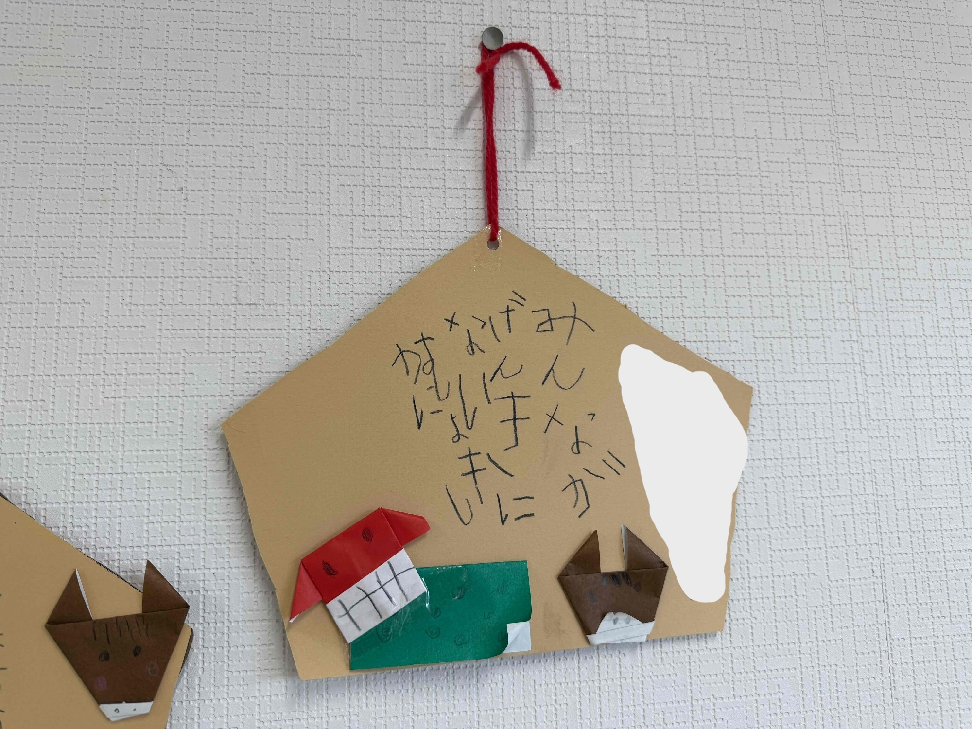 台紙を絵馬の形通りに切り、牛、獅子舞を貼り、最後に願い事を大切に書きました。