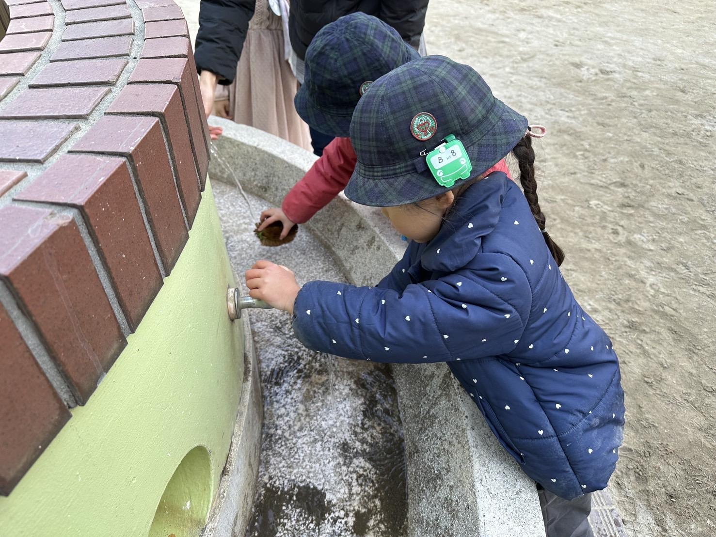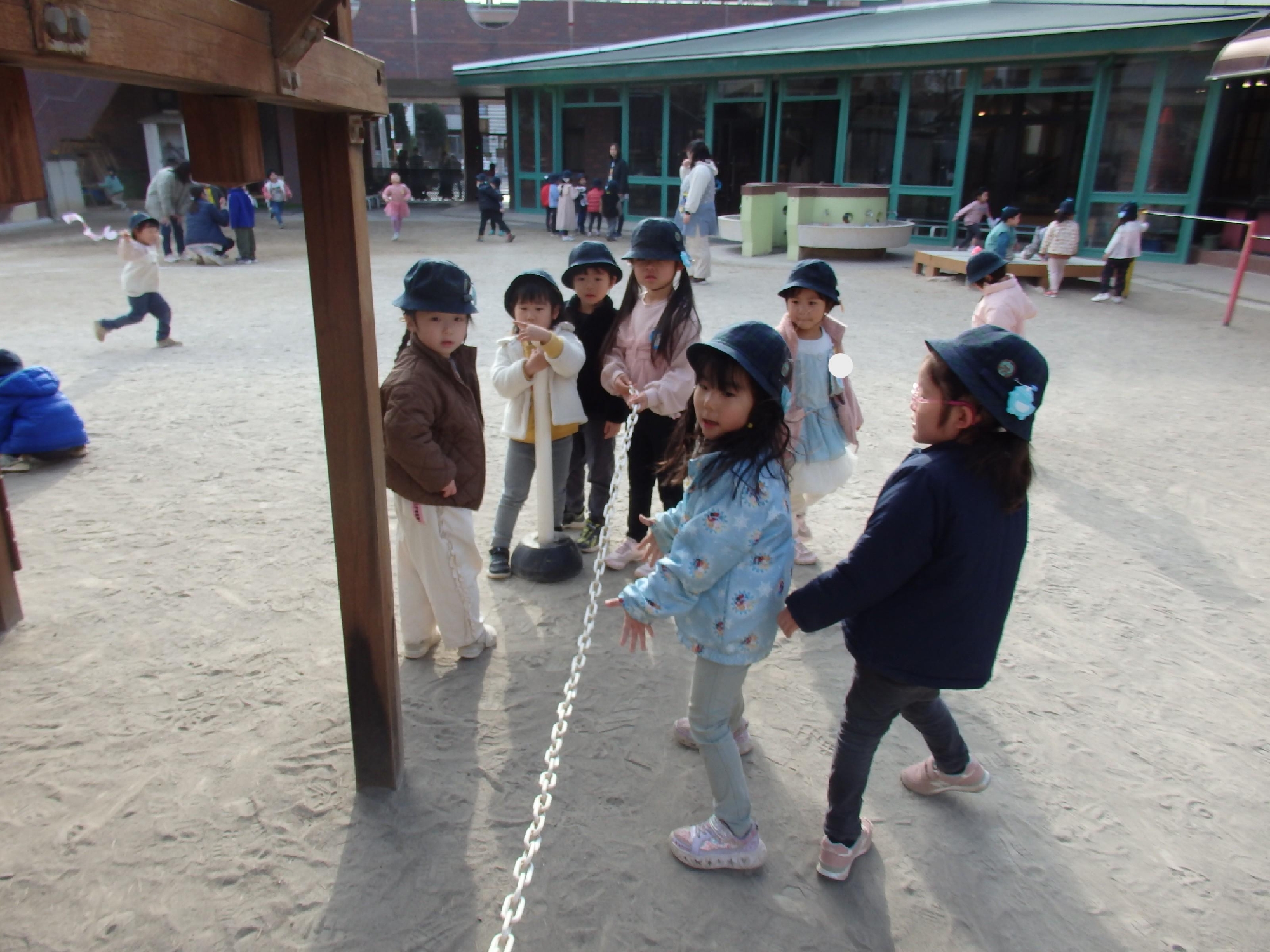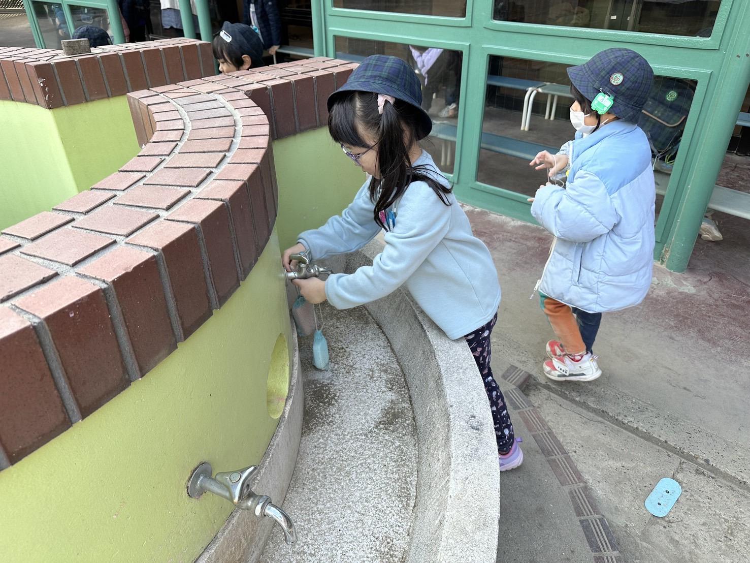 幼稚園の代表として、イペルのチェーンの取り外しや、砂場の開け閉め、水道の石けんを出し入れする当番活動をお願いすると、「任せてよっ!」「なんでも出来るよ!」と頼もしい声が返ってきました!