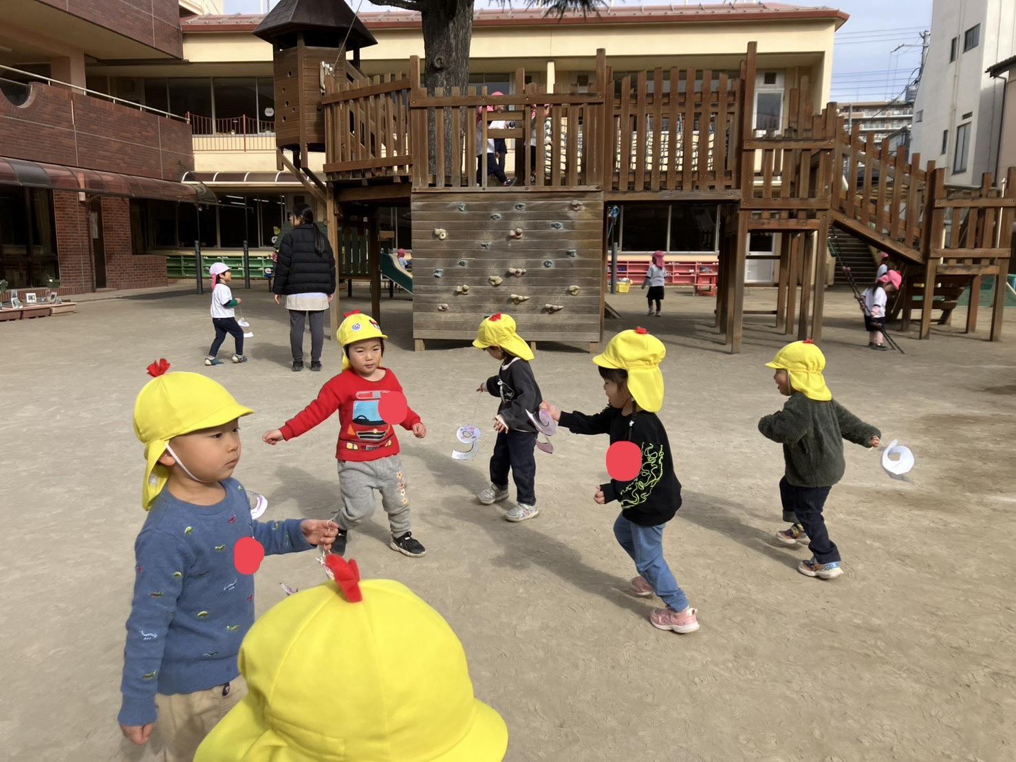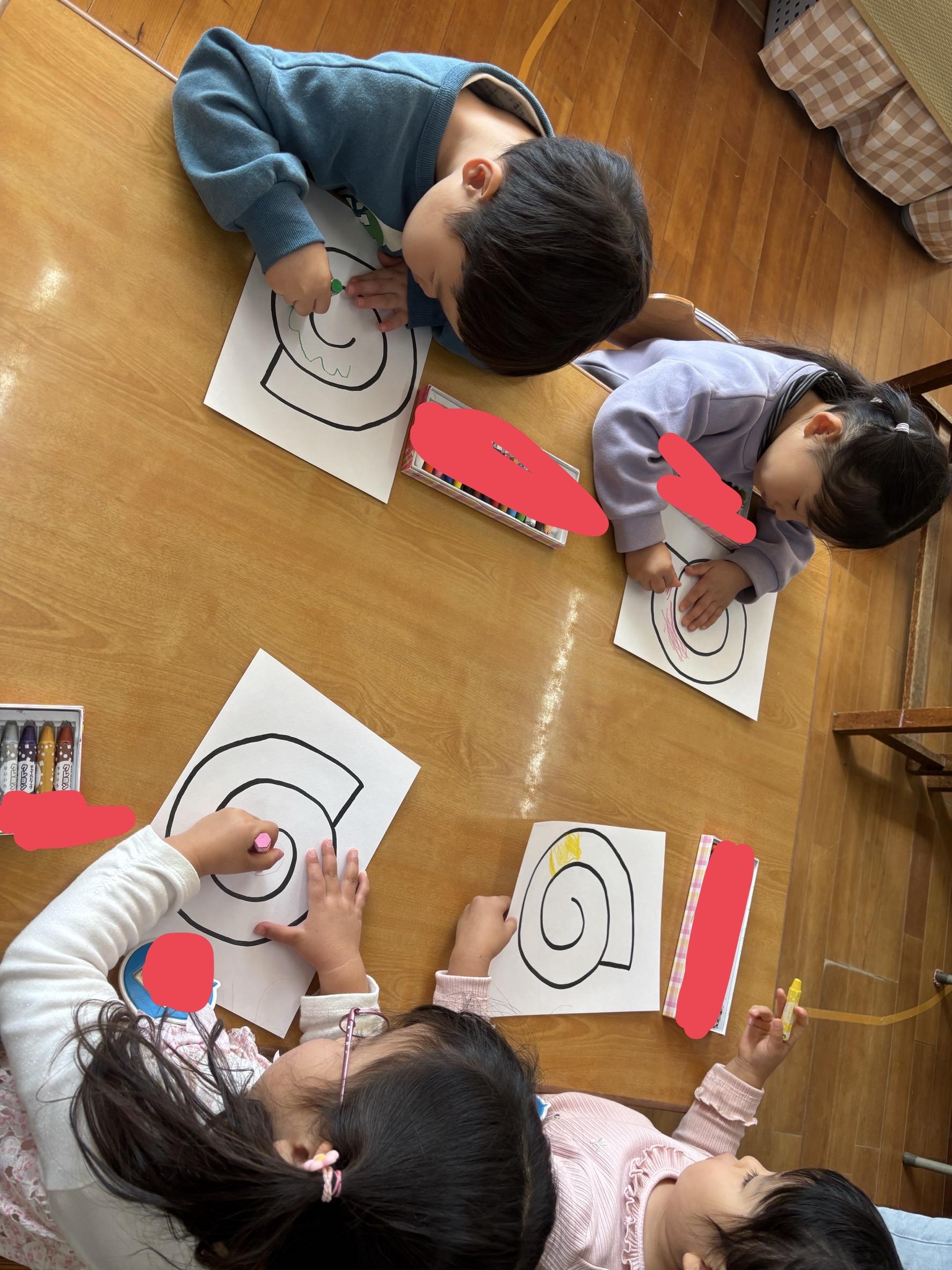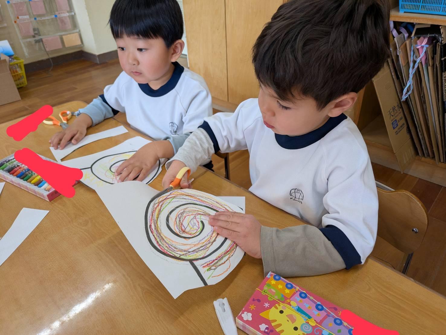 初めて丸い形をはさみで切りました。紙の方を動かしてチョキチョキと切り進めると、「ヘビみたい!!!!」と嬉しそうな子どもたち。真ん中に紐をつけたら…凧の完成!外に出て自分で作った凧で凧上げをしました。凧を持って元気いっぱい走り回って、とっても楽しかったようです☺️金曜日お持ち帰りますので、お家でも是非遊んでみてくださいね!