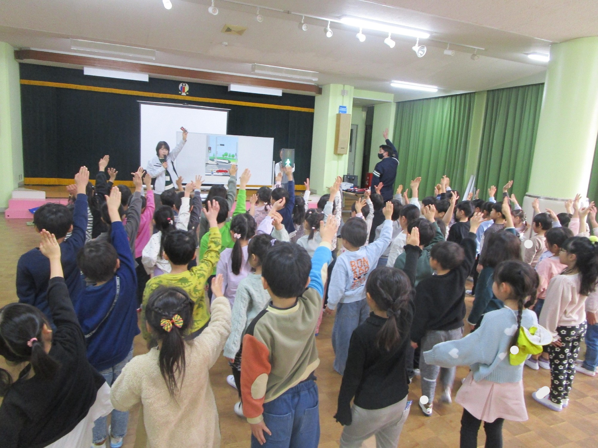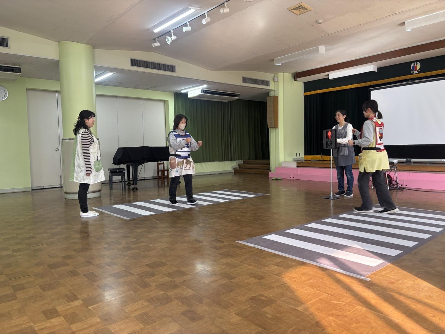 道路は右側を歩くこと、横断歩道を渡るときは「右・左・右」をしっかり確認し、手を挙げて渡ることなど大切な交通ルールをわかりやすく教えていただきました。