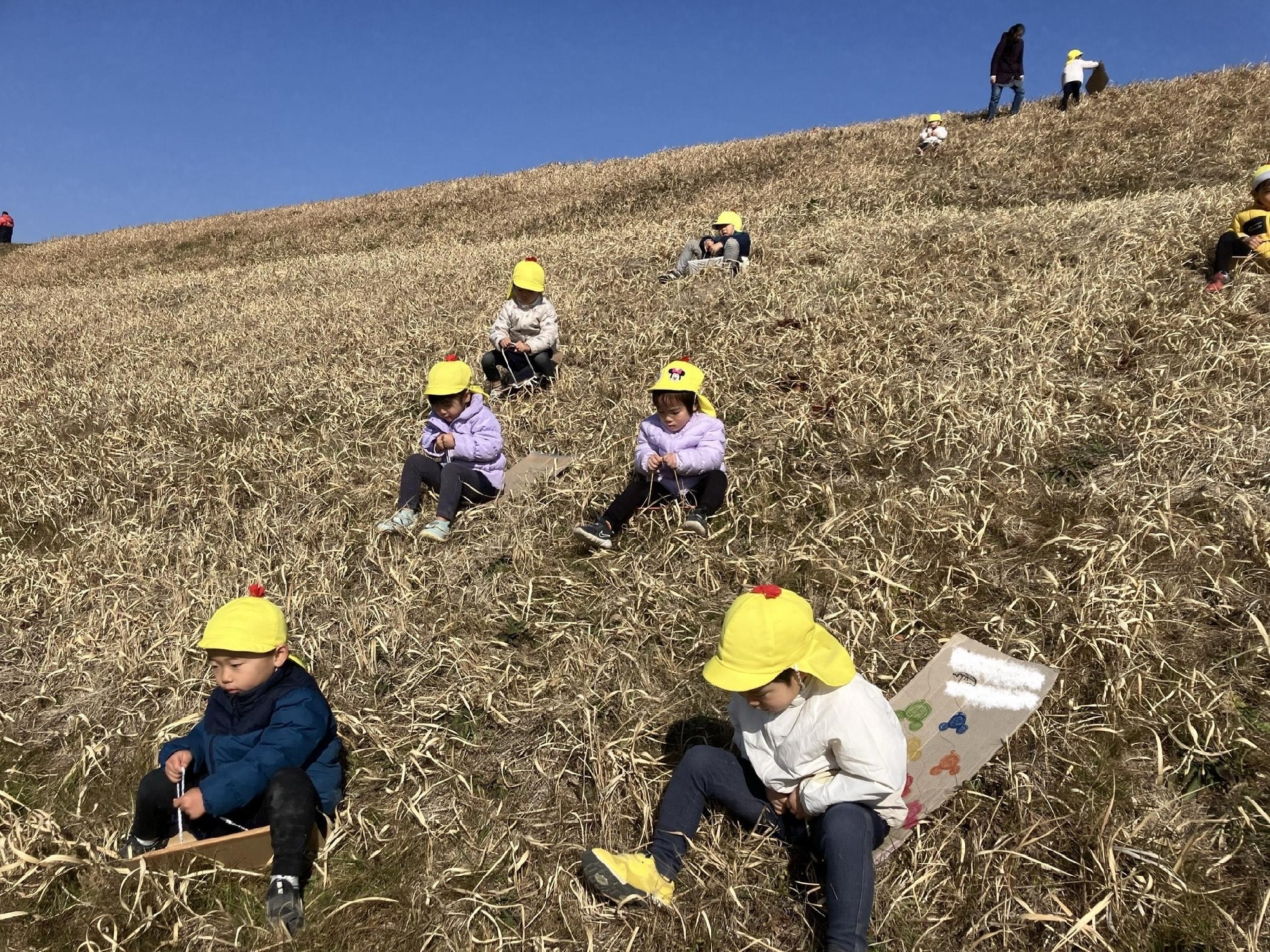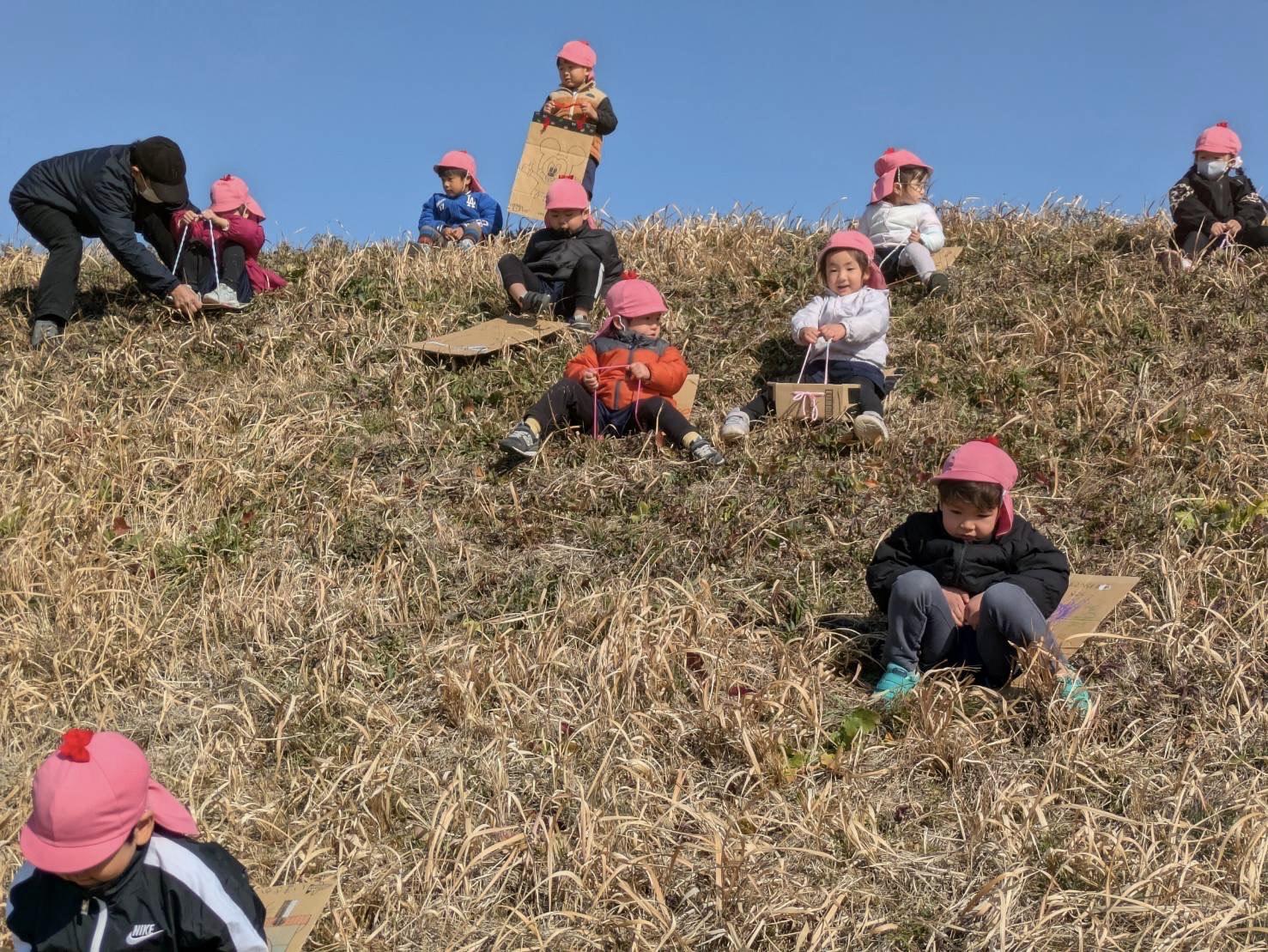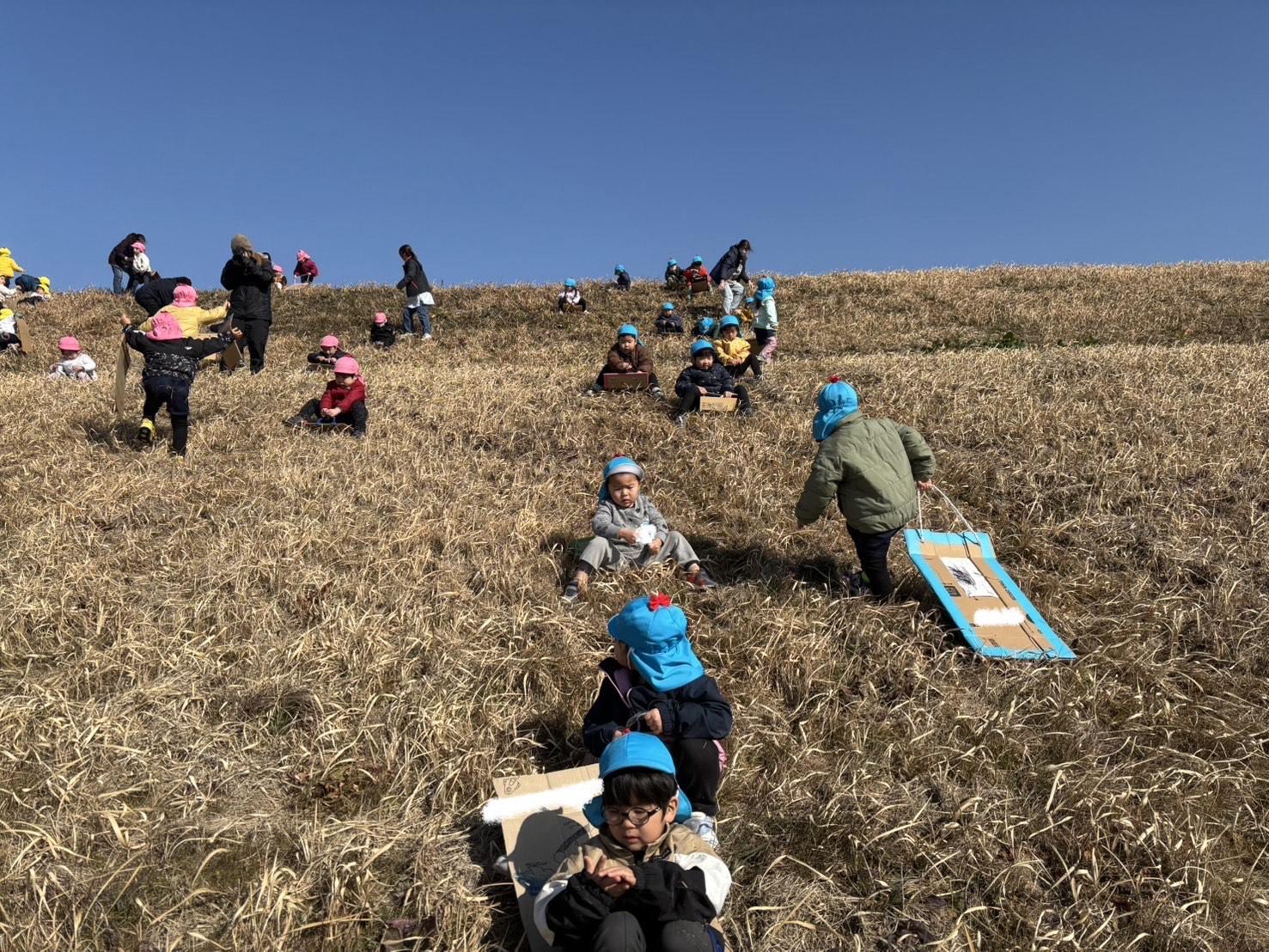 初めは滑り方が分からなかった子ども達でしたが、段々早く滑るコツを掴んで、何度も土手を登って滑ってを繰り返し楽しんでいました!