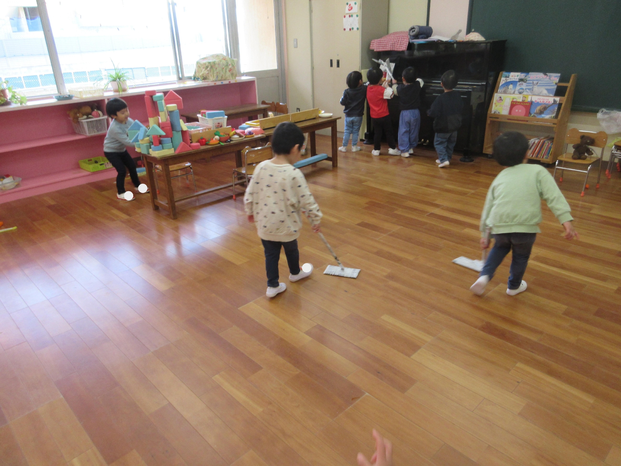 お家の方が来る前は、子どもたちが自ら掃除機になったり、大型積み木を掃除機に見立てたりして保育室をきれいに掃除していましたよ(^^)