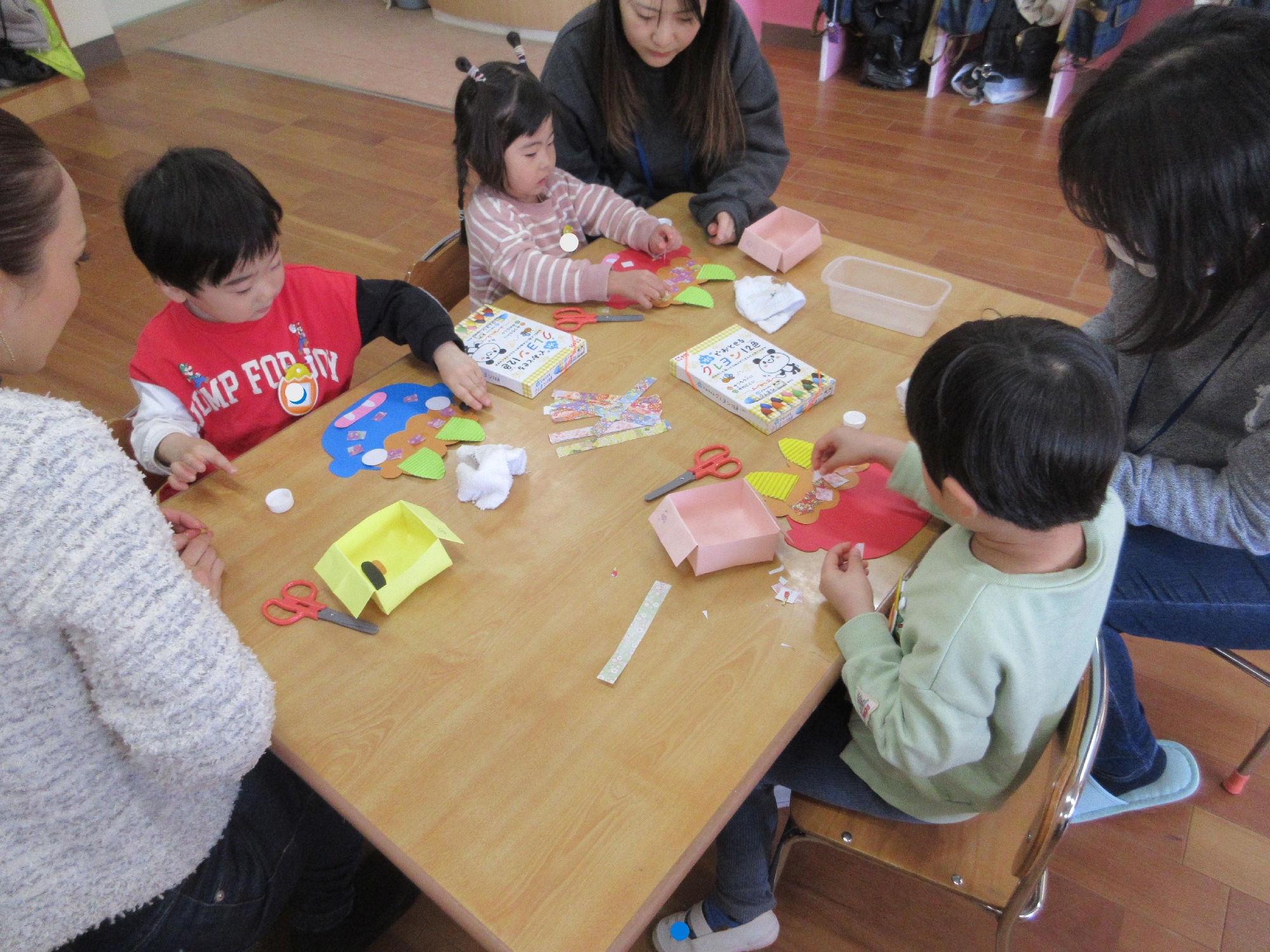 ハサミを使ったり、のりを使ったり工程がたくさんでしたが、「鬼の目がグルグルで目が回ってる~」とクレヨンで目を描いて楽しんで作っている姿が見られましたよ。