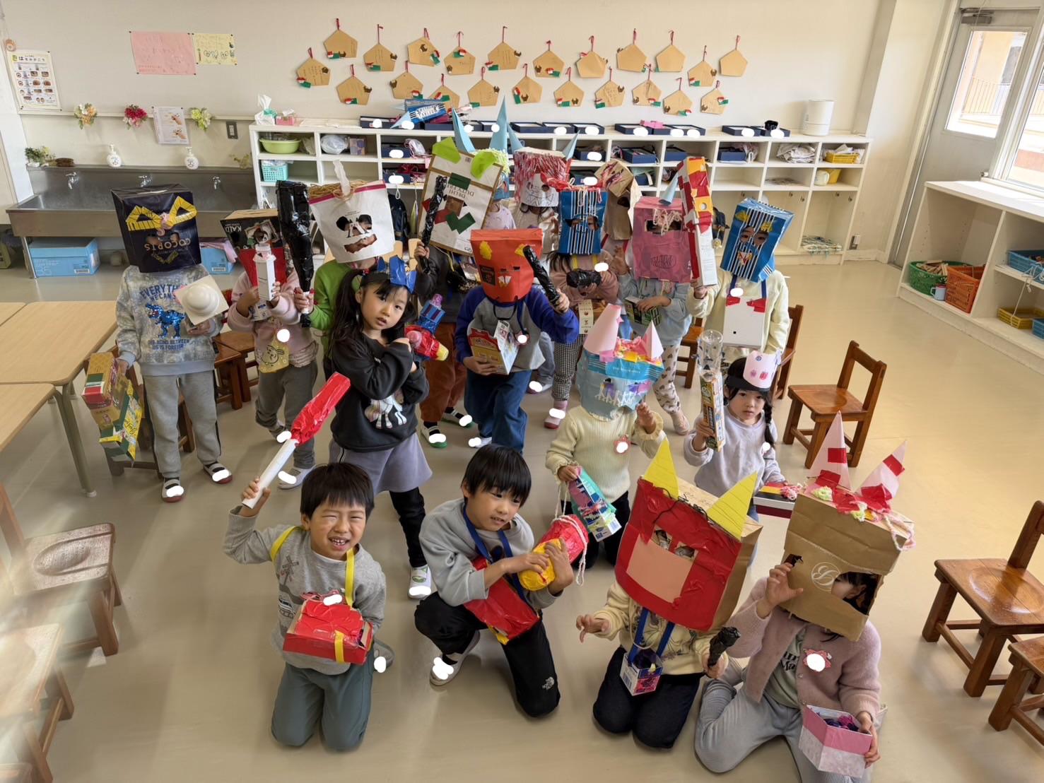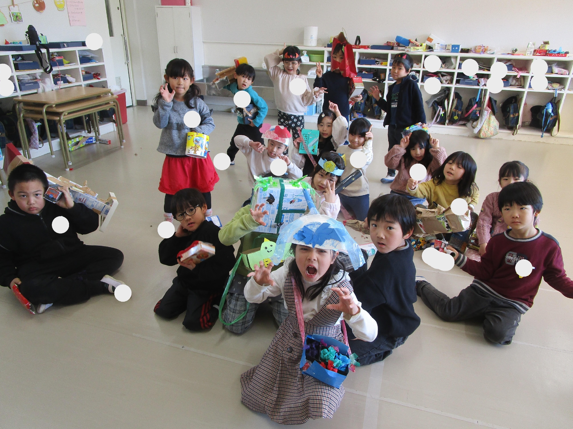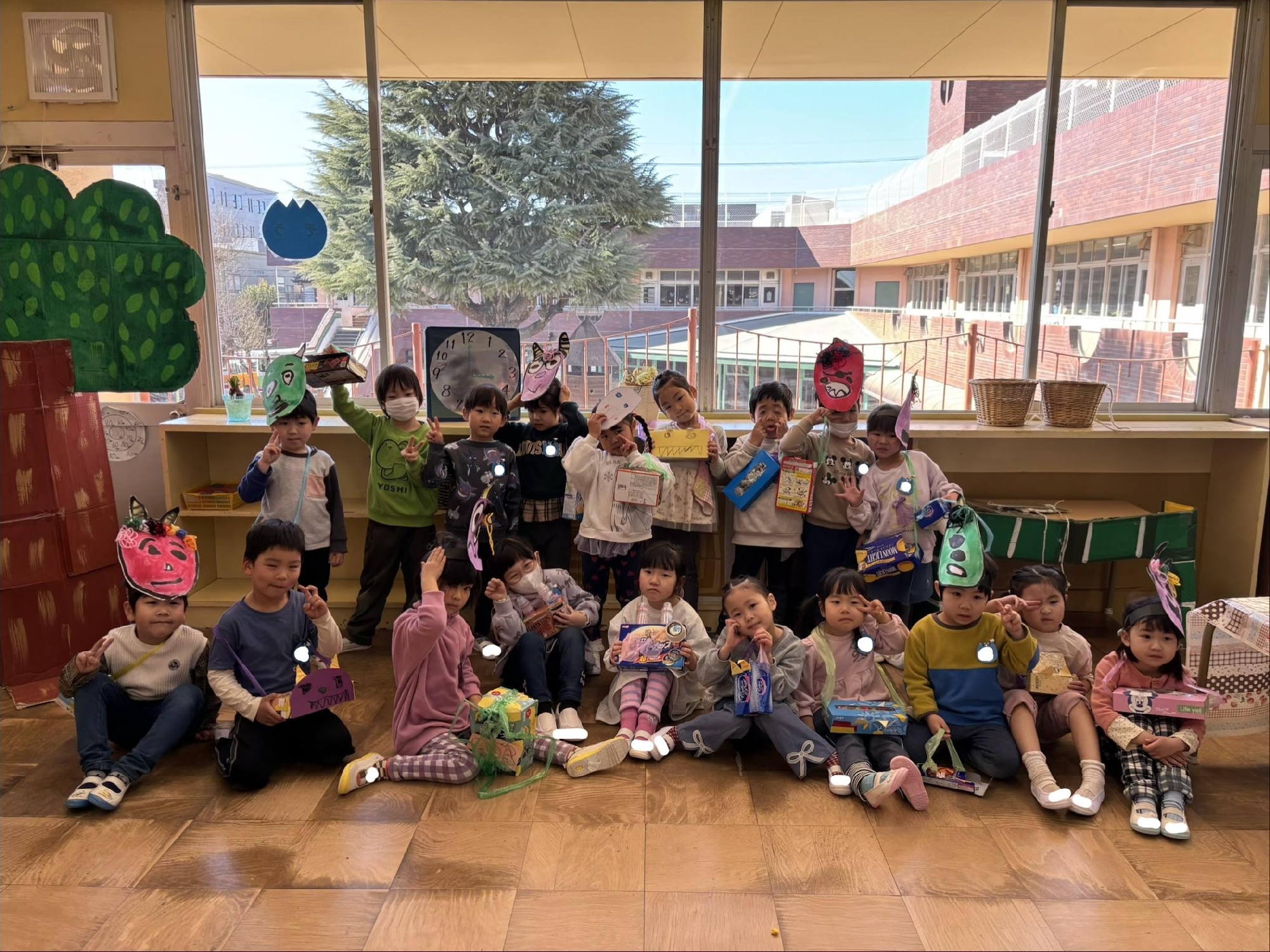 自分で考えて作ったものを身に着けて、「クラスに鬼が来たらどうする?」と話し合いました。