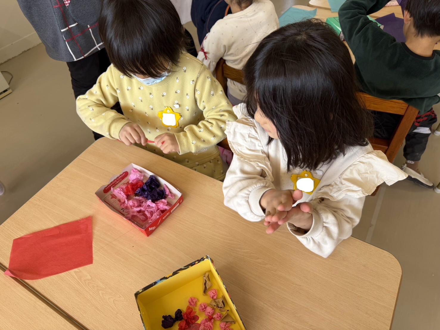 節分の日に向けて「怖い鬼ってどんな感じかな?」「鬼が来たらたくさん豆を投げられるようにいっぱい作ろう!」と鬼のお面や豆、豆入れを作って待ちました。