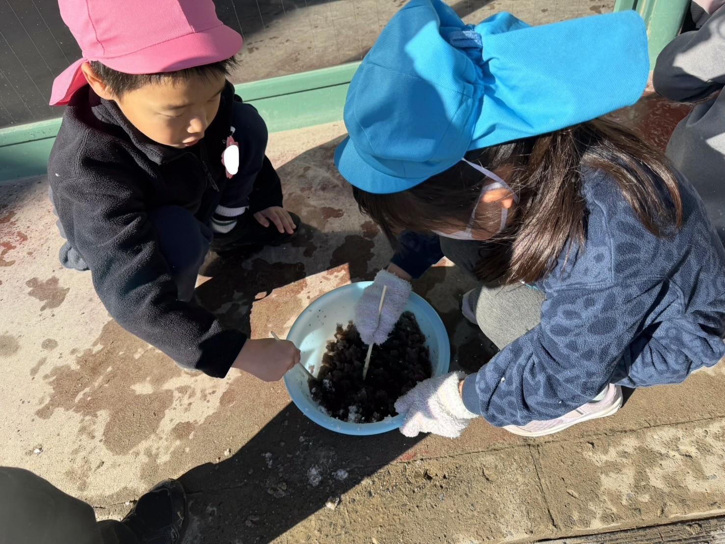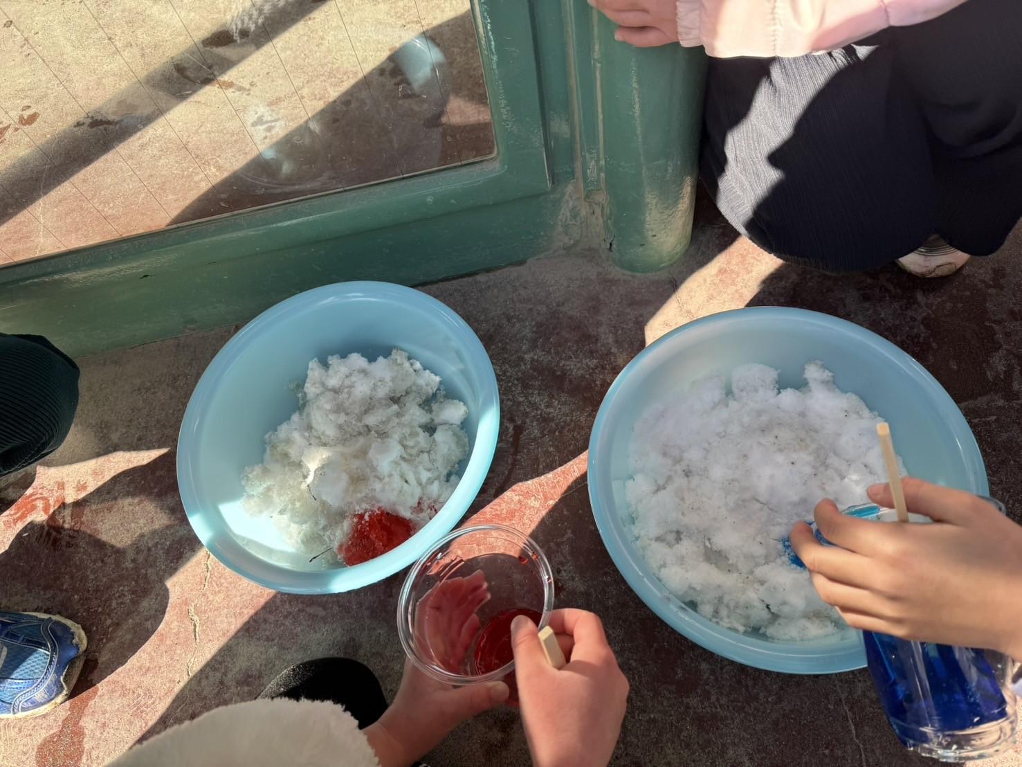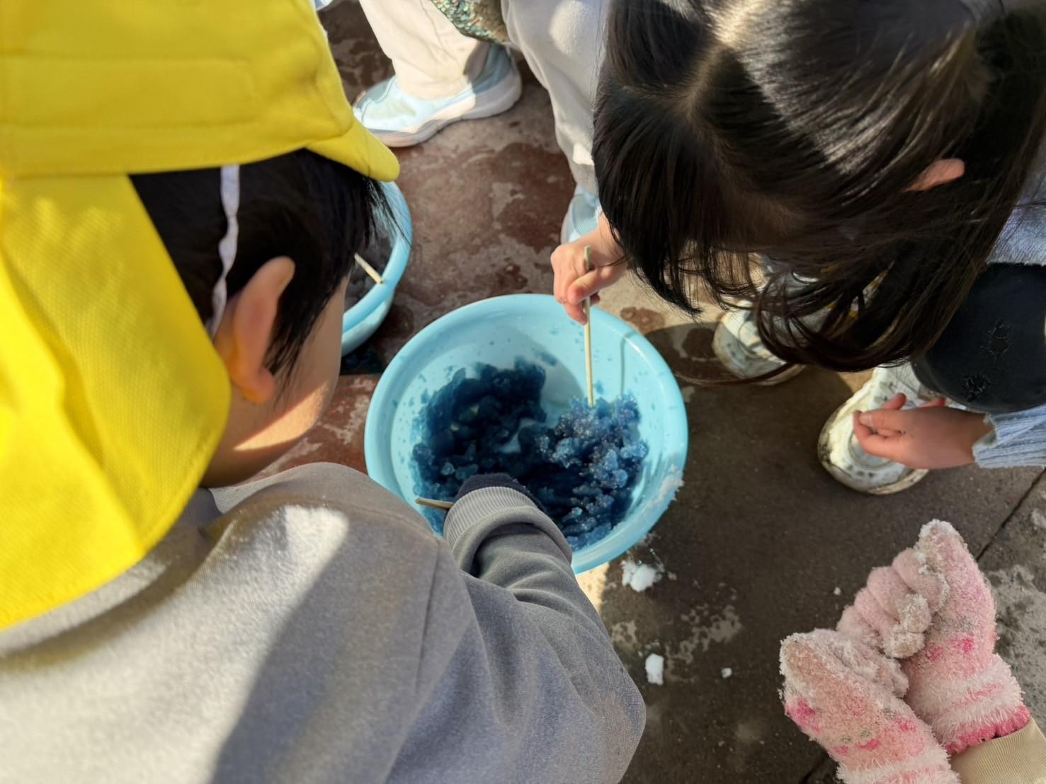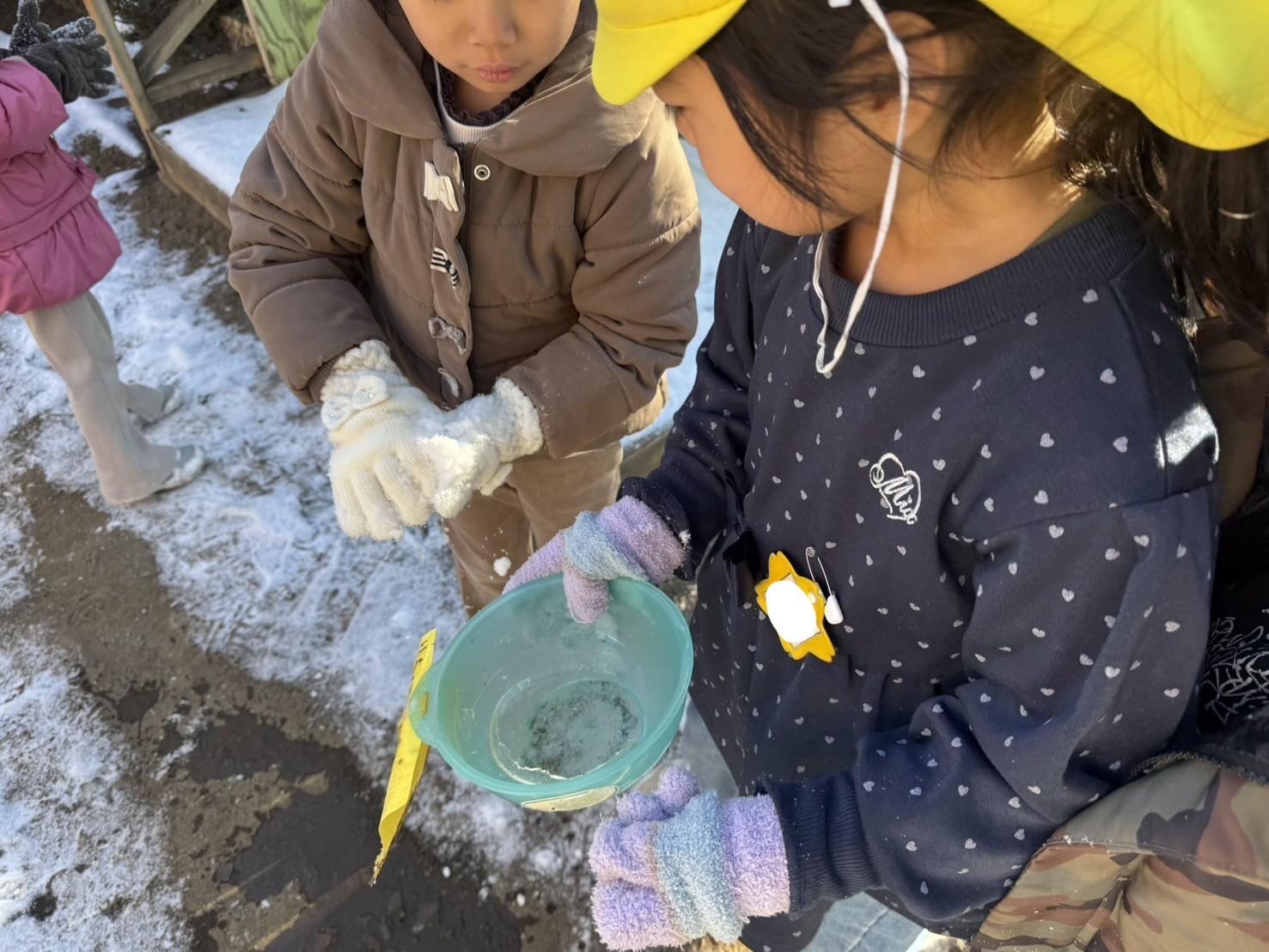 年長組では、容器に水を入れて氷の実験や、雪に色水をかけて混ぜ合わせて楽しみました。
