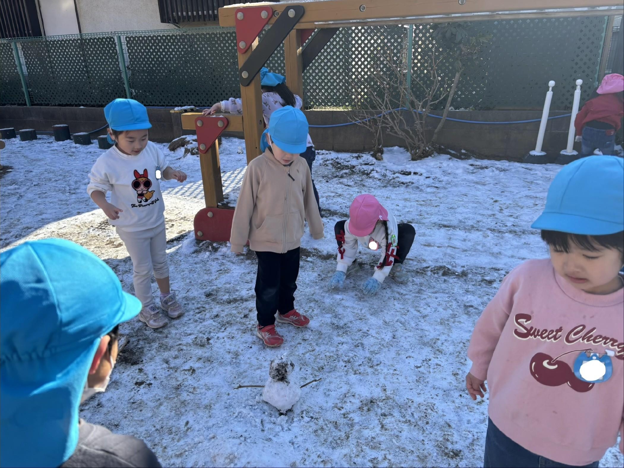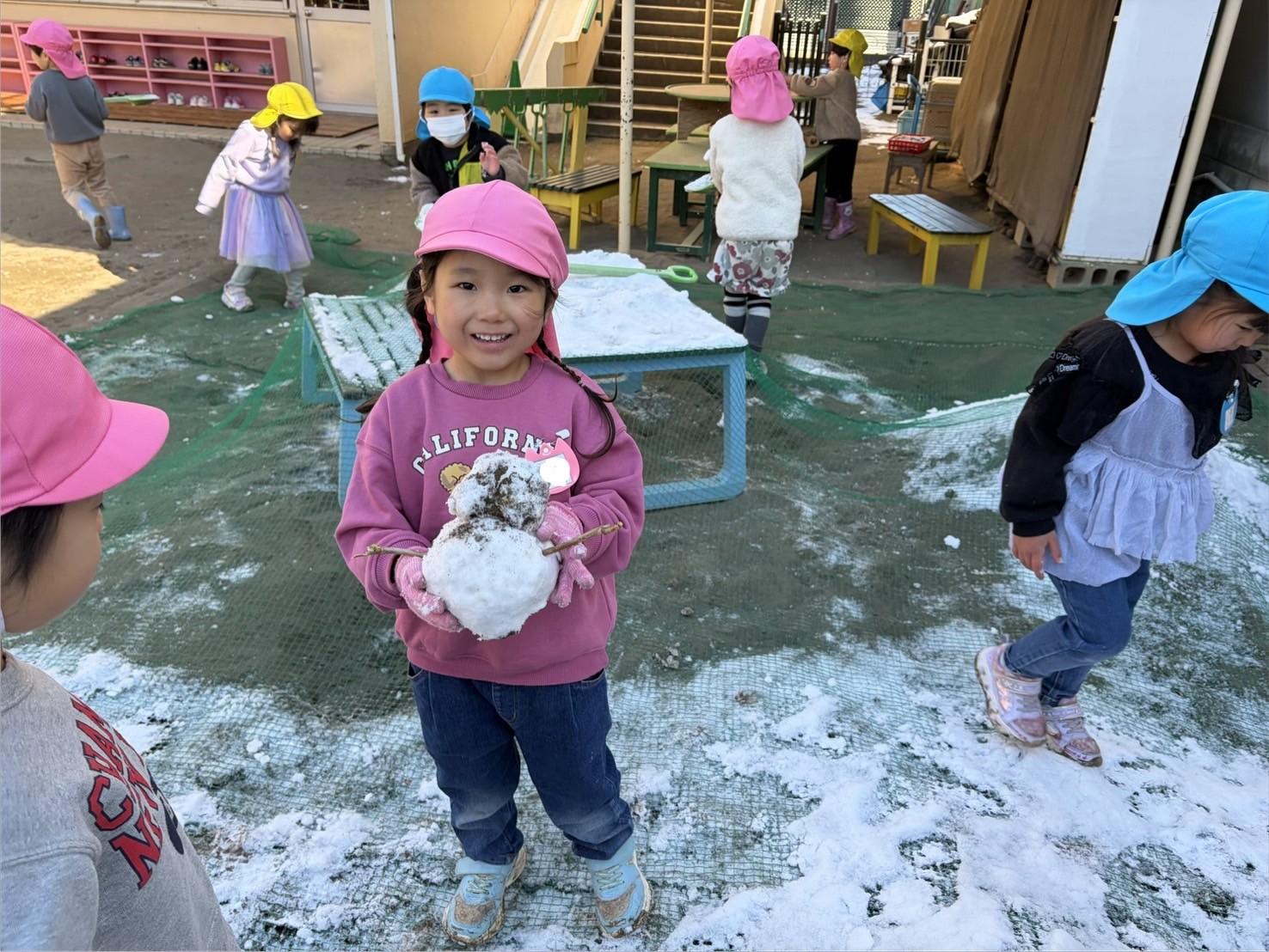 雪を丸めて雪の団子を作ったり、小さい雪だるまを作ったり…