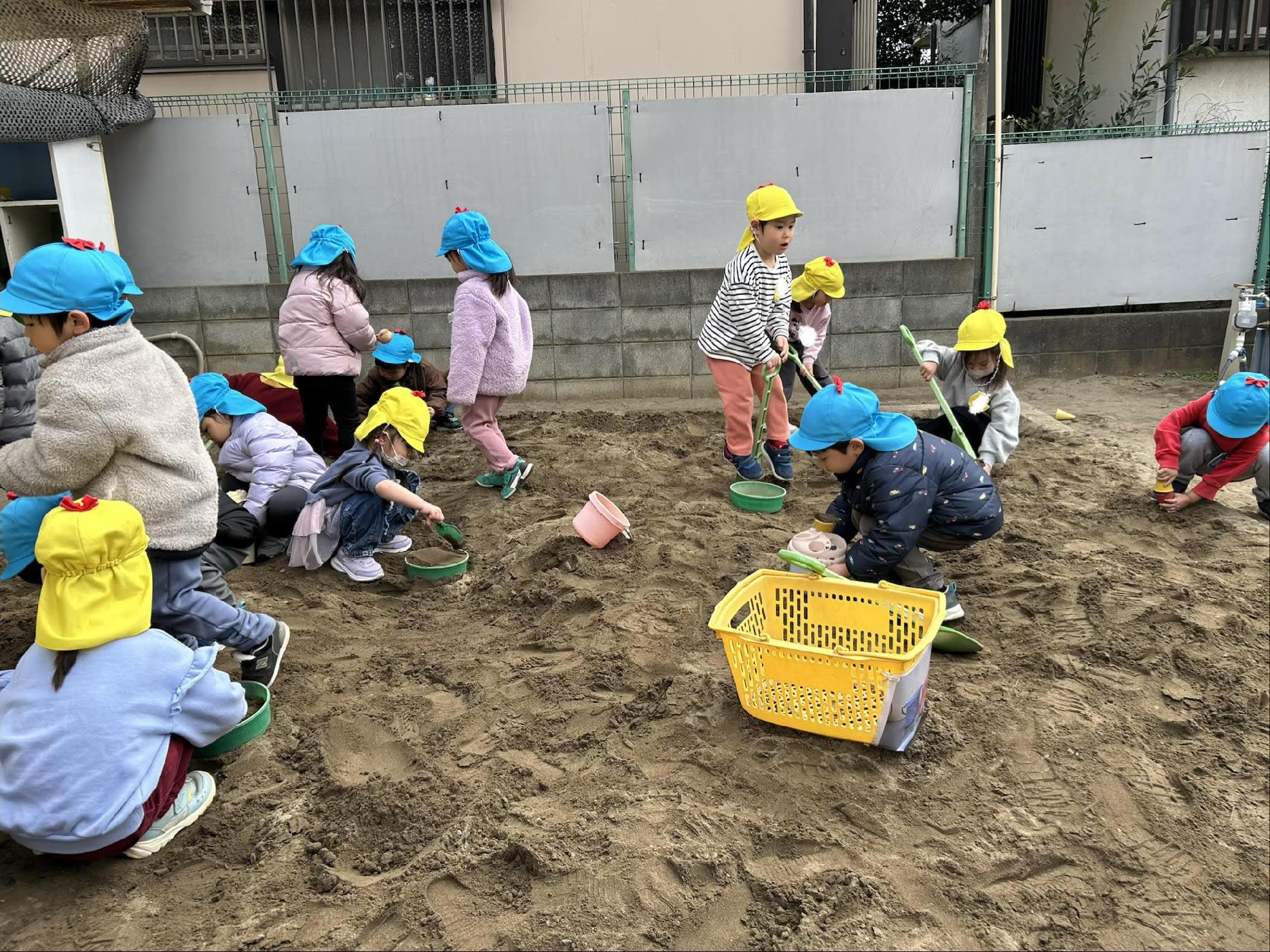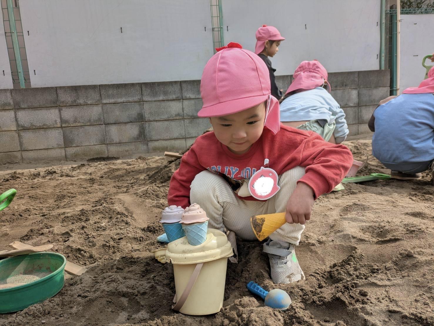年少組にはないおもちゃに興味津々の子どもたち!年中組の砂場では大きなスコップで砂を掘ったり大きな山を作ったり、楽しく遊びました。