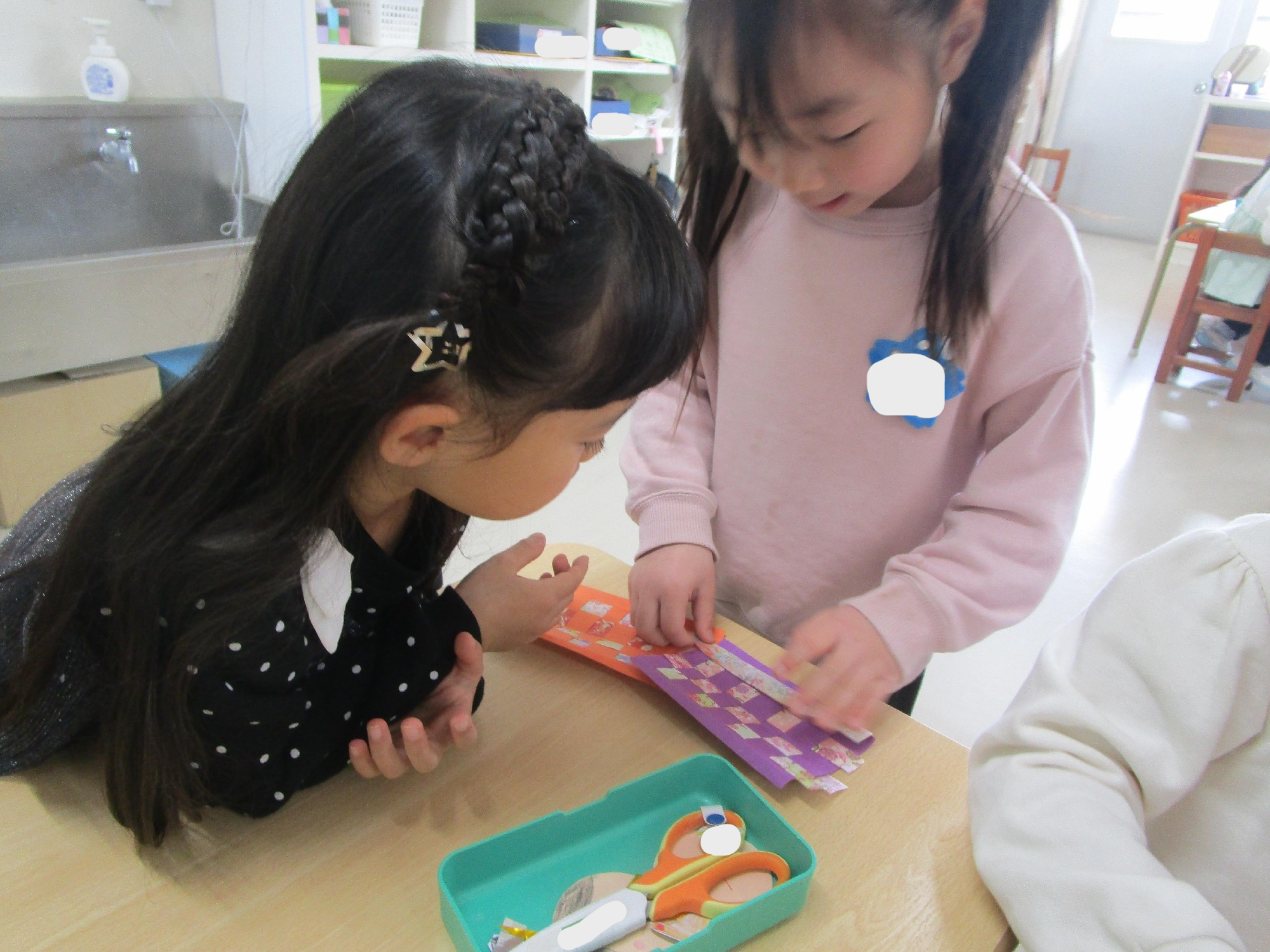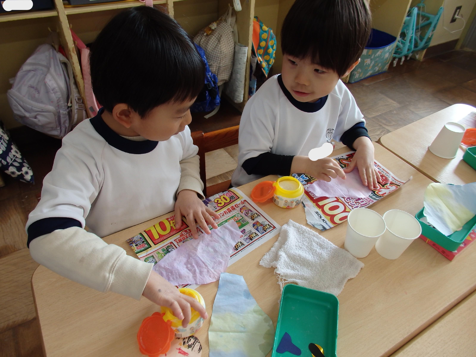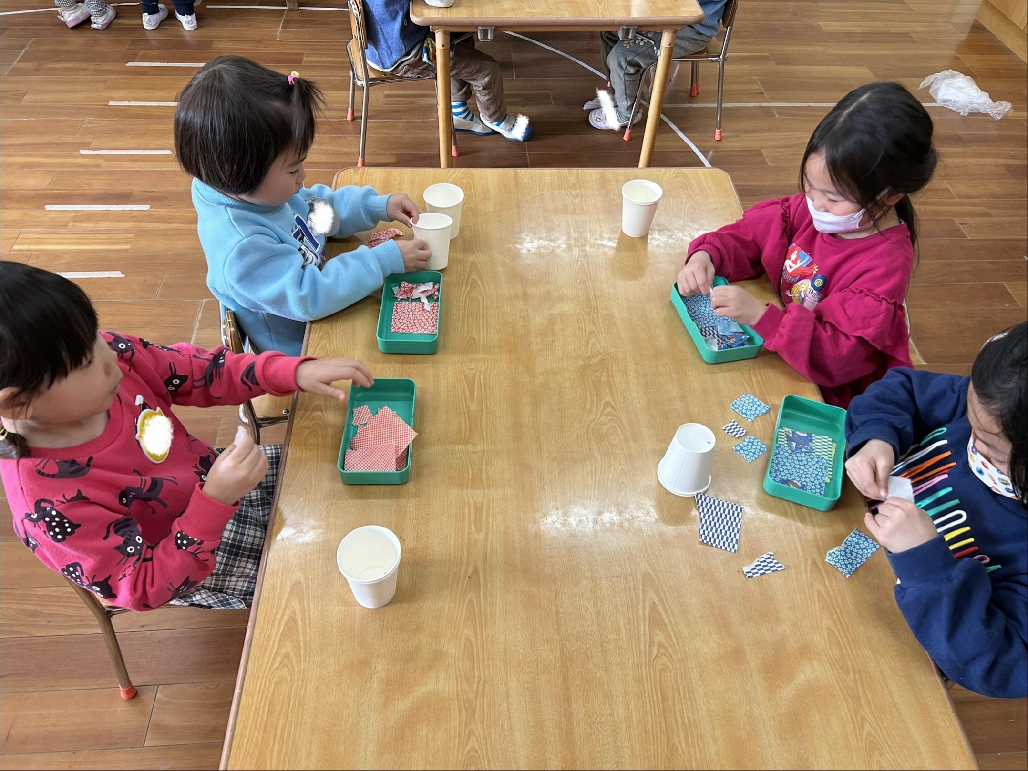 初めて扱う千代紙を、手でちぎるのに苦戦していましたが、ちぎるのにもだんだん慣れてきて楽しそうでした。