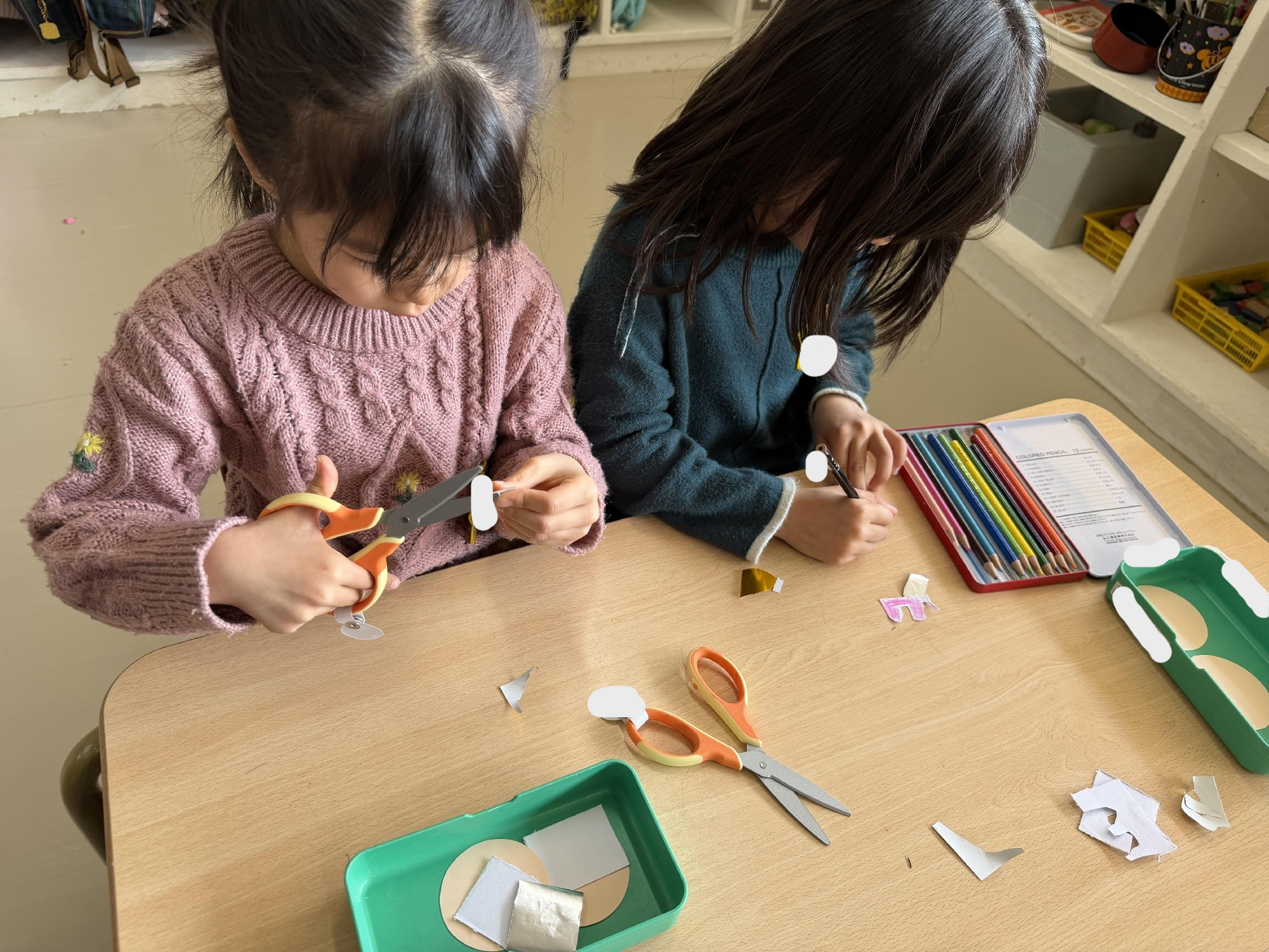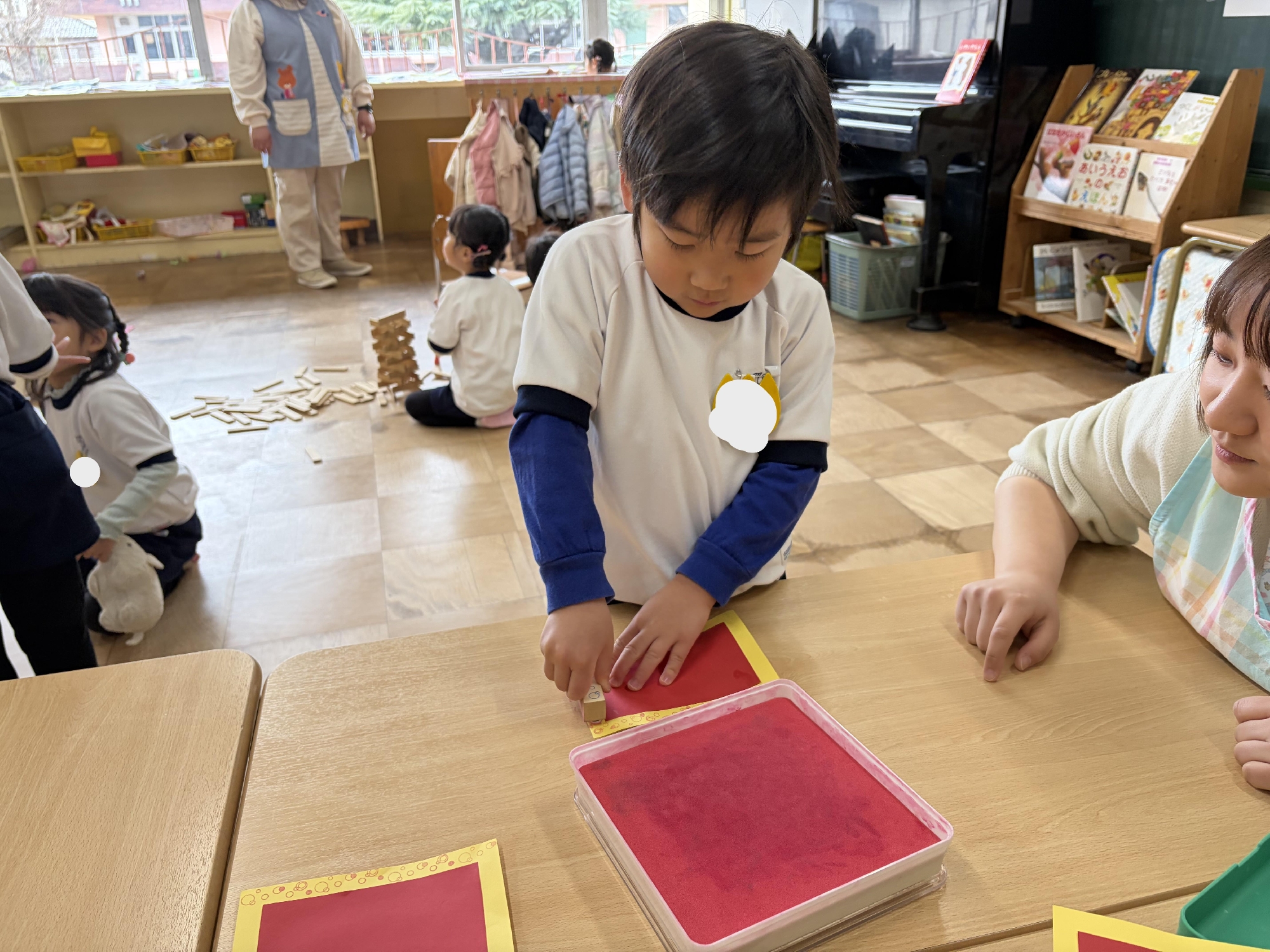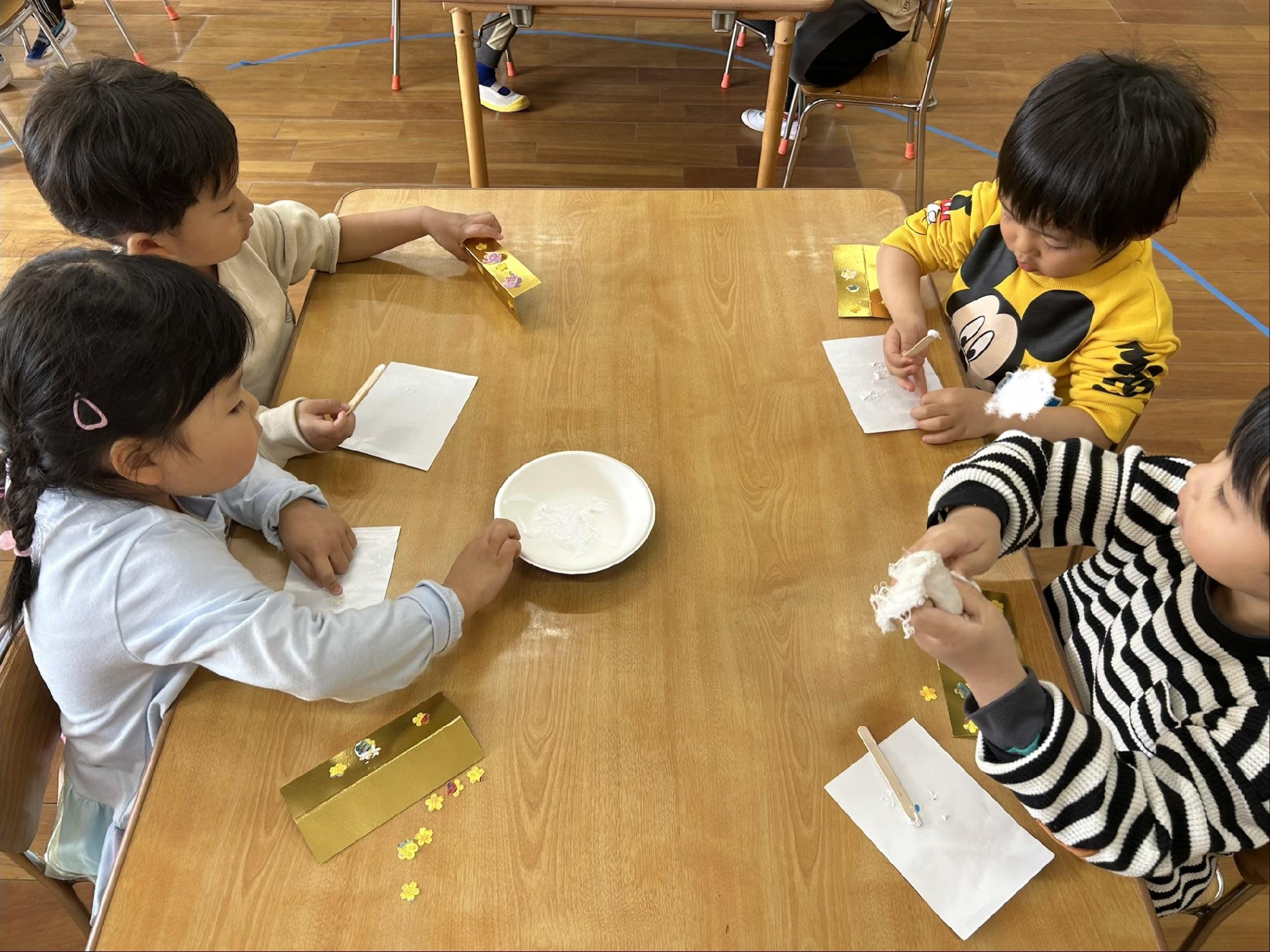 初めて扱う千代紙を、手でちぎるのに苦戦していましたが、ちぎるのにもだんだん慣れてきて楽しそうでした。